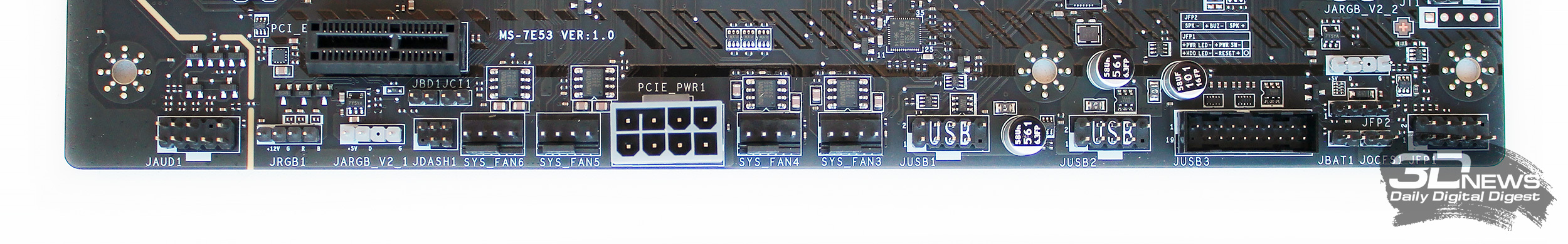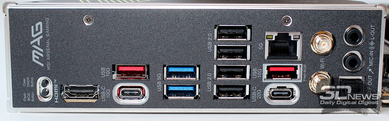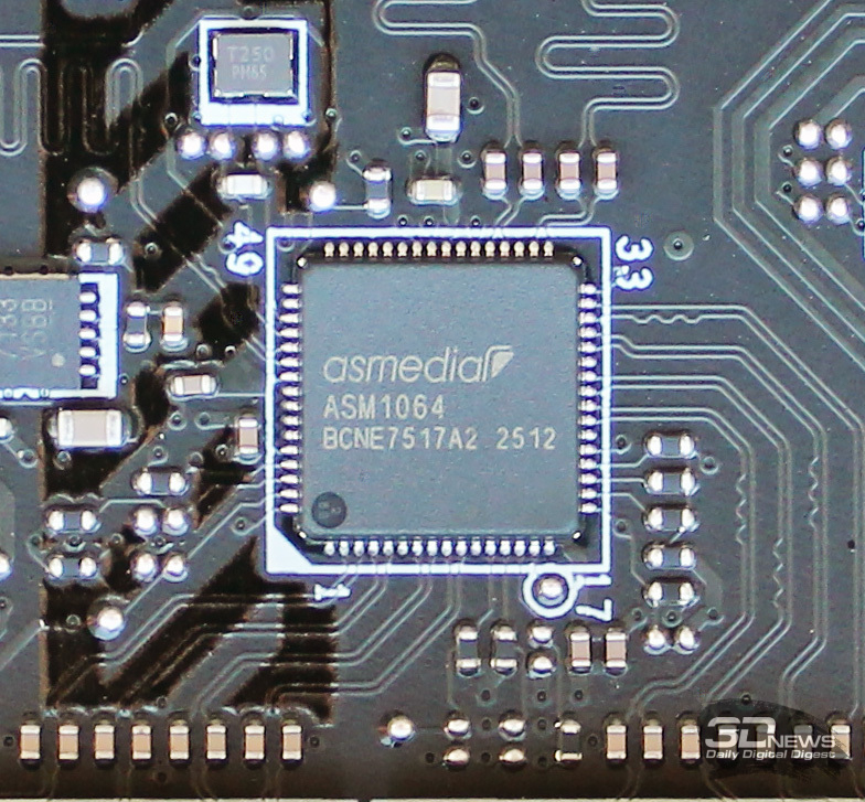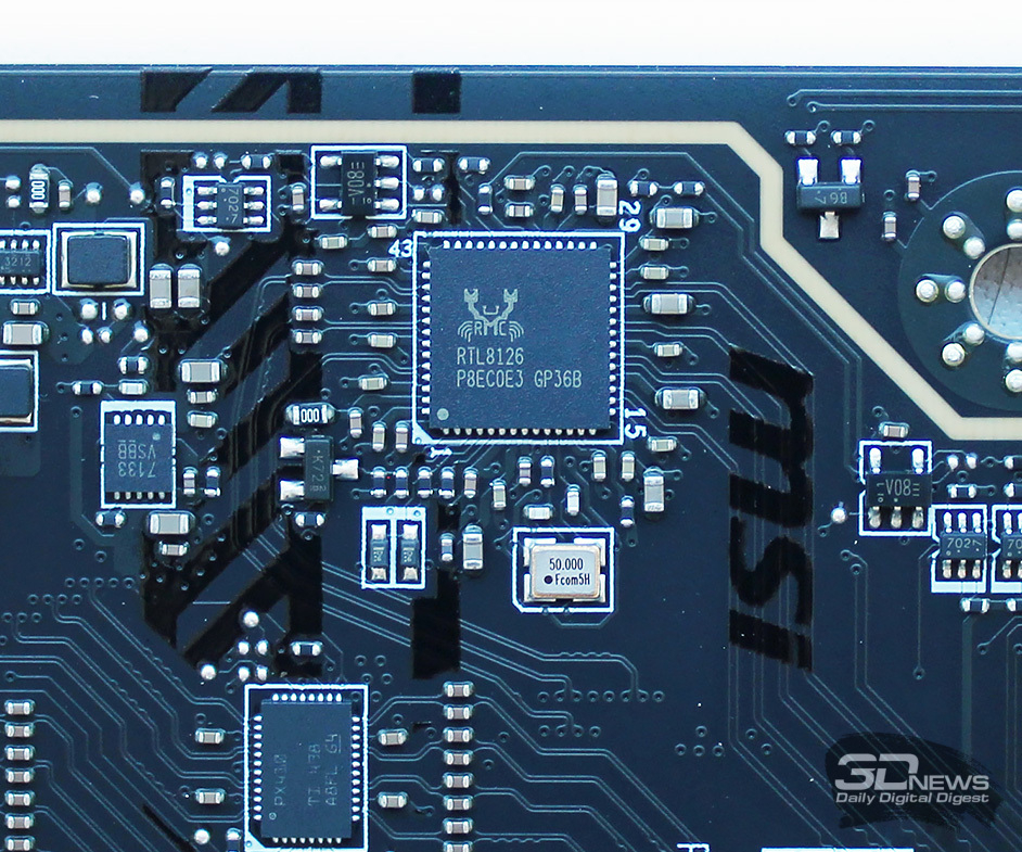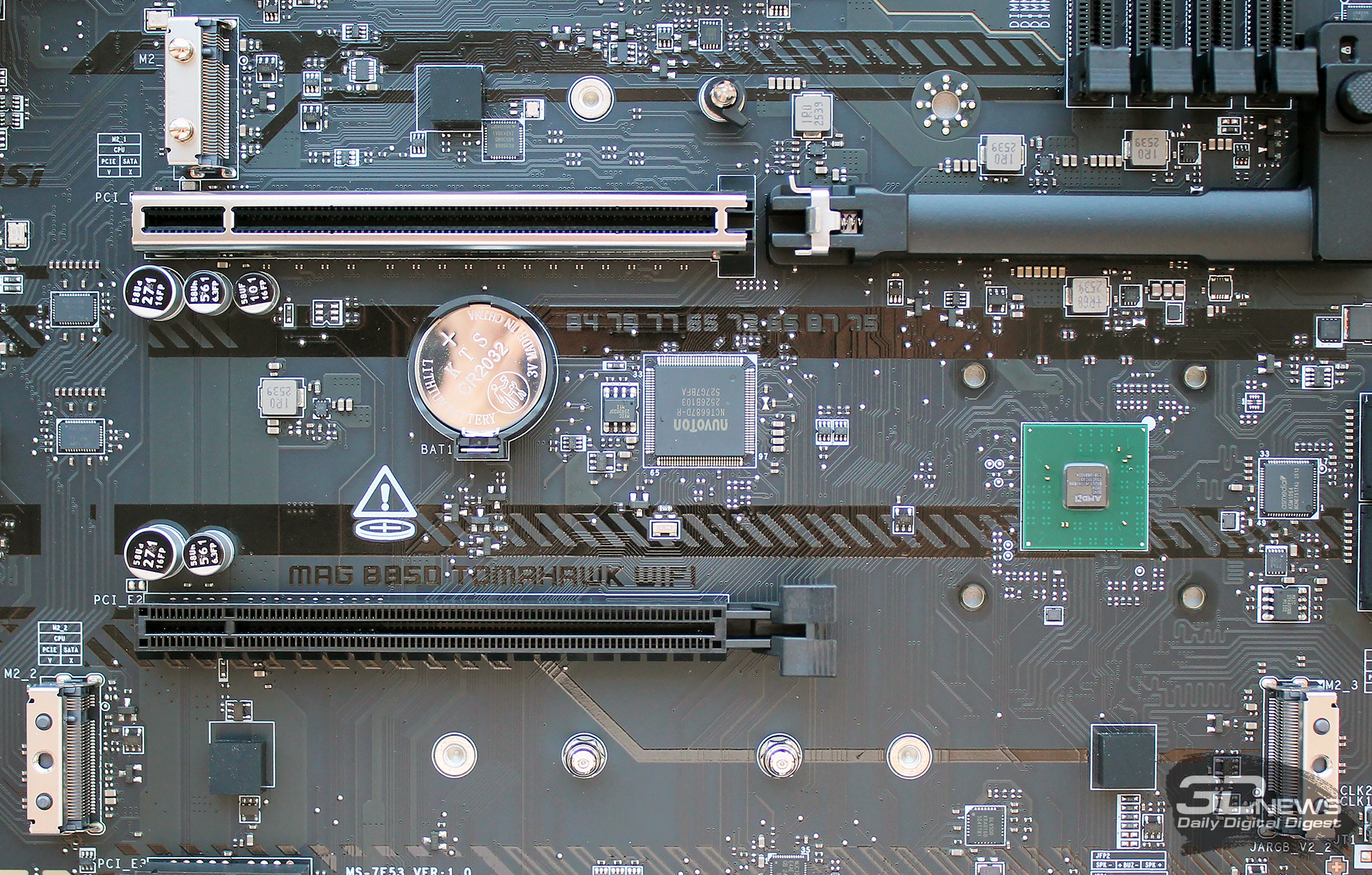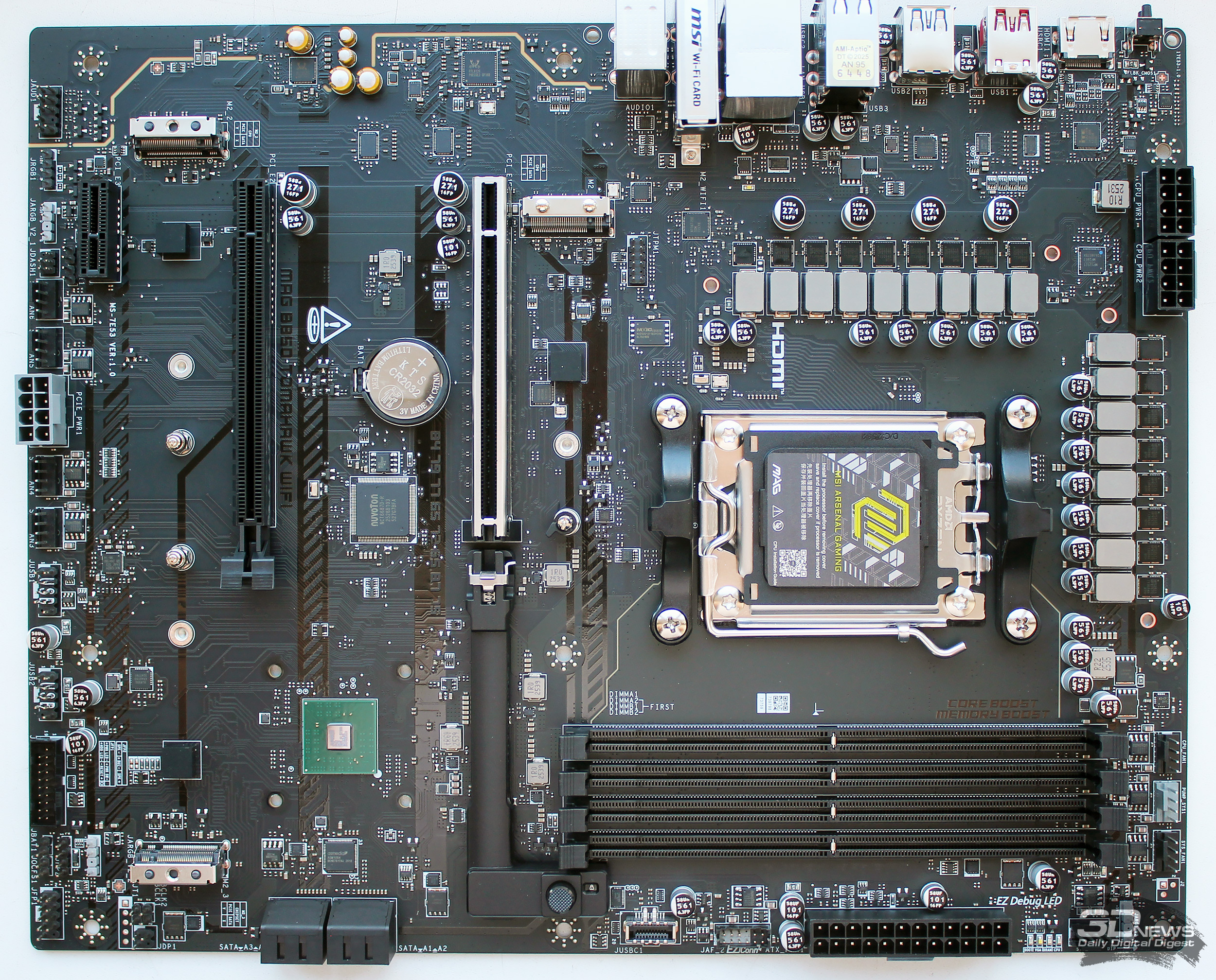 ⇡#Упаковка и комплектацияКоробка MSI MAG B850 TOMAHAWK WiFi оформлена довольно просто, особенно её лицевая сторона, где приведено только название модели, чипсет и упоминание о 64-мегабайтном BIOS. Обратная сторона коробки интереснее: по ней можно узнать особенности платы, изучить её характеристики и порты на интерфейсной панели. На торце коробки приклеен стикер с серийным номером платы, штрих-кодами, QR-кодами и указанием страны производства (разумеется, это Китай). Внутри коробки плата лежит в антистатическом пакете на специальном поддоне, а под ним находятся комплектующие. В комплект поставки платы входит один кабель SATA, антенна беспроводного модуля связи, кабель передней панели корпуса EZ, кабель EZ Conn, кабель подсветки ARGB, винты для накопителей в портах M.2 и ключик к ним, краткая инструкция с гарантией, купон MSI Shout Out и набор наклеек. А вот накопителя с драйверами и утилитами, как в старших платах, у этой модели нет. Впрочем, это не удивительно, поскольку розничная стоимость MSI MAG B850 TOMAHAWK WiFi составляет всего 23 299 рублей. При этом гарантийный срок, предоставляемый MSI на плату, равен трём годам, то есть такой же, как и на модели более дорогих серий. ⇡#Дизайн и особенностиMSI MAG B850 TOMAHAWK WiFi построена на форм-факторе ATX (244 × 305 мм) на чёрном текстолите. Выглядит плата очень приятно и не кажется перегруженной радиаторами, как многие другие модели. На радиаторах нанесены жёлтые логотипы и название модели платы с её серией. Основной радиатор цепи VRM выделяется массивностью и продольными рёбрами, увеличивающими площадь теплораспределения. Чёрная панель портов ввода-вывода интегрирована в плату и содержит «джентльменский» набор портов для любых задач. Здесь и кнопки Flash BIOS и Clear CMOS с видеовыходом HDMI версии 2.1, и десять разношёрстных портов USB, включая быстрые 20G и 10G, и сетевой порт 5G, и два коннектора SMA для антенн беспроводного модуля связи (2T2R), и два 3,5-мм аудиоразъёма, и даже редко кем используемый оптический выход. Схему расположения компонентов и портов на MSI MAG B850 TOMAHAWK WiFi мы приводим далее. После снятия радиаторов MSI MAG B850 TOMAHAWK WiFi предстаёт перед нами во всей естественной красе. В её основе лежит восьмислойный текстолит, произведённый по технологическому процессу «PCB Fabric». Он способствует повышению пропускной способности, снижению потерь сигнала, более точному контролю сопротивлений, а также повышению термостабильности при предельных нагрузках. В плане процессорного сокета конструктивного исполнения AM5 никаких особенностей нет, это штатный разъём c мощной усилительной пластиной с обратной стороны платы, выпущенный компанией Lotes. На сегодняшний день платой поддерживаются более 40 моделей процессоров AMD конструктивного исполнения Socket AM5, начиная с самого дешёвого AMD Ryzen 3 8300G до флагманского и очень дорогого Ryzen 9 9950X3D. Нет сомнений, что при выходе новых процессоров AMD этого же конструктива они также могут быть установлены в эту плату. Каскад системы питания процессора построен по схеме «14+2+1» (CPU, SoC, iGPU), где процессорные фазы и фазы SoC построены на 80-амперных сборках DrMOS MP87670 производства Monolithic Power Systems, а питание встроенной графики – на 55-амперной DrMOS AOZ5516QI производства Alpha&Omega Semiconductor. То есть плата по стоимости среднебюджетная, а процессору может выдать до 1120А! Управление питанием процессора реализовано ШИМ-контроллером MPS MP2857 производства также Monolithic Power Systems. А вот 