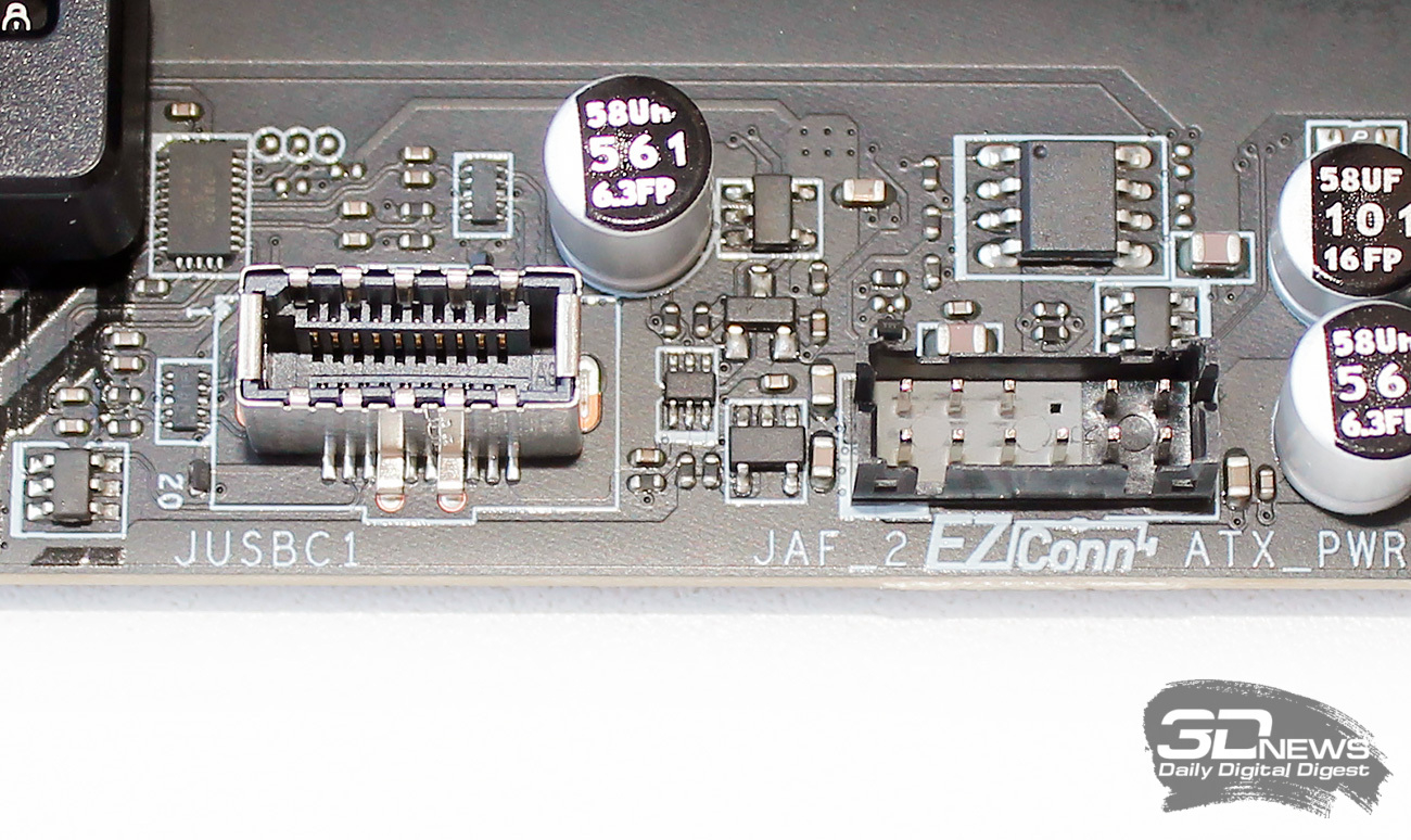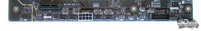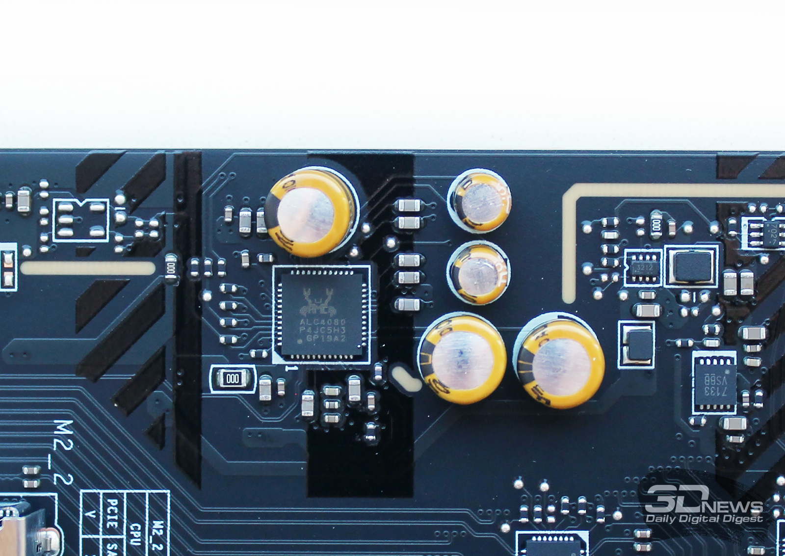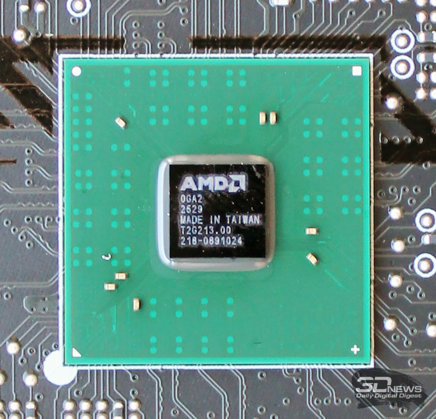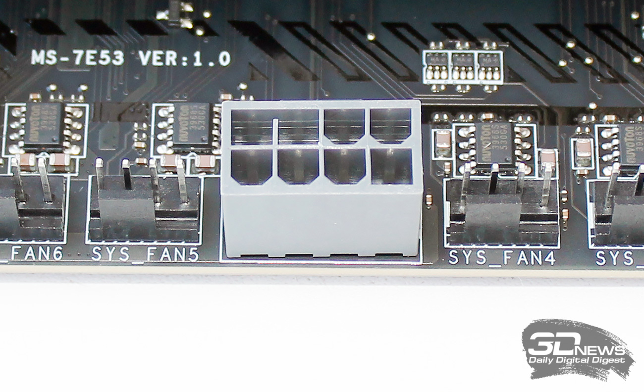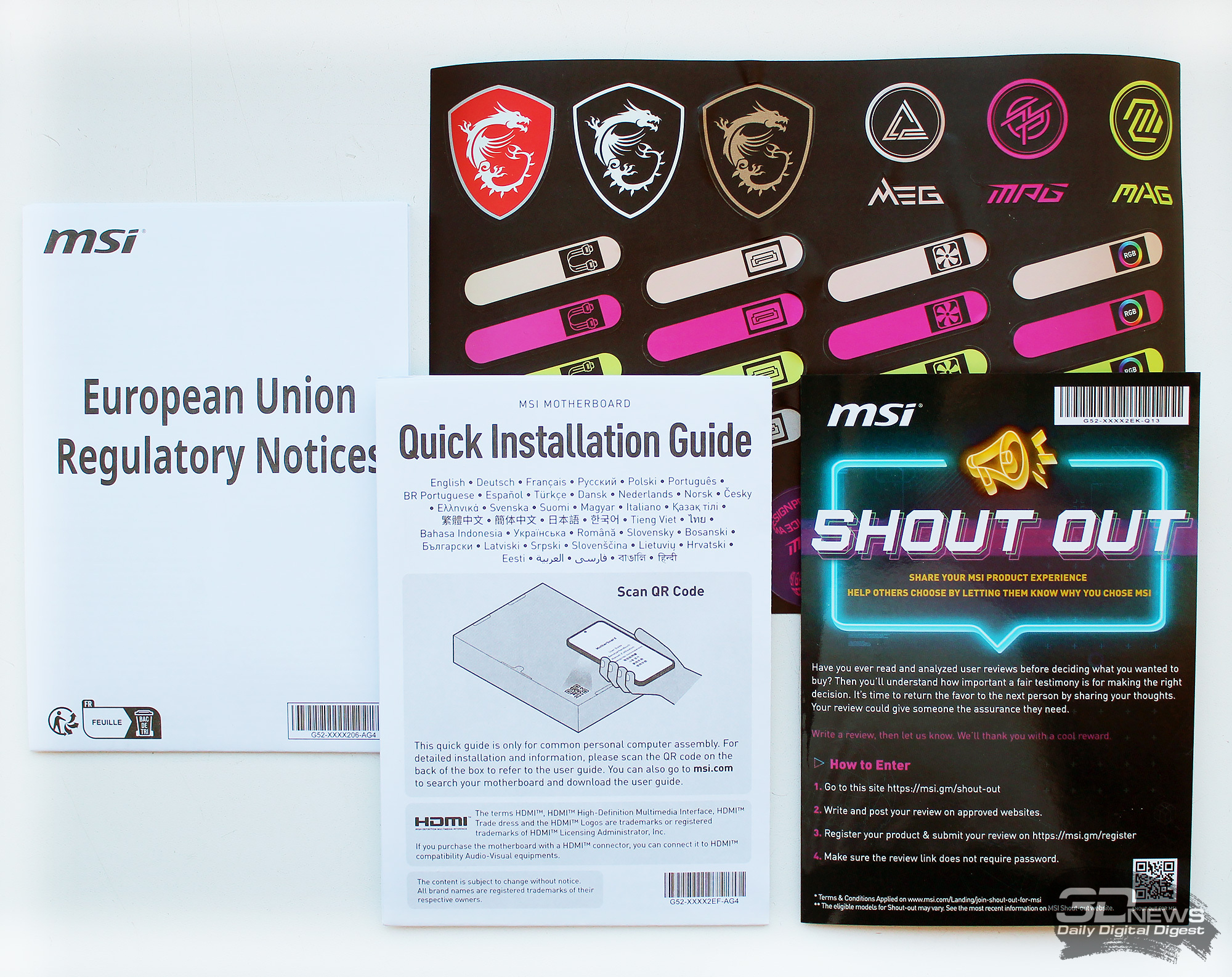 ⇡#Упаковка и комплектацияКоробка MSI MAG B850 TOMAHAWK WiFi оформлена довольно просто, особенно её лицевая сторона, где приведено только название модели, чипсет и упоминание о 64-мегабайтном BIOS. Обратная сторона коробки интереснее: по ней можно узнать особенности платы, изучить её характеристики и порты на интерфейсной панели. На торце коробки приклеен стикер с серийным номером платы, штрих-кодами, QR-кодами и указанием страны производства (разумеется, это Китай). Внутри коробки плата лежит в антистатическом пакете на специальном поддоне, а под ним находятся комплектующие. В комплект поставки платы входит один кабель SATA, антенна беспроводного модуля связи, кабель передней панели корпуса EZ, кабель EZ Conn, кабель подсветки ARGB, винты для накопителей в портах M.2 и ключик к ним, краткая инструкция с гарантией, купон MSI Shout Out и набор наклеек. А вот накопителя с драйверами и утилитами, как в старших платах, у этой модели нет. Впрочем, это не удивительно, поскольку розничная стоимость MSI MAG B850 TOMAHAWK WiFi составляет всего 23 299 рублей. При этом гарантийный срок, предоставляемый MSI на плату, равен трём годам, то есть такой же, как и на модели более дорогих серий. ⇡#Дизайн и особенностиMSI MAG B850 TOMAHAWK WiFi построена на форм-факторе ATX (244 × 305 мм) на чёрном текстолите. Выглядит плата очень приятно и не кажется перегруженной радиаторами, как многие другие модели. На радиаторах нанесены жёлтые логотипы и название модели платы с её серией. Основной радиатор цепи VRM выделяется массивностью и продольными рёбрами, увеличивающими площадь теплораспределения. Чёрная панель портов ввода-вывода интегрирована в плату и содержит «джентльменский» набор портов для любых задач. Здесь и кнопки Flash BIOS и Clear CMOS с видеовыходом HDMI версии 2.1, и десять разношёрстных портов USB, включая быстрые 20G и 10G, и сетевой порт 5G, и два коннектора SMA для антенн беспроводного модуля связи (2T2R), и два 3,5-мм аудиоразъёма, и даже редко кем используемый оптический выход. Схему расположения компонентов и портов на MSI MAG B850 TOMAHAWK WiFi мы приводим далее. После снятия радиаторов MSI MAG B850 TOMAHAWK WiFi предстаёт перед нами во всей естественной красе. В её основе лежит восьмислойный текстолит, произведённый по технологическому процессу «PCB Fabric». Он способствует повышению пропускной способности, снижению потерь сигнала, более точному контролю сопротивлений, а также повышению термостабильности при предельных нагрузках. В плане процессорного сокета конструктивного исполнения AM5 никаких особенностей нет, это штатный разъём c мощной усилительной пластиной с обратной стороны платы, выпущенный компанией Lotes. На сегодняшний день платой поддерживаются более 40 моделей процессоров AMD конструктивного исполнения Socket AM5, начиная с самого дешёвого AMD Ryzen 3 8300G до флагманского и очень дорогого Ryzen 9 9950X3D. Нет сомнений, что при выходе новых процессоров AMD этого же конструктива они также могут быть установлены в эту плату. Каскад системы питания процессора построен по схеме «14+2+1» (CPU, SoC, iGPU), где процессорные фазы и фазы SoC построены на 80-амперных сборках DrMOS MP87670 производства Monolithic Power Systems, а питание встроенной графики – на 55-амперной DrMOS AOZ5516QI производства Alpha&Omega Semiconductor. То есть плата по стоимости среднебюджетная, а процессору может выдать до 1120А! Управление питанием процессора реализовано ШИМ-контроллером MPS MP2857 производства также Monolithic Power Systems. А вот 