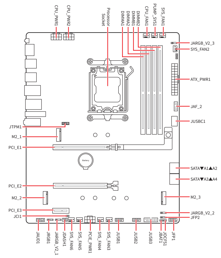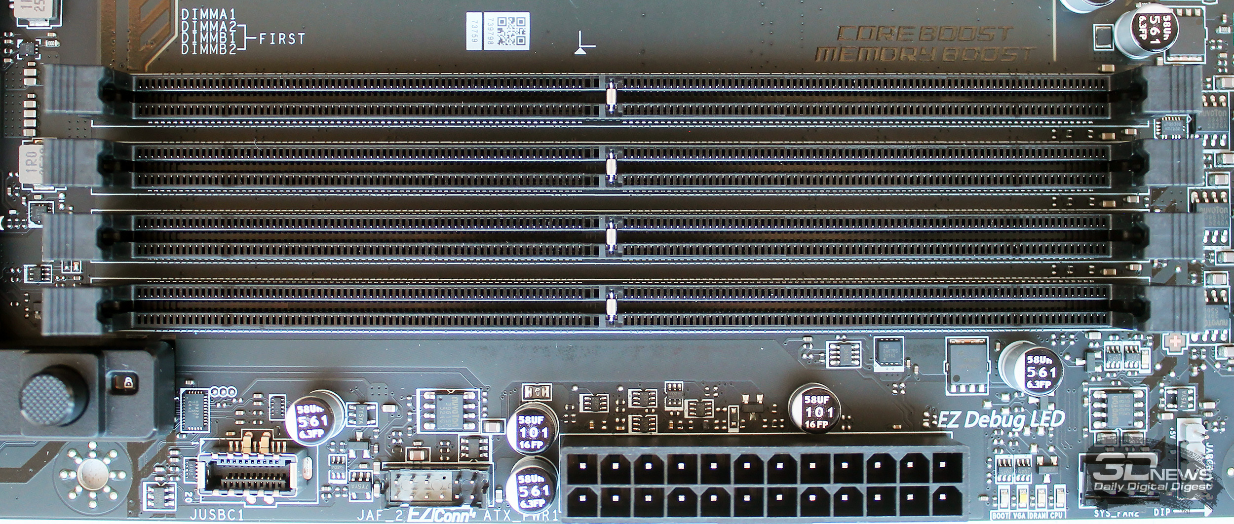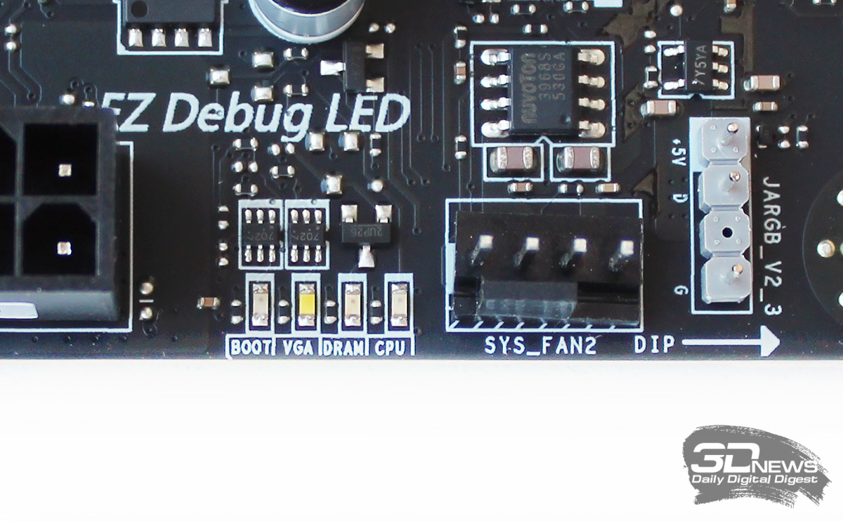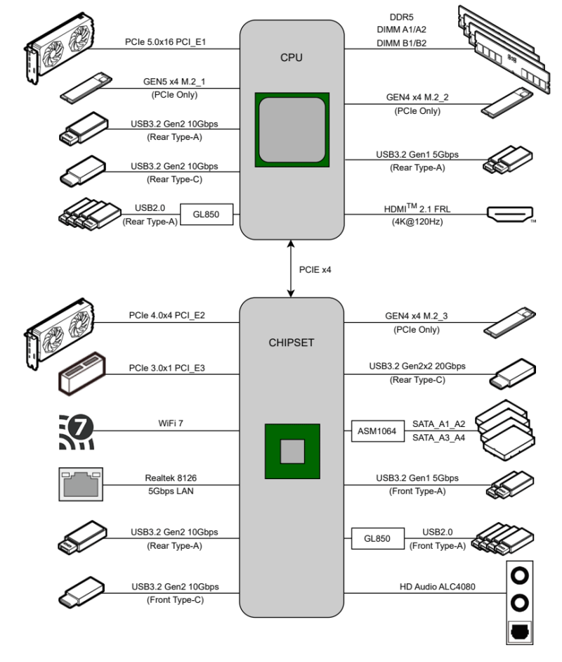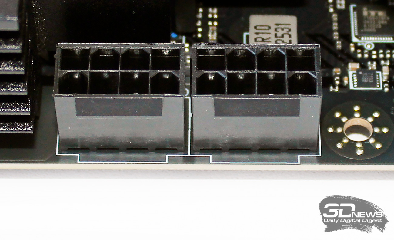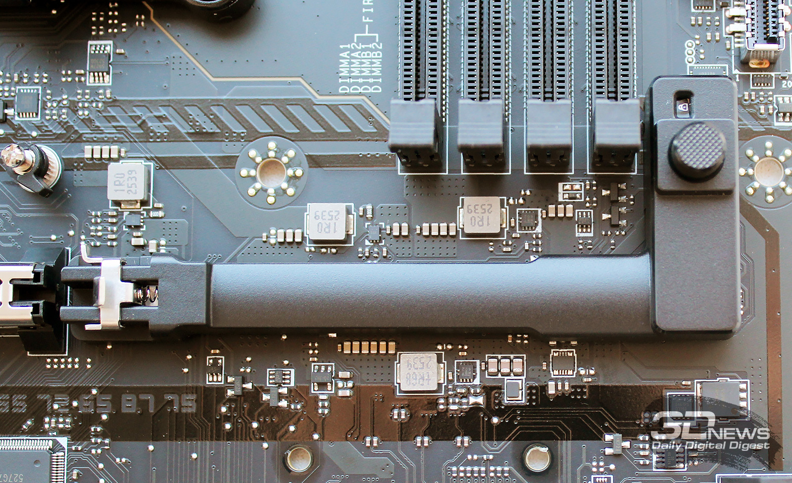 ⇡#Упаковка и комплектацияКоробка MSI MAG B850 TOMAHAWK WiFi оформлена довольно просто, особенно её лицевая сторона, где приведено только название модели, чипсет и упоминание о 64-мегабайтном BIOS. Обратная сторона коробки интереснее: по ней можно узнать особенности платы, изучить её характеристики и порты на интерфейсной панели. На торце коробки приклеен стикер с серийным номером платы, штрих-кодами, QR-кодами и указанием страны производства (разумеется, это Китай). Внутри коробки плата лежит в антистатическом пакете на специальном поддоне, а под ним находятся комплектующие. В комплект поставки платы входит один кабель SATA, антенна беспроводного модуля связи, кабель передней панели корпуса EZ, кабель EZ Conn, кабель подсветки ARGB, винты для накопителей в портах M.2 и ключик к ним, краткая инструкция с гарантией, купон MSI Shout Out и набор наклеек. А вот накопителя с драйверами и утилитами, как в старших платах, у этой модели нет. Впрочем, это не удивительно, поскольку розничная стоимость MSI MAG B850 TOMAHAWK WiFi составляет всего 23 299 рублей. При этом гарантийный срок, предоставляемый MSI на плату, равен трём годам, то есть такой же, как и на модели более дорогих серий. ⇡#Дизайн и особенностиMSI MAG B850 TOMAHAWK WiFi построена на форм-факторе ATX (244 × 305 мм) на чёрном текстолите. Выглядит плата очень приятно и не кажется перегруженной радиаторами, как многие другие модели. На радиаторах нанесены жёлтые логотипы и название модели платы с её серией. Основной радиатор цепи VRM выделяется массивностью и продольными рёбрами, увеличивающими площадь теплораспределения. Чёрная панель портов ввода-вывода интегрирована в плату и содержит «джентльменский» набор портов для любых задач. Здесь и кнопки Flash BIOS и Clear CMOS с видеовыходом HDMI версии 2.1, и десять разношёрстных портов USB, включая быстрые 20G и 10G, и сетевой порт 5G, и два коннектора SMA для антенн беспроводного модуля связи (2T2R), и два 3,5-мм аудиоразъёма, и даже редко кем используемый оптический выход. Схему расположения компонентов и портов на MSI MAG B850 TOMAHAWK WiFi мы приводим далее. После снятия радиаторов MSI MAG B850 TOMAHAWK WiFi предстаёт перед нами во всей естественной красе. В её основе лежит восьмислойный текстолит, произведённый по технологическому процессу «PCB Fabric». Он способствует повышению пропускной способности, снижению потерь сигнала, более точному контролю сопротивлений, а также повышению термостабильности при предельных нагрузках. В плане процессорного сокета конструктивного исполнения AM5 никаких особенностей нет, это штатный разъём c мощной усилительной пластиной с обратной стороны платы, выпущенный компанией Lotes. На сегодняшний день платой поддерживаются более 40 моделей процессоров AMD конструктивного исполнения Socket AM5, начиная с самого дешёвого AMD Ryzen 3 8300G до флагманского и очень дорогого Ryzen 9 9950X3D. Нет сомнений, что при выходе новых процессоров AMD этого же конструктива они также могут быть установлены в эту плату. Каскад системы питания процессора построен по схеме «14+2+1» (CPU, SoC, iGPU), где процессорные фазы и фазы SoC построены на 80-амперных сборках DrMOS MP87670 производства Monolithic Power Systems, а питание встроенной графики – на 55-амперной DrMOS AOZ5516QI производства Alpha&Omega Semiconductor. То есть плата по стоимости среднебюджетная, а процессору может выдать до 1120А! Управление питанием процессора реализовано ШИМ-контроллером MPS MP2857 производства также Monolithic Power Systems. А вот 