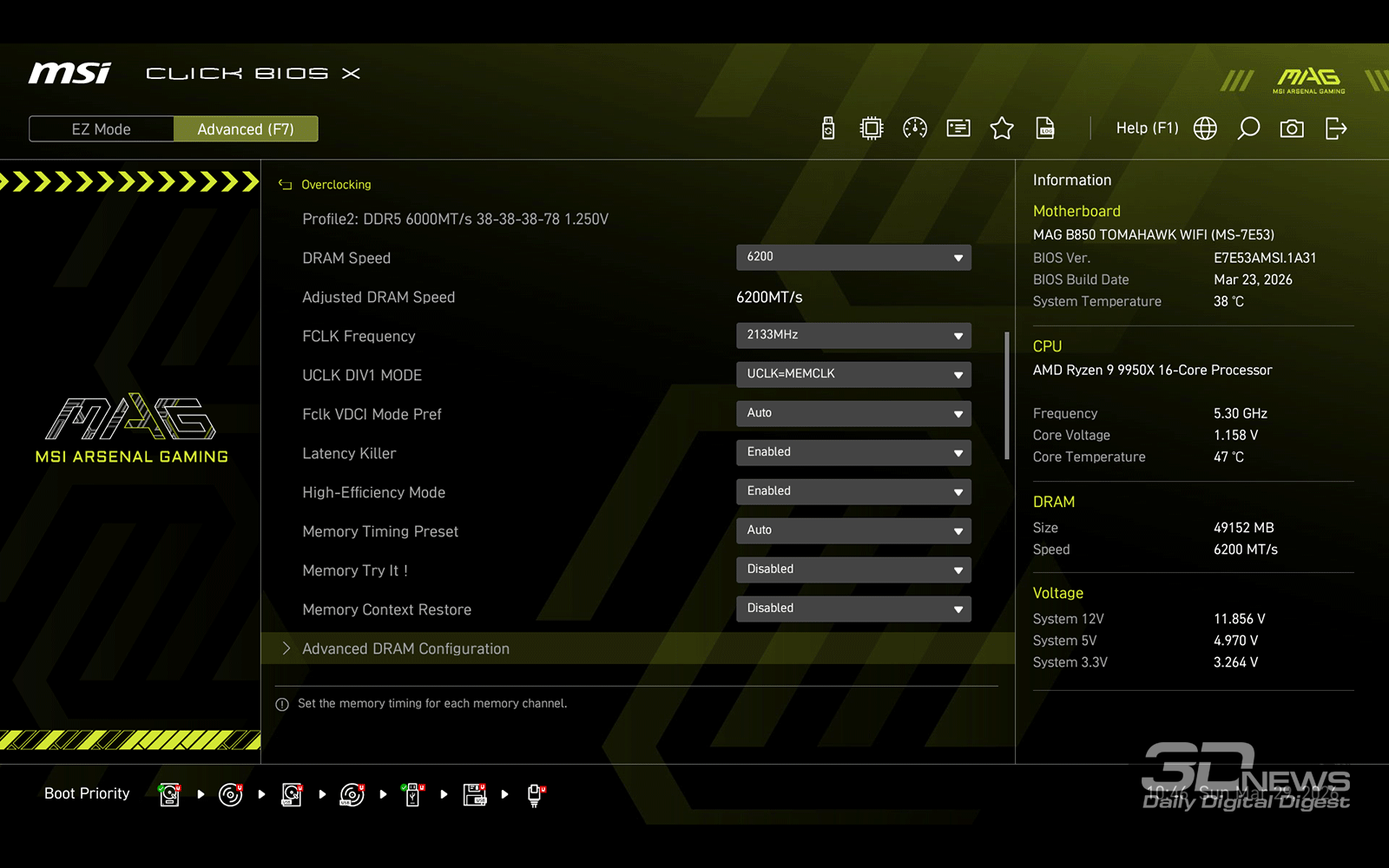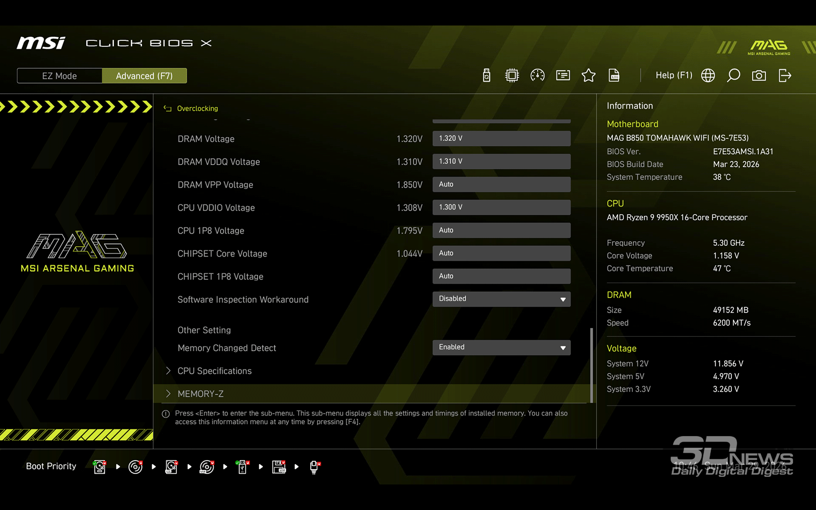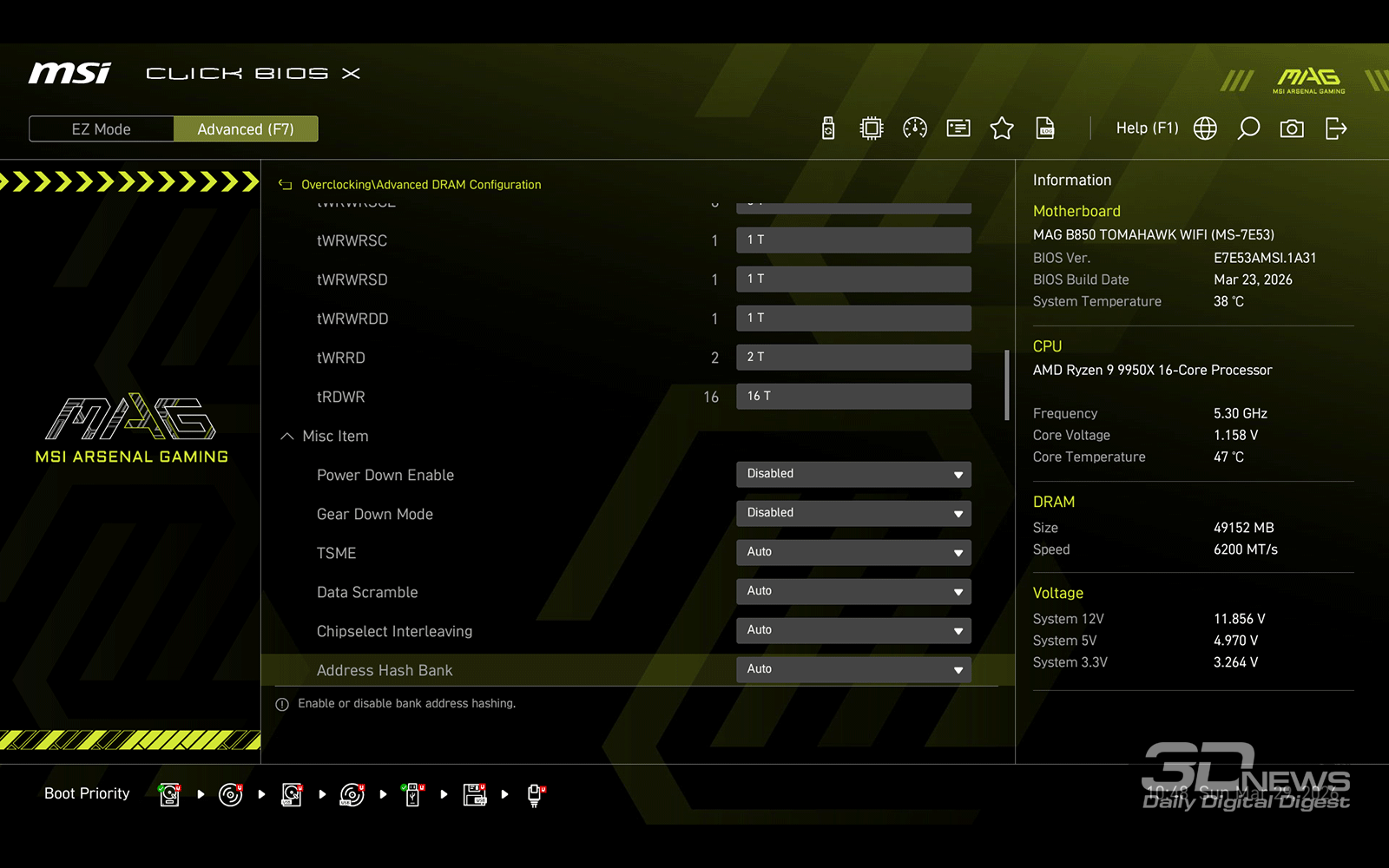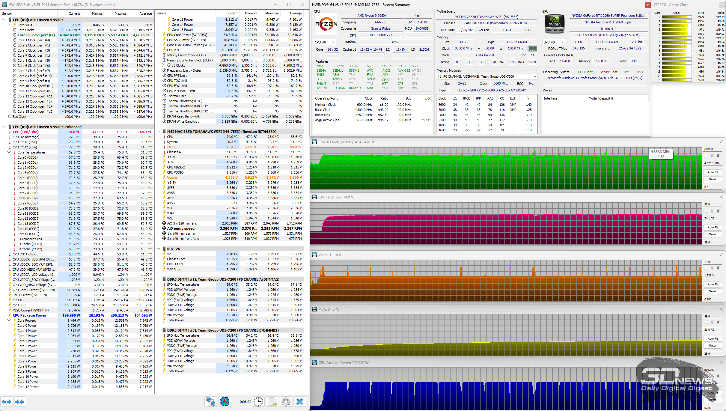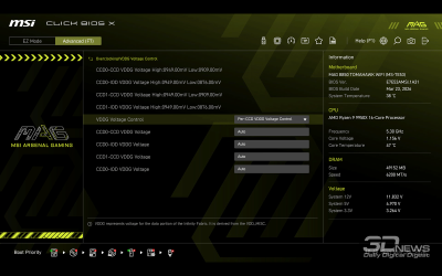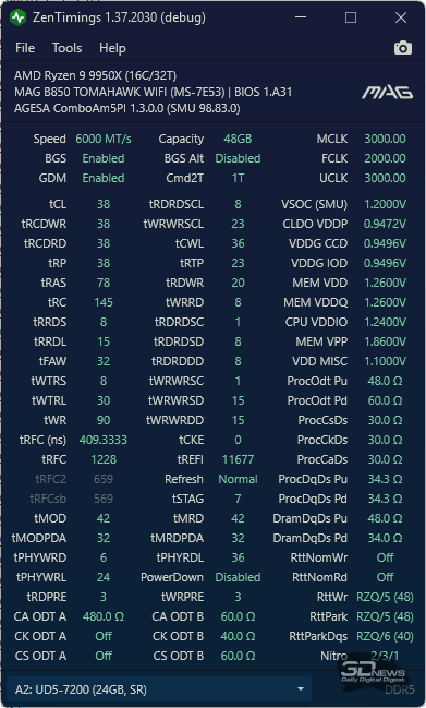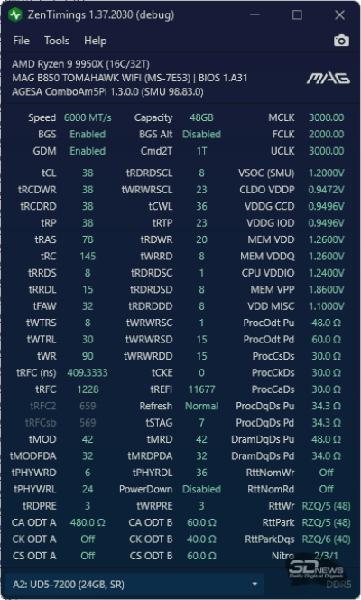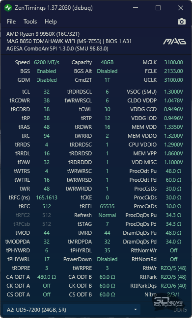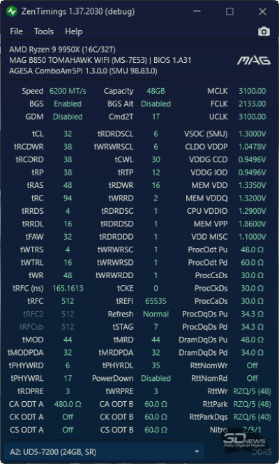 Стабильность системы мы проверяли стресс-тестом из бенчмарка рендеринга Cinebench R23 и другими утилитами, а мониторинг проводился с помощью HWiNFO64 версии 8.45-5945. Основные характеристики MSI MAG B850 TOMAHAWK WiFi приведены из утилиты HWiNFO64. Первый запуск и тест MSI MAG B850 TOMAHAWK WiFi был проведён при автоматических настройках BIOS, но с активированным XMP2 оперативной памяти. Плата корректно выставила частоту памяти (6 ГГц) и первичные тайминги (38-38-38-78_1T), а вот с остальными пользователю придётся повозиться самому, чтобы повысить производительность. Стресс-тест 16-ядерного AMD Ryzen 9 9950X на MSI MAG B850 TOMAHAWK WiFi был пройден с такими показателями мониторинга. Настройки BIOS по-умолчанию В принципе всё довольно неплохо: процессор разгонялся до 5,54 ГГц, а под нагрузкой работал на 4,84 ГГц по CCD1 и 4,54 ГГц по CCD2. Напряжение на ядре повышалось вплоть до 1,372 В, но этим на автомате грешат все платы (и мы имеем ввиду не только убрать AMD). Температура процессора повышалась до 75 градусов Цельсия, а температуры VRM цепей лишь до 51 градуса Цельсия, что особенно приятно видеть после тестирования компактной MSI MPG X870I Edge Ti Evo WiFi. Зная пределы тестового процессора, мы сразу же выставили его частоту по всем ядрам на 5,2 ГГц, зафиксировали LLC на третьем уровне и подбирали минимально возможное напряжение. Последнее оказалось равно 1,090 В. После этого были получены следующие показатели мониторинга при прохождении стресс-теста. На фиксированной частоте 5,2 ГГц температура процессора повышалась только до 80 градусов Цельсия, VRM – до 53,5 градуса, а потребление процессора достигало отметки 221 ватт. Отличные показатели, придраться не к чему и запас по температурам ещё приличный. Поэтому мы выставили частоту ядер CPU на отметке 5,3 ГГц и снова подбирали минимальное напряжение. Для такой частоты оно оказалось равно 1,155 В, что заметно ниже, чем при автоматических настройках BIOS. Тепловыделение AMD Ryzen 9 9950X выросло до 255 ватт, а температура процессора под 360-мм СЖО до 91,1 градуса Цельсия. Отметим, что цепи VRM материнской платы даже при такой серьёзной нагрузке охлаждаются отлично, поскольку их температура повысилась только до 58,5 градуса Цельсия. Тем не менее резервы по разгону этого экземпляра процессора уже исчерпаны, поэтому дальше внимание было уделено настройке оперативной памяти, благо для этого у MSI MAG B850 TOMAHAWK WiFi есть отличный арсенал возможностей. После нескольких часов тестов на частоте DDR5 6,2 ГГц при повышении FCLK до 2,133 ГГц первичные тайминги комплекта Team Group T-Create Expert (CTCED548G7200HC34ADC01) были настроены в значениях 32-38-38-48_1T, а также выставлены правильные значения вторичных и третичных таймингов, которые вы можете увидеть на скриншоте ниже. Стабильность тестировалась утилитой TestMem5 v0.13 с пресетом «1usmus v3» (без фанатизма) и бенчмарками типа 7-Zip и blender. Показанный выше результат был получен при напряжениях VDD/VDDQ 1,320/1,310 В, с последующим снижением VDDIO с 1,350 до 1,300 В, а также VSOC с 1,300 до 1,190 В. В итоге в финальном стресс-тесте процессора с настроенной памятью температура снизилась на 1 градус Цельсия. В завершение тестового блока приведём результаты пяти бенчмарков при автоматических настройках BIOS, при фиксации частоты процессора на 5,3 ГГц без настройки памяти и, наконец, на такой же частоте процессора, но уже с настроенной «оперативкой». Как видим, прирост зафиксирован почти везде, да и, судя по последней графе, пренебрегать настройкой тайминго
