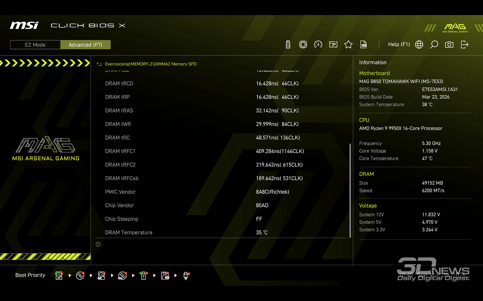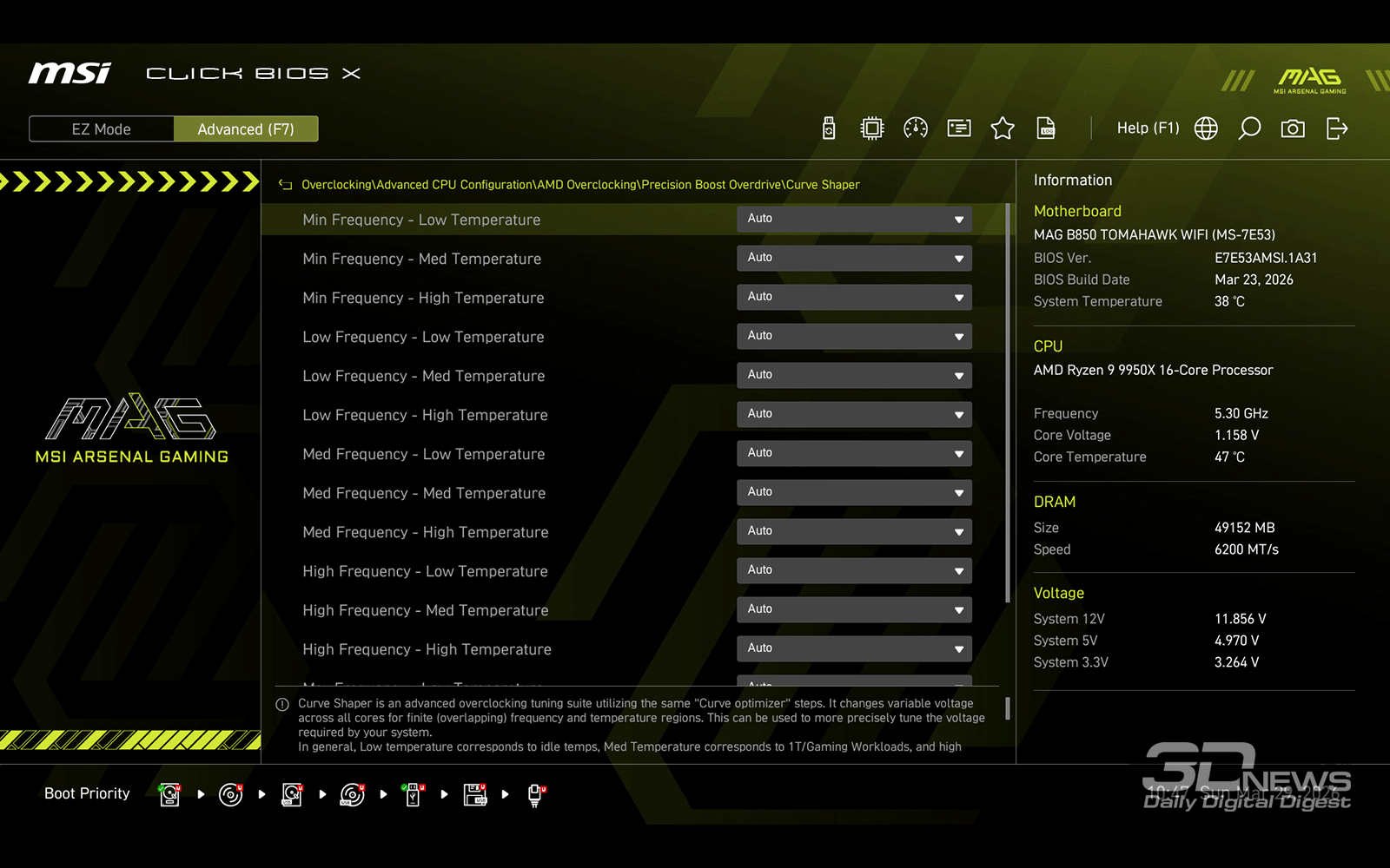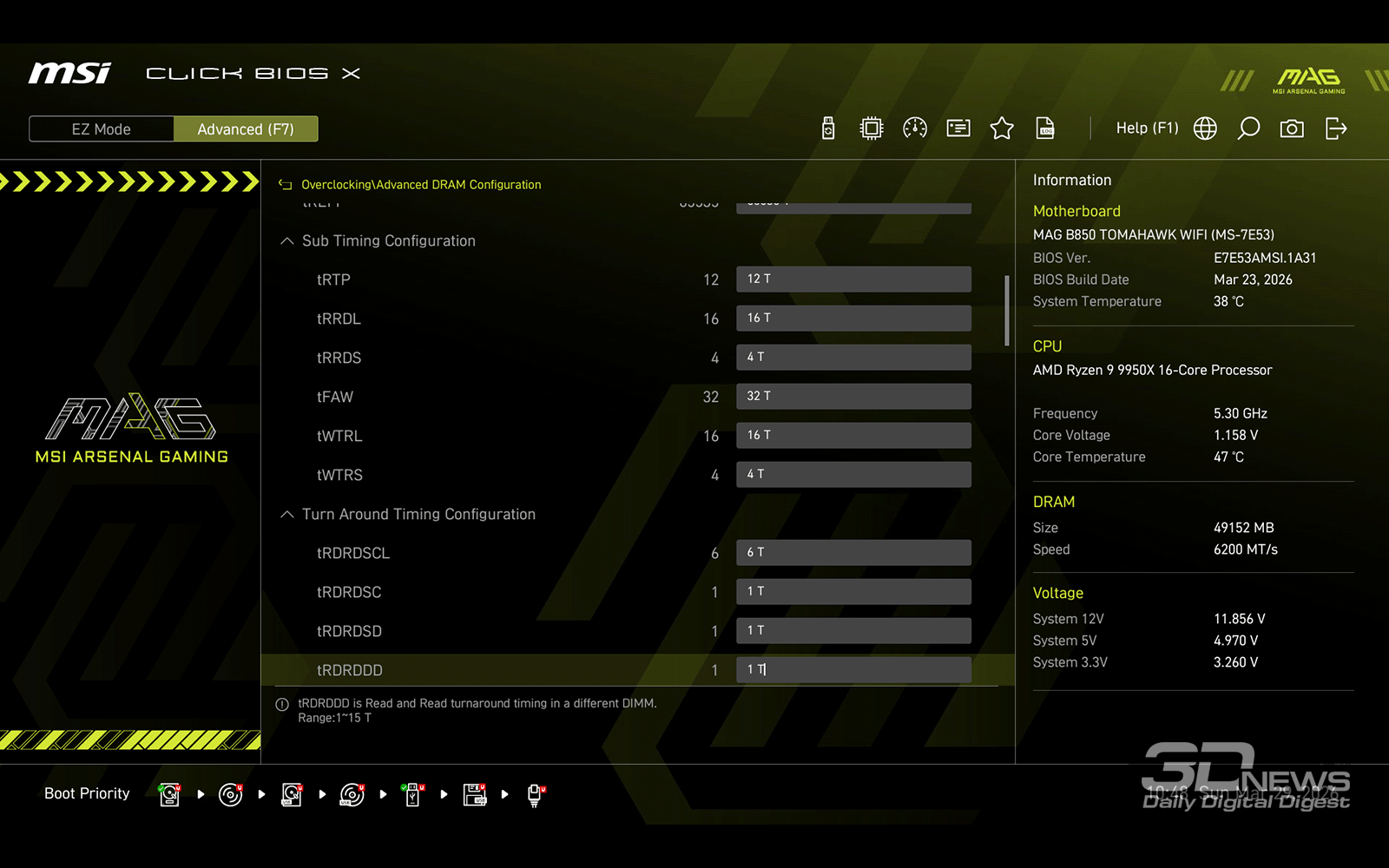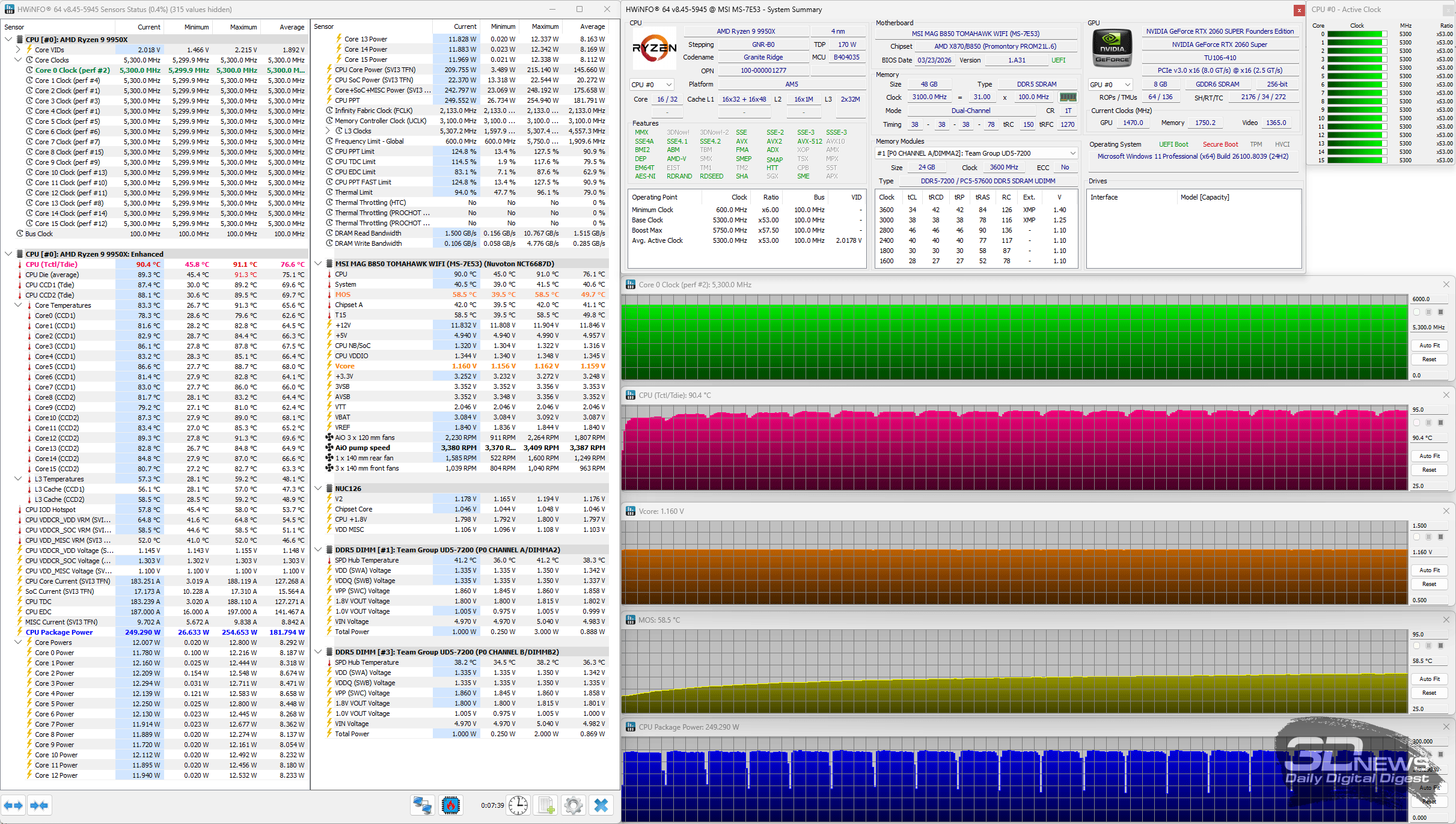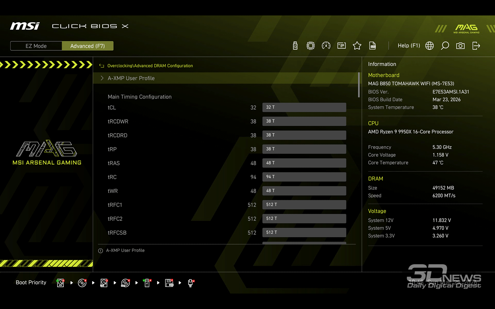 Стабильность системы мы проверяли стресс-тестом из бенчмарка рендеринга Cinebench R23 и другими утилитами, а мониторинг проводился с помощью HWiNFO64 версии 8.45-5945. Основные характеристики MSI MAG B850 TOMAHAWK WiFi приведены из утилиты HWiNFO64. Первый запуск и тест MSI MAG B850 TOMAHAWK WiFi был проведён при автоматических настройках BIOS, но с активированным XMP2 оперативной памяти. Плата корректно выставила частоту памяти (6 ГГц) и первичные тайминги (38-38-38-78_1T), а вот с остальными пользователю придётся повозиться самому, чтобы повысить производительность. Стресс-тест 16-ядерного AMD Ryzen 9 9950X на MSI MAG B850 TOMAHAWK WiFi был пройден с такими показателями мониторинга. Настройки BIOS по-умолчанию В принципе всё довольно неплохо: процессор разгонялся до 5,54 ГГц, а под нагрузкой работал на 4,84 ГГц по CCD1 и 4,54 ГГц по CCD2. Напряжение на ядре повышалось вплоть до 1,372 В, но этим на автомате грешат все платы (и мы имеем ввиду не только убрать AMD). Температура процессора повышалась до 75 градусов Цельсия, а температуры VRM цепей лишь до 51 градуса Цельсия, что особенно приятно видеть после тестирования компактной MSI MPG X870I Edge Ti Evo WiFi. Зная пределы тестового процессора, мы сразу же выставили его частоту по всем ядрам на 5,2 ГГц, зафиксировали LLC на третьем уровне и подбирали минимально возможное напряжение. Последнее оказалось равно 1,090 В. После этого были получены следующие показатели мониторинга при прохождении стресс-теста. На фиксированной частоте 5,2 ГГц температура процессора повышалась только до 80 градусов Цельсия, VRM – до 53,5 градуса, а потребление процессора достигало отметки 221 ватт. Отличные показатели, придраться не к чему и запас по температурам ещё приличный. Поэтому мы выставили частоту ядер CPU на отметке 5,3 ГГц и снова подбирали минимальное напряжение. Для такой частоты оно оказалось равно 1,155 В, что заметно ниже, чем при автоматических настройках BIOS. Тепловыделение AMD Ryzen 9 9950X выросло до 255 ватт, а температура процессора под 360-мм СЖО до 91,1 градуса Цельсия. Отметим, что цепи VRM материнской платы даже при такой серьёзной нагрузке охлаждаются отлично, поскольку их температура повысилась только до 58,5 градуса Цельсия. Тем не менее резервы по разгону этого экземпляра процессора уже исчерпаны, поэтому дальше внимание было уделено настройке оперативной памяти, благо для этого у MSI MAG B850 TOMAHAWK WiFi есть отличный арсенал возможностей. После нескольких часов тестов на частоте DDR5 6,2 ГГц при повышении FCLK до 2,133 ГГц первичные тайминги комплекта Team Group T-Create Expert (CTCED548G7200HC34ADC01) были настроены в значениях 32-38-38-48_1T, а также выставлены правильные значения вторичных и третичных таймингов, которые вы можете увидеть на скриншоте ниже. Стабильность тестировалась утилитой TestMem5 v0.13 с пресетом «1usmus v3» (без фанатизма) и бенчмарками типа 7-Zip и blender. Показанный выше результат был получен при напряжениях VDD/VDDQ 1,320/1,310 В, с последующим снижением VDDIO с 1,350 до 1,300 В, а также VSOC с 1,300 до 1,190 В. В итоге в финальном стресс-тесте процессора с настроенной памятью температура снизилась на 1 градус Цельсия. В завершение тестового блока приведём результаты пяти бенчмарков при автоматических настройках BIOS, при фиксации частоты процессора на 5,3 ГГц без настройки памяти и, наконец, на такой же частоте процессора, но уже с настроенной «оперативкой». Как видим, прирост зафиксирован почти везде, да и, судя по последней графе, пренебрегать настройкой тайминго
