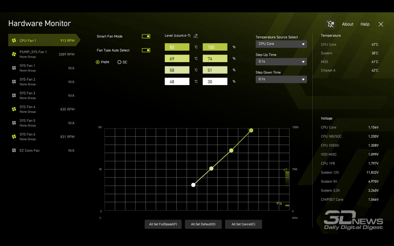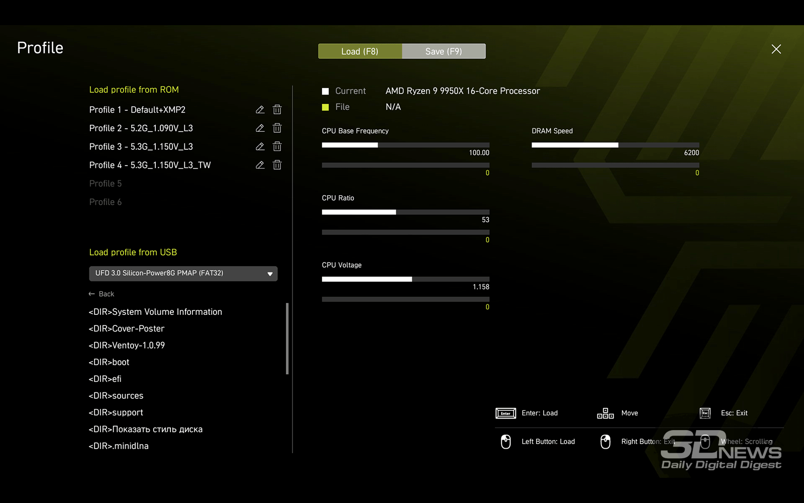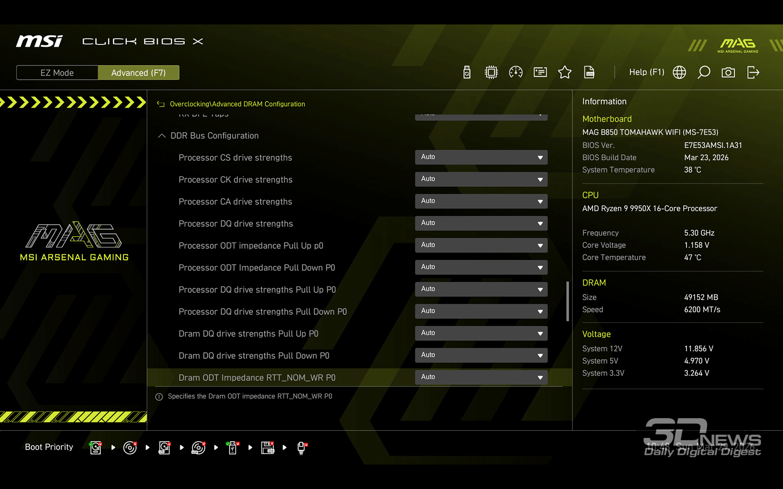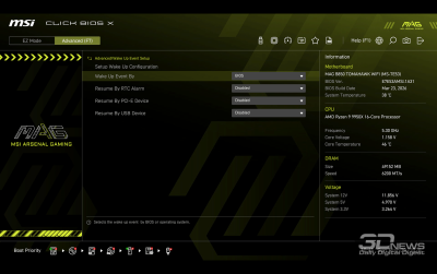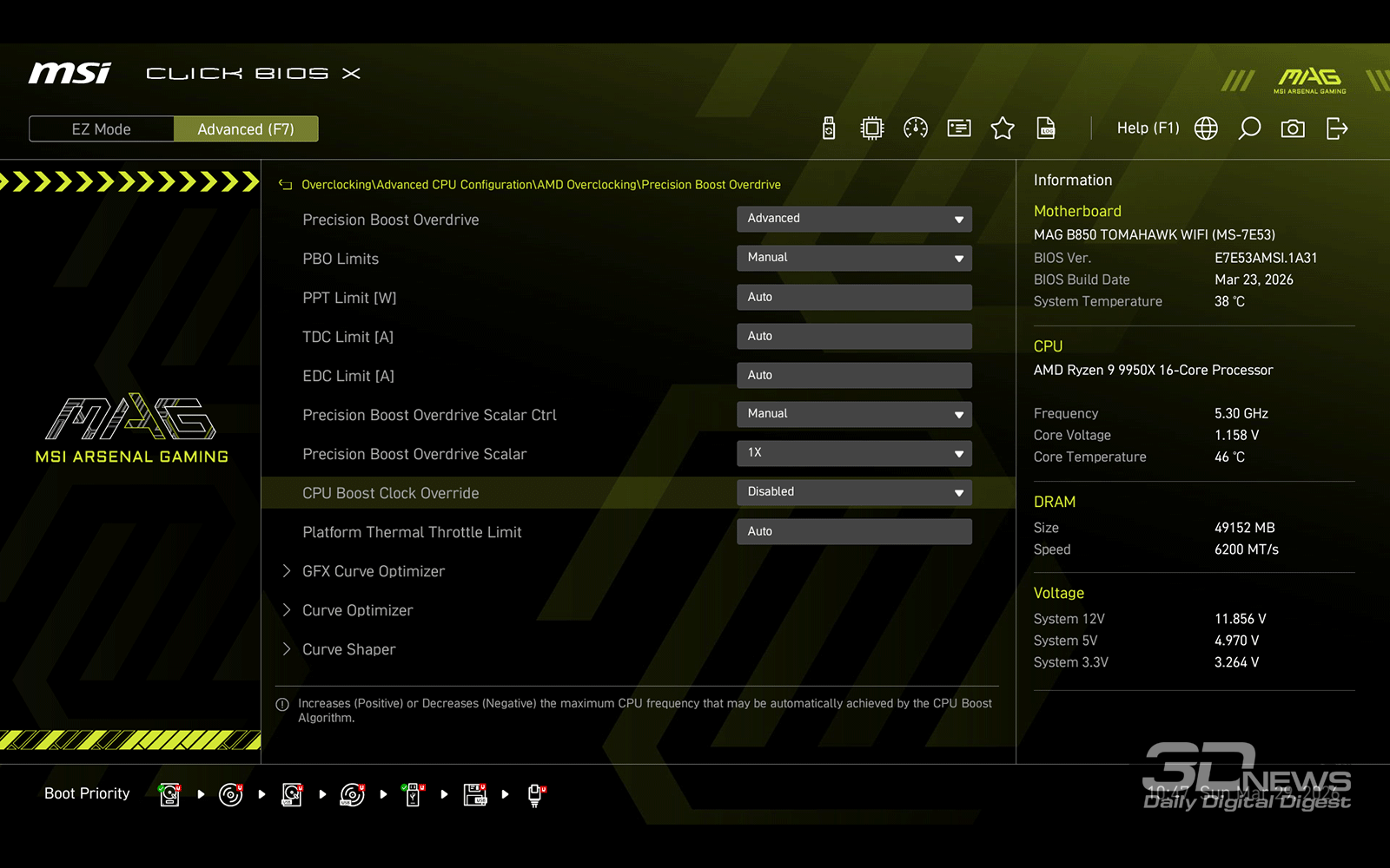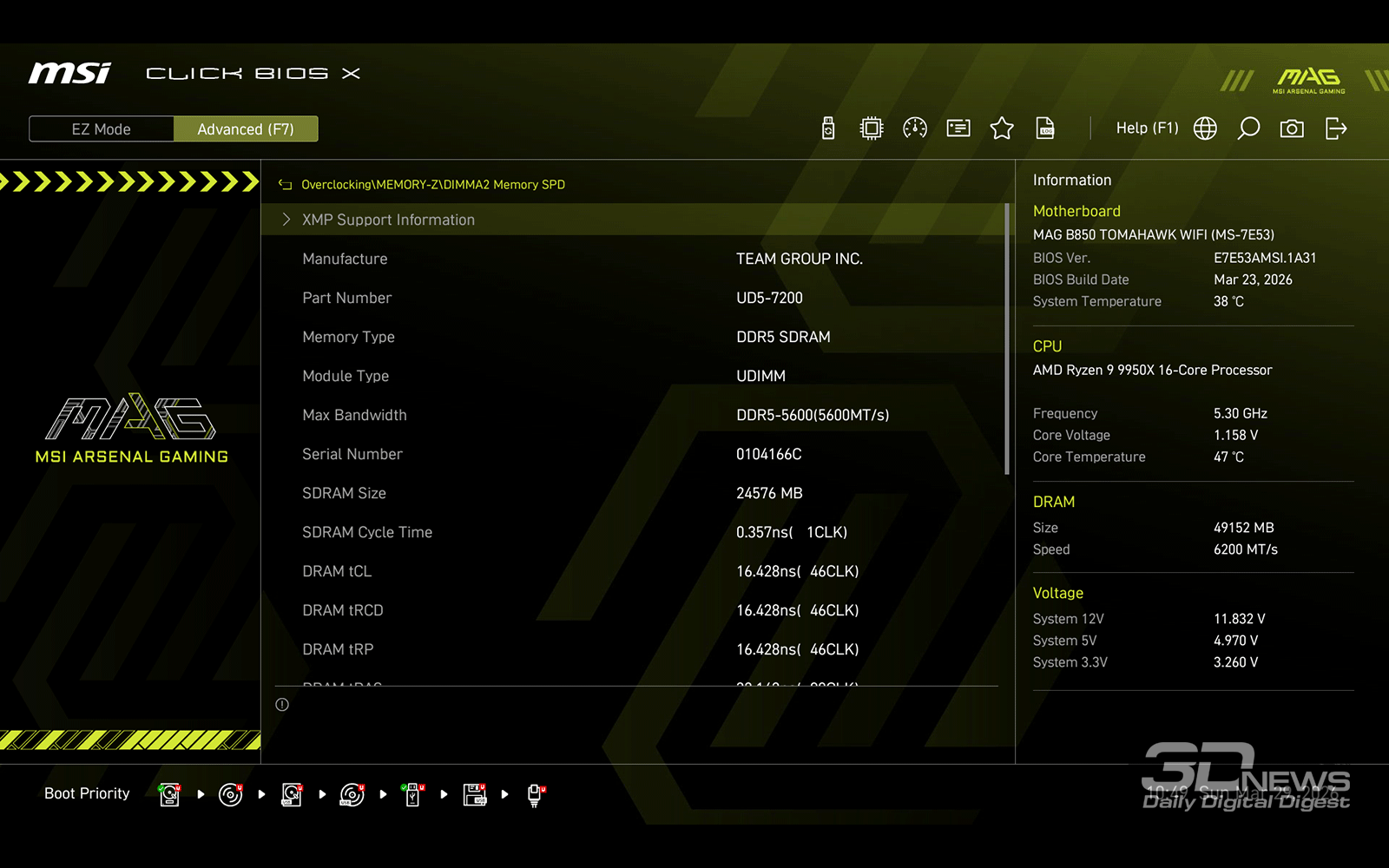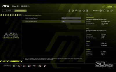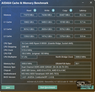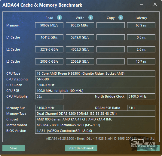 Стабильность системы мы проверяли стресс-тестом из бенчмарка рендеринга Cinebench R23 и другими утилитами, а мониторинг проводился с помощью HWiNFO64 версии 8.45-5945. Основные характеристики MSI MAG B850 TOMAHAWK WiFi приведены из утилиты HWiNFO64. Первый запуск и тест MSI MAG B850 TOMAHAWK WiFi был проведён при автоматических настройках BIOS, но с активированным XMP2 оперативной памяти. Плата корректно выставила частоту памяти (6 ГГц) и первичные тайминги (38-38-38-78_1T), а вот с остальными пользователю придётся повозиться самому, чтобы повысить производительность. Стресс-тест 16-ядерного AMD Ryzen 9 9950X на MSI MAG B850 TOMAHAWK WiFi был пройден с такими показателями мониторинга. Настройки BIOS по-умолчанию В принципе всё довольно неплохо: процессор разгонялся до 5,54 ГГц, а под нагрузкой работал на 4,84 ГГц по CCD1 и 4,54 ГГц по CCD2. Напряжение на ядре повышалось вплоть до 1,372 В, но этим на автомате грешат все платы (и мы имеем ввиду не только убрать AMD). Температура процессора повышалась до 75 градусов Цельсия, а температуры VRM цепей лишь до 51 градуса Цельсия, что особенно приятно видеть после тестирования компактной MSI MPG X870I Edge Ti Evo WiFi. Зная пределы тестового процессора, мы сразу же выставили его частоту по всем ядрам на 5,2 ГГц, зафиксировали LLC на третьем уровне и подбирали минимально возможное напряжение. Последнее оказалось равно 1,090 В. После этого были получены следующие показатели мониторинга при прохождении стресс-теста. На фиксированной частоте 5,2 ГГц температура процессора повышалась только до 80 градусов Цельсия, VRM – до 53,5 градуса, а потребление процессора достигало отметки 221 ватт. Отличные показатели, придраться не к чему и запас по температурам ещё приличный. Поэтому мы выставили частоту ядер CPU на отметке 5,3 ГГц и снова подбирали минимальное напряжение. Для такой частоты оно оказалось равно 1,155 В, что заметно ниже, чем при автоматических настройках BIOS. Тепловыделение AMD Ryzen 9 9950X выросло до 255 ватт, а температура процессора под 360-мм СЖО до 91,1 градуса Цельсия. Отметим, что цепи VRM материнской платы даже при такой серьёзной нагрузке охлаждаются отлично, поскольку их температура повысилась только до 58,5 градуса Цельсия. Тем не менее резервы по разгону этого экземпляра процессора уже исчерпаны, поэтому дальше внимание было уделено настройке оперативной памяти, благо для этого у MSI MAG B850 TOMAHAWK WiFi есть отличный арсенал возможностей. После нескольких часов тестов на частоте DDR5 6,2 ГГц при повышении FCLK до 2,133 ГГц первичные тайминги комплекта Team Group T-Create Expert (CTCED548G7200HC34ADC01) были настроены в значениях 32-38-38-48_1T, а также выставлены правильные значения вторичных и третичных таймингов, которые вы можете увидеть на скриншоте ниже. Стабильность тестировалась утилитой TestMem5 v0.13 с пресетом «1usmus v3» (без фанатизма) и бенчмарками типа 7-Zip и blender. Показанный выше результат был получен при напряжениях VDD/VDDQ 1,320/1,310 В, с последующим снижением VDDIO с 1,350 до 1,300 В, а также VSOC с 1,300 до 1,190 В. В итоге в финальном стресс-тесте процессора с настроенной памятью температура снизилась на 1 градус Цельсия. В завершение тестового блока приведём результаты пяти бенчмарков при автоматических настройках BIOS, при фиксации частоты процессора на 5,3 ГГц без настройки памяти и, наконец, на такой же частоте процессора, но уже с настроенной «оперативкой». Как видим, прирост зафиксирован почти везде, да и, судя по последней графе, пренебрегать настройкой тайминго