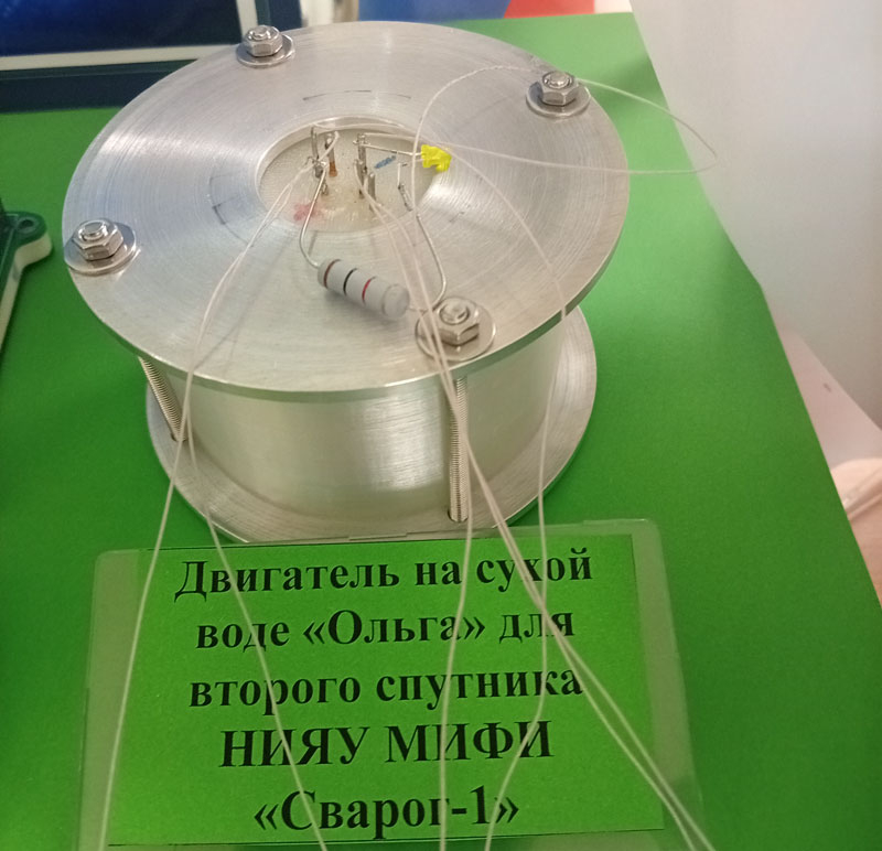 «Двигатель OLGA, который уже продемонстрировал свою принципиальную работоспособность, продемонстрировал тягу в вакуумной камере, — отметил директор Центра космических исследований и технологий НИЯУ МИФИ Евгений Степин. — Сейчас решаются определённые технические вопросы, связанные с предотвращением утечки рабочего вещества».