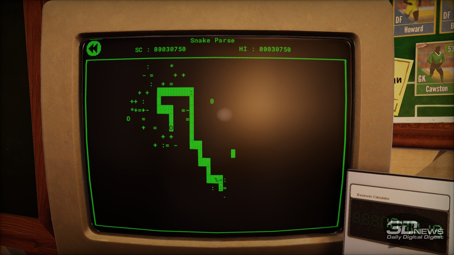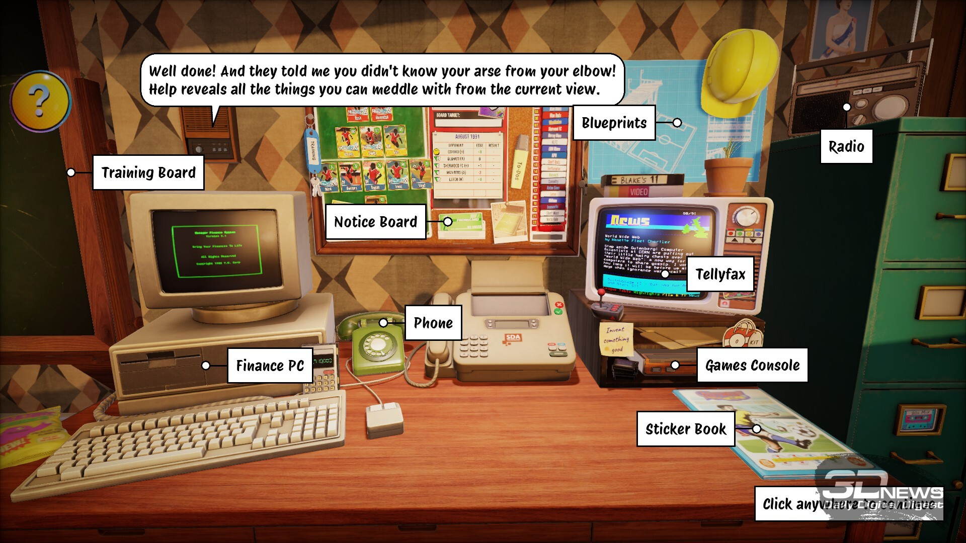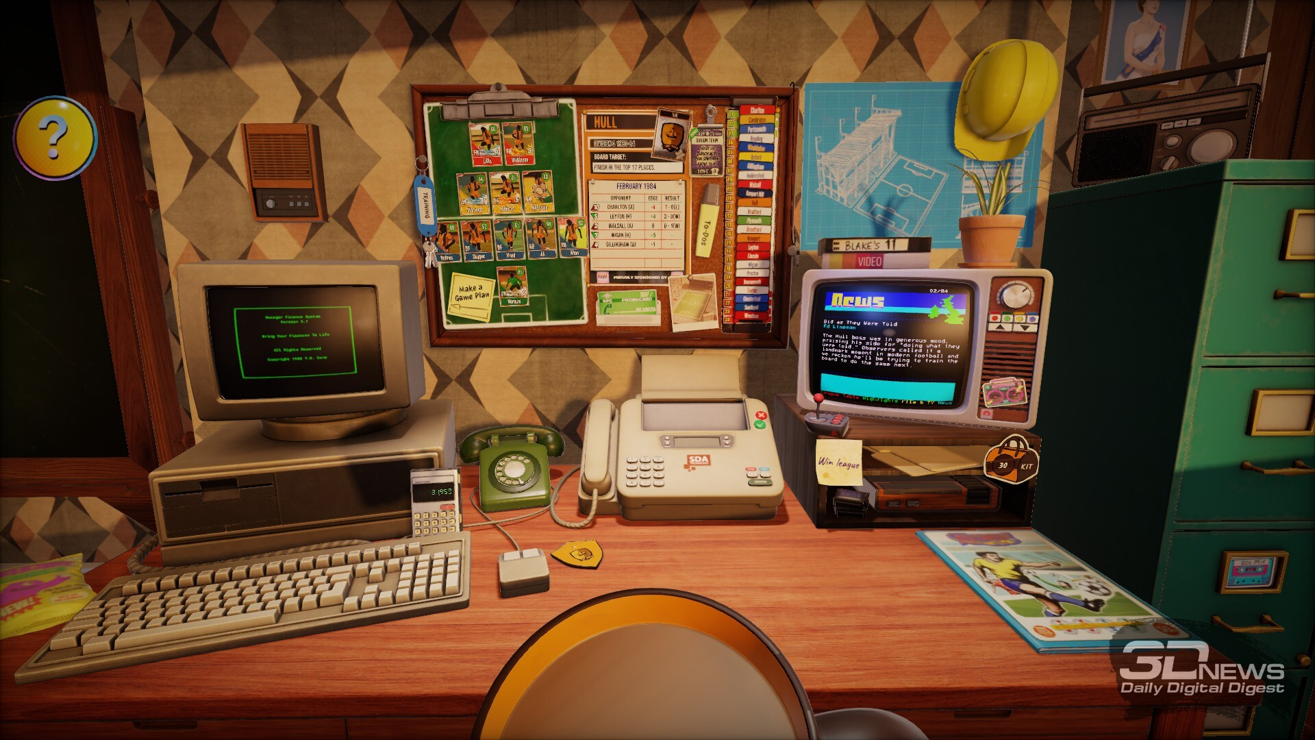 В названии игры примечательно слово Nutmeg — в переводе с английского это мускатный орех, но специя никакого отношения к игре не имеет, конечно. Так в английском сленге называется прокидывание мяча сопернику между ног, то, что по-русски называется «проверить в очко». Но более характерна не сленговая отсылка и не слово Nostalgic — тут как бы всё понятно с первого скриншота, где мы видим реальный рабочий стол с дисковым телефоном, пузатым телевизором, древним компом и другими атрибутами футбольного тренера (правильно даже говорить — менеджера) из Англии 80-х. Нас интересует слово Deckbuilding.
