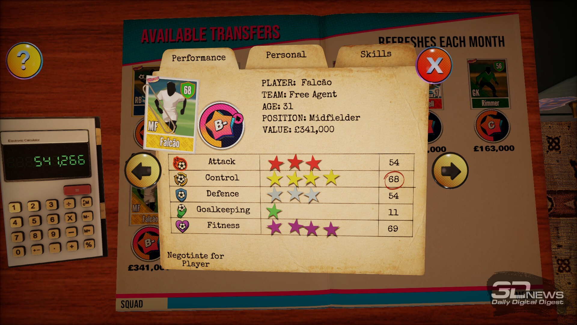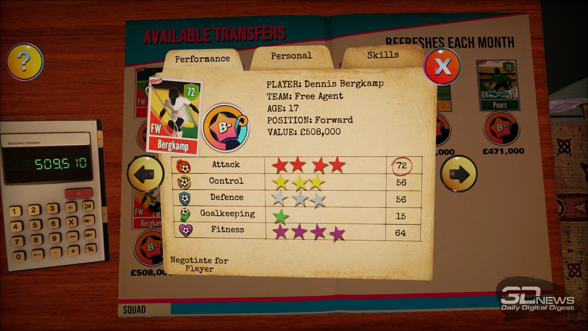 Ну и наконец, покупать и продавать футболистов никогда не надоедает, видимо, рабовладение у нас в крови. Сама возможность взять себе в нападение Бергкампа и Батистуту, обоих моих самых любимых нападающих из детства, греет душу — тут, правда, должно повезти: каждый месяц скауты приносят вам набор футболистов для приобретения, свободно пойти и купить Марадону нельзя, доступа к глобальной базе данных не предоставляют; остаётся полагаться на везение. Можно только попытаться сманить футболистов команд, против которых вы играете. Вся эта возня неизменно аддиктивна, и NUTMEG! не исключение. В любом случае Football Manager — ✓.