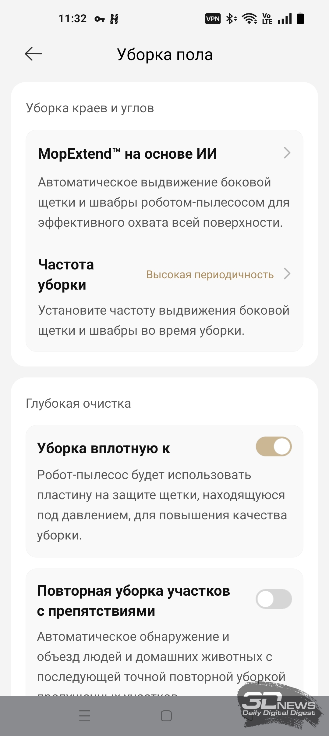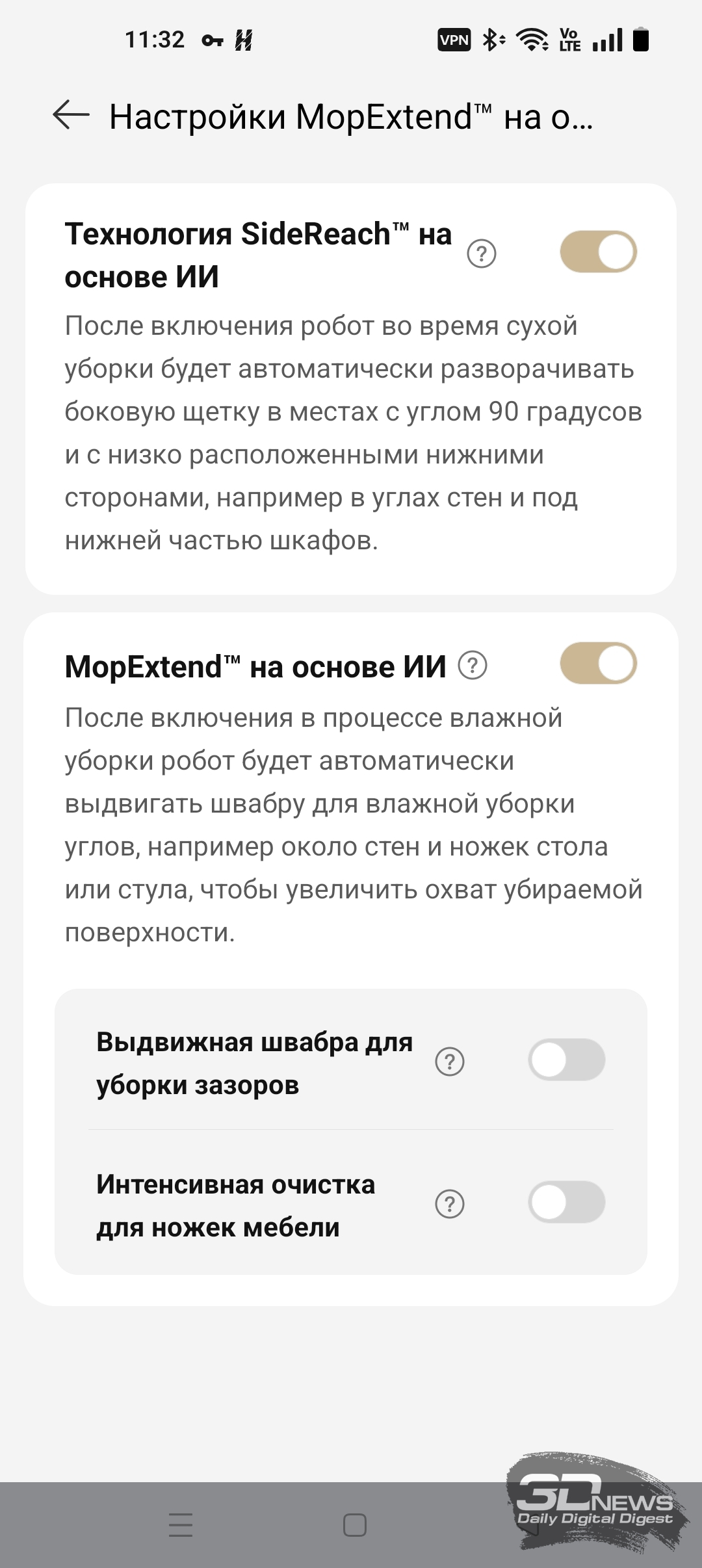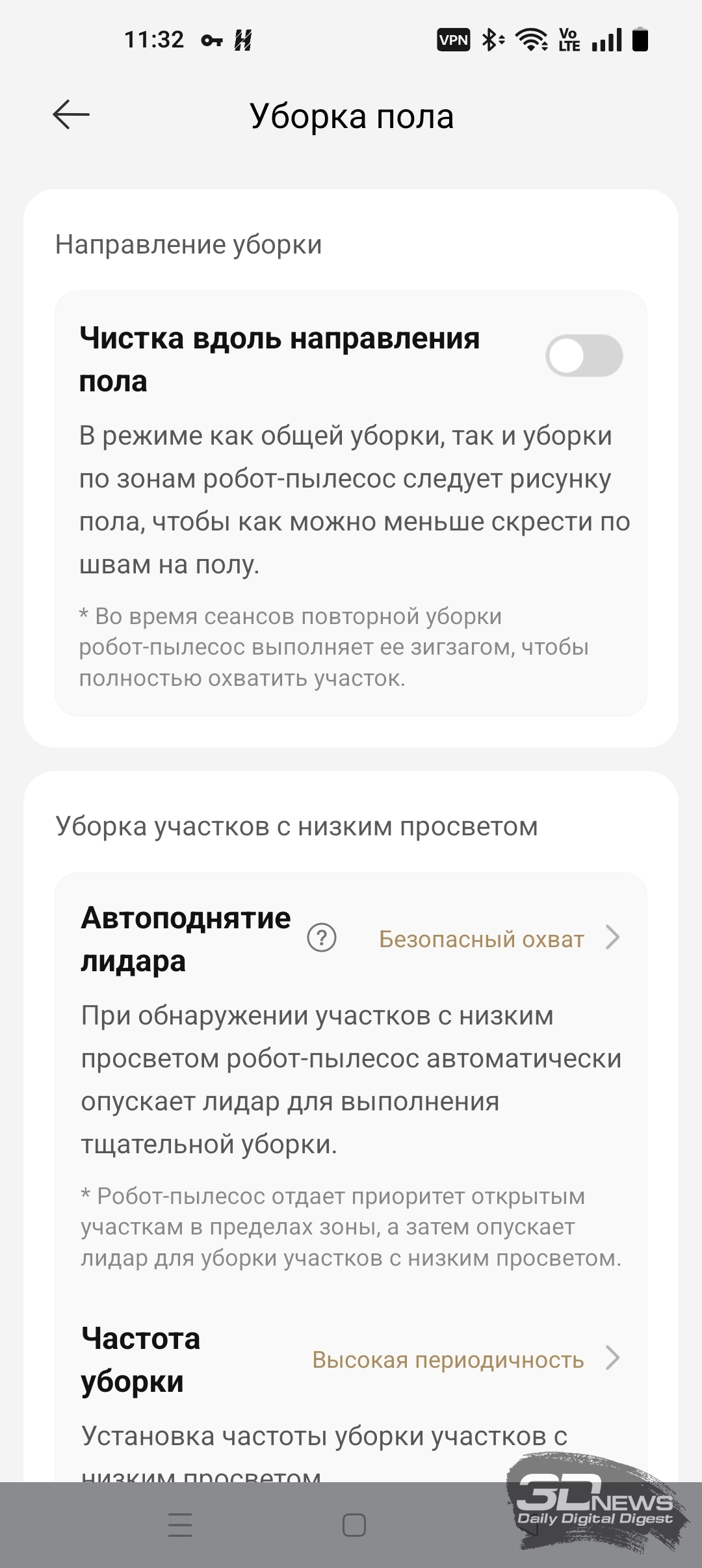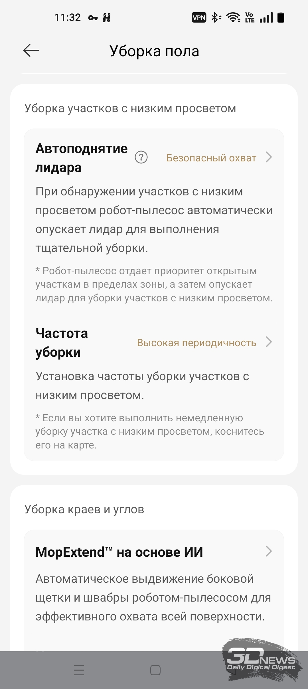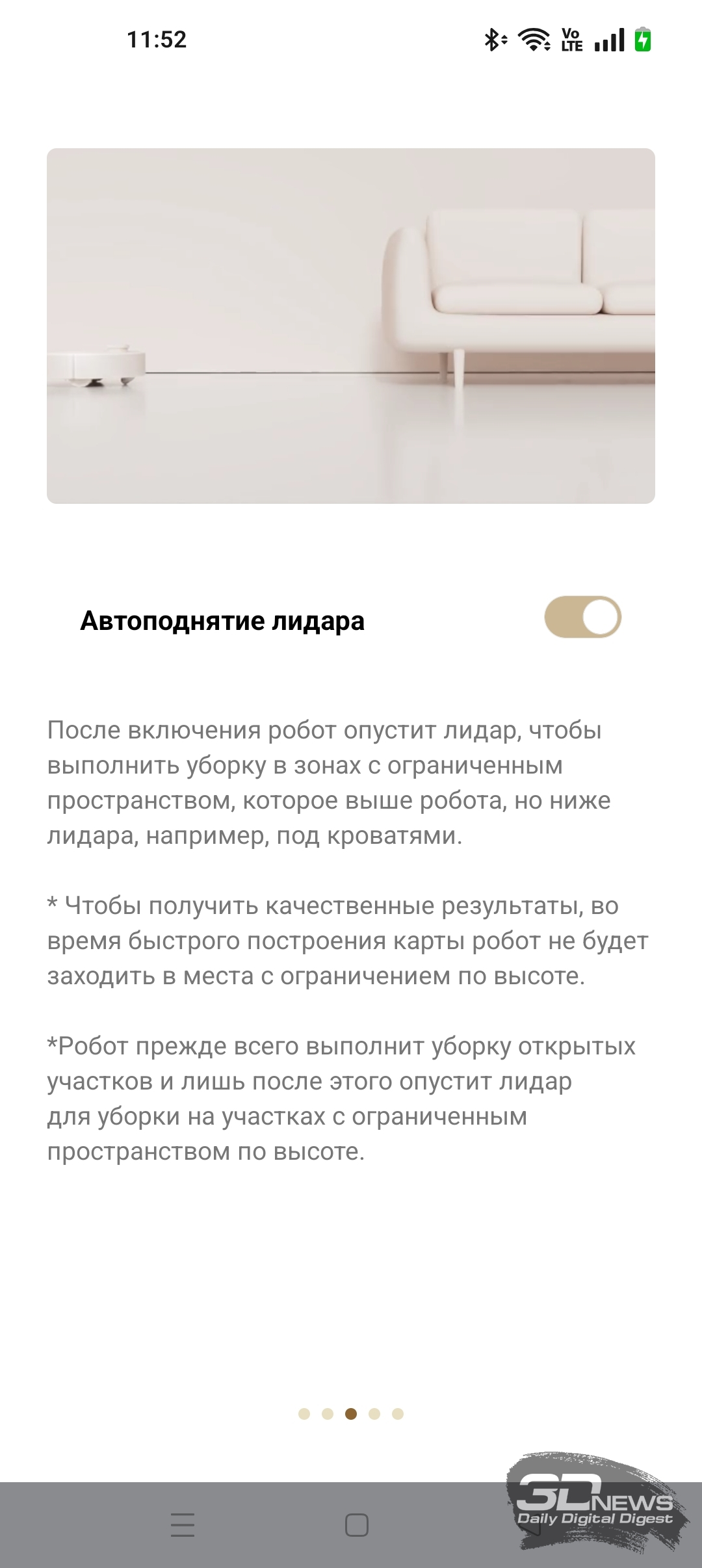 ИИ-функции X60 Ultra Complete позволяют роботу самому определять, когда надо опускать башню, а когда — нет. В приложении Dreamehome доступна функция «Низкорасположенная зона». После ее включения робот чаще заезжает под мебель, опуская лидар.