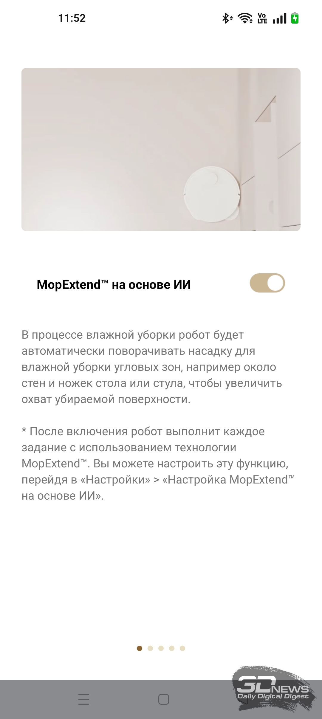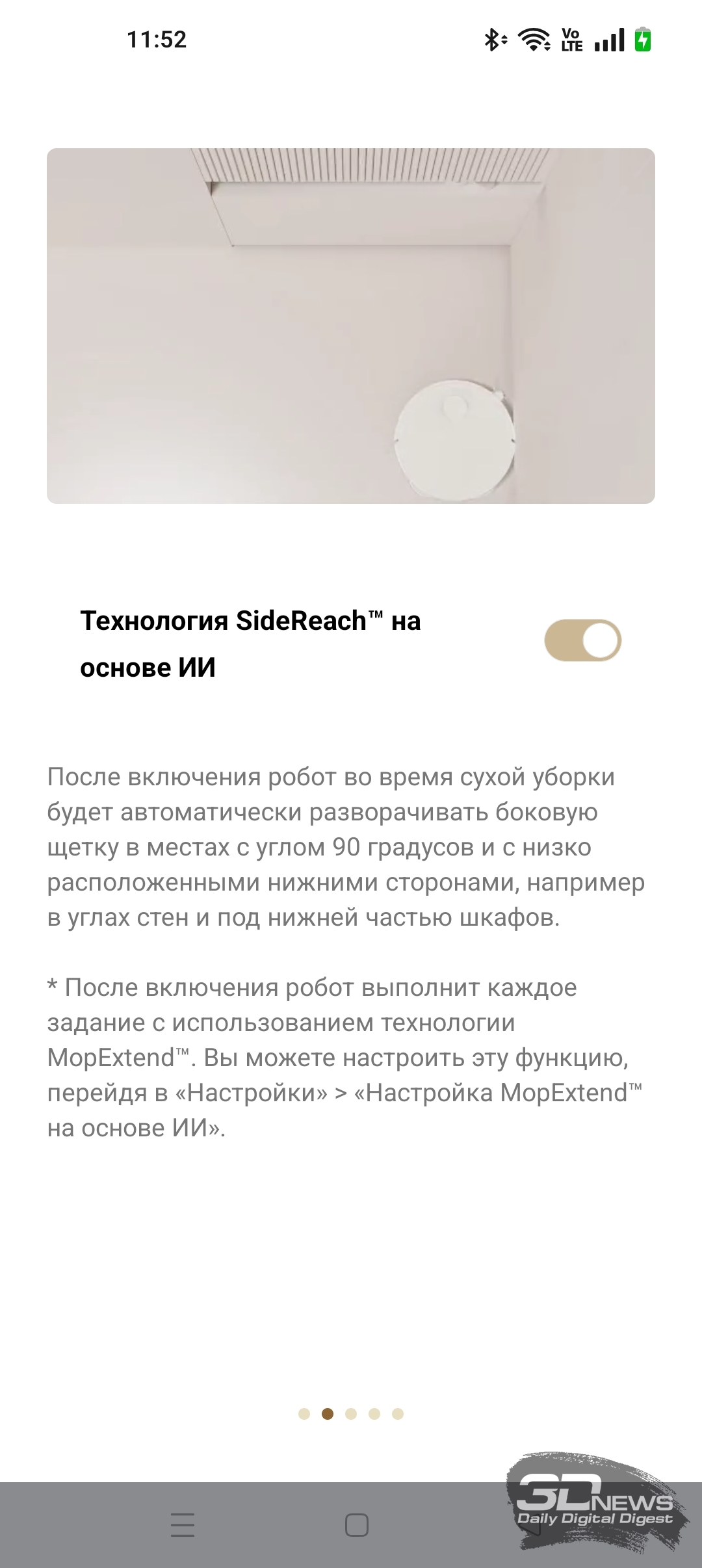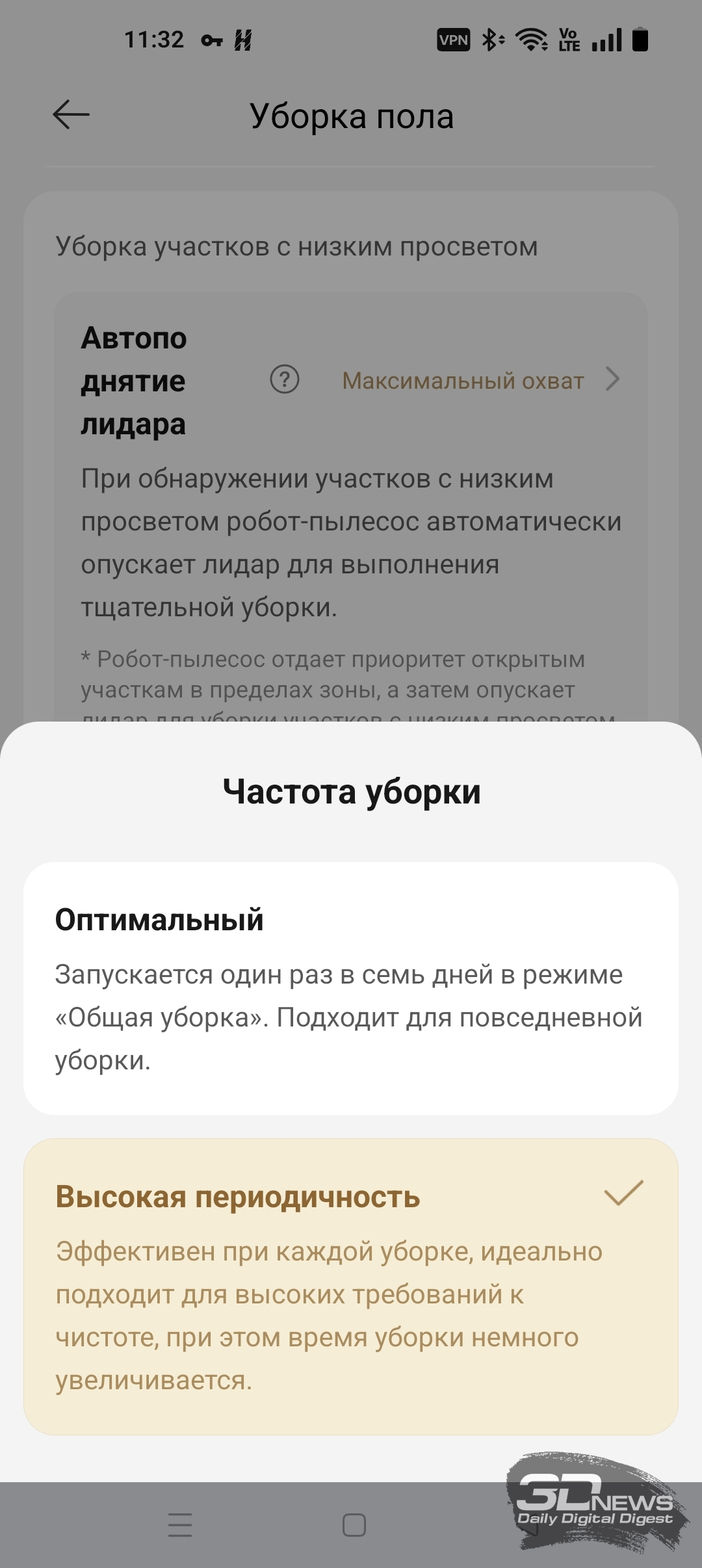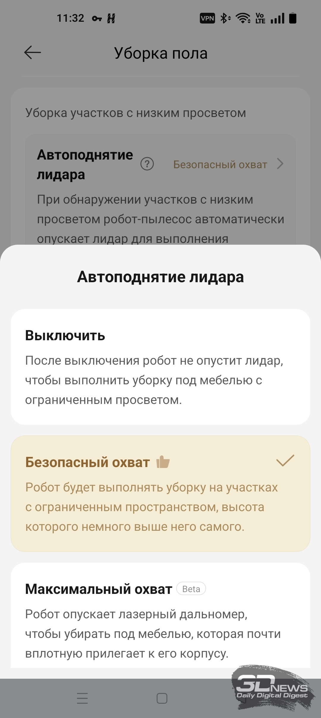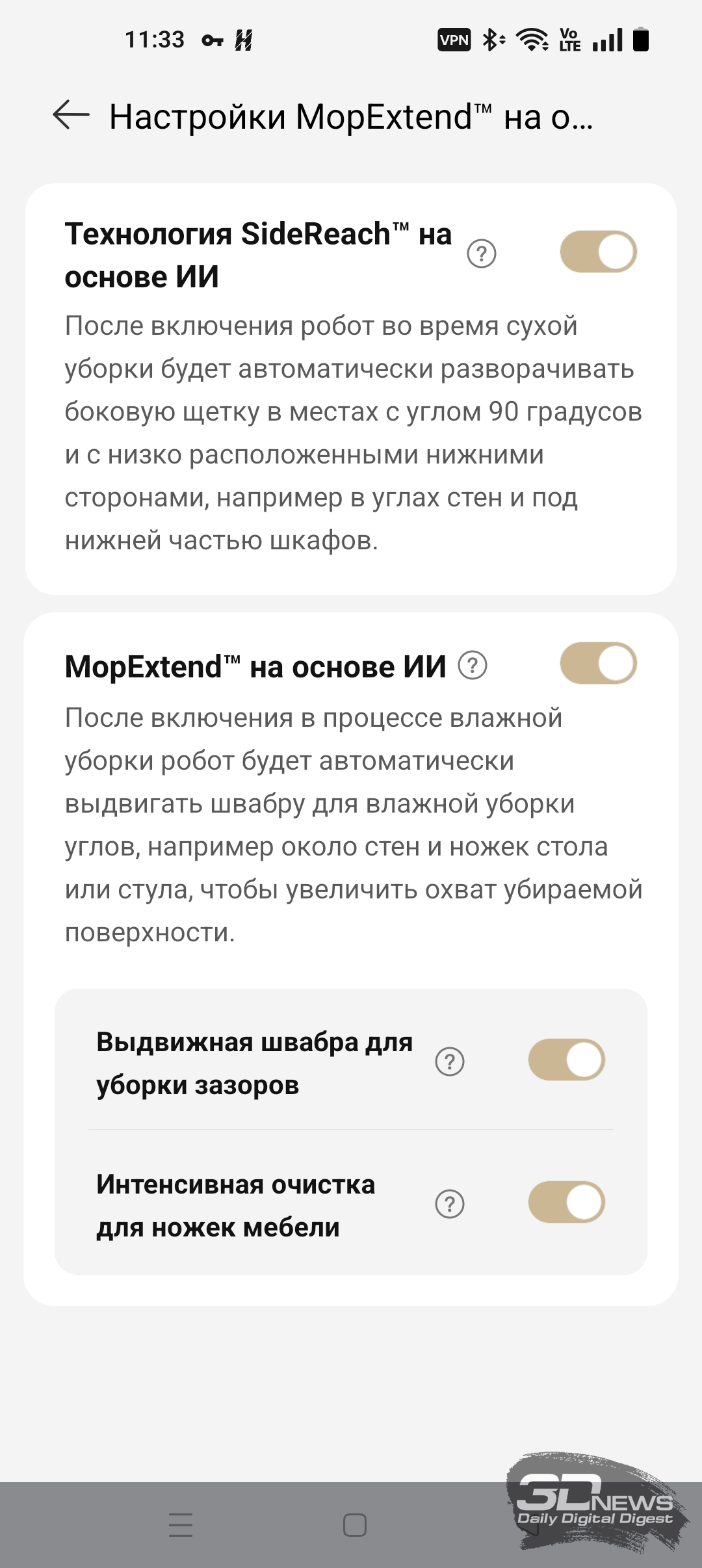 ИИ-функции X60 Ultra Complete позволяют роботу самому определять, когда надо опускать башню, а когда — нет. В приложении Dreamehome доступна функция «Низкорасположенная зона». После ее включения робот чаще заезжает под мебель, опуская лидар.
