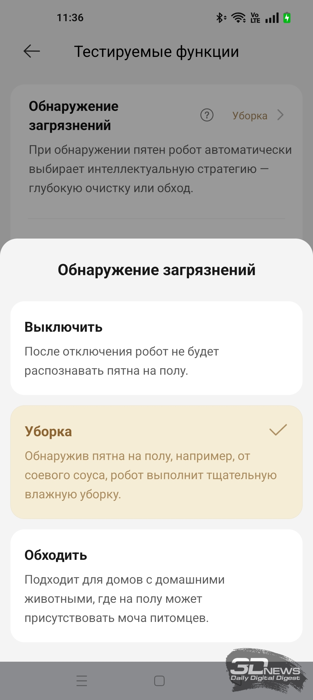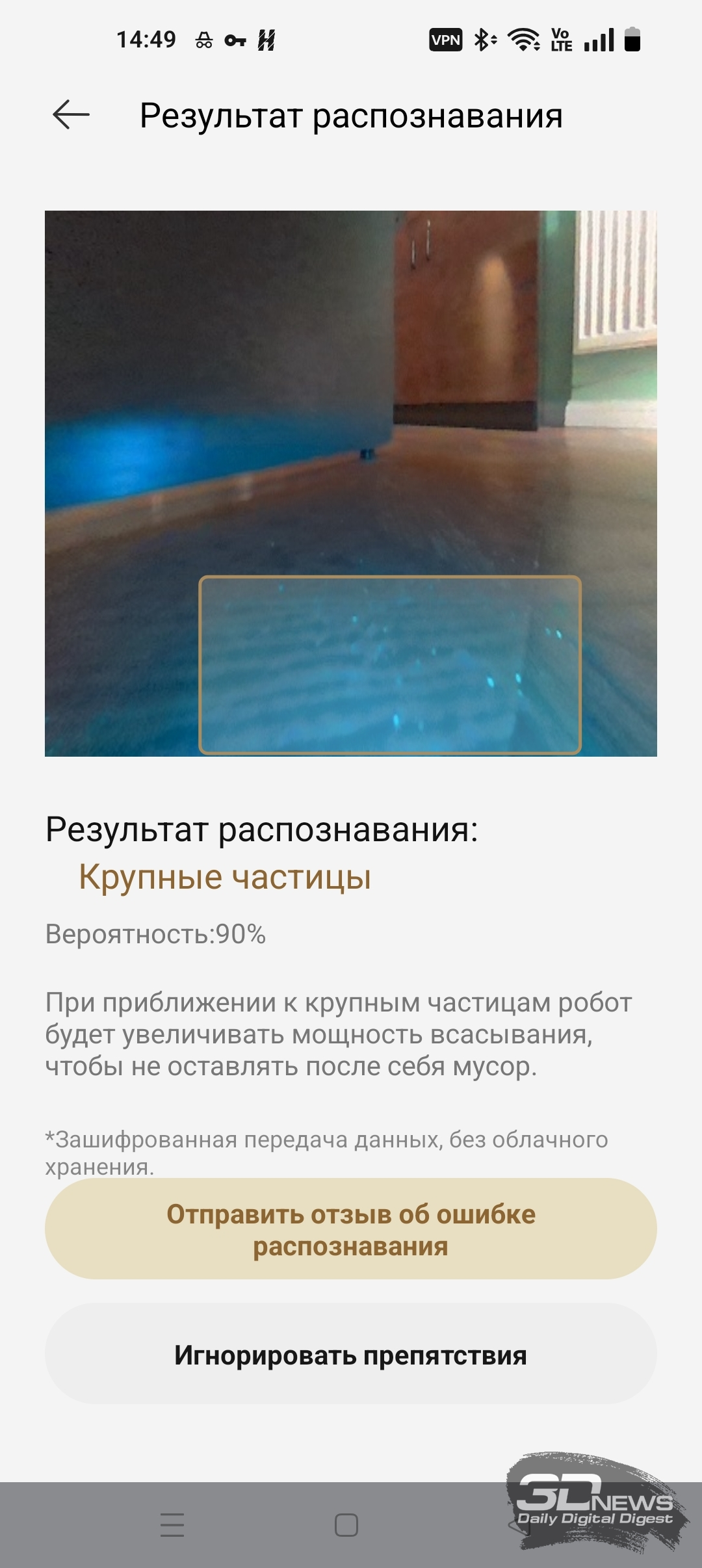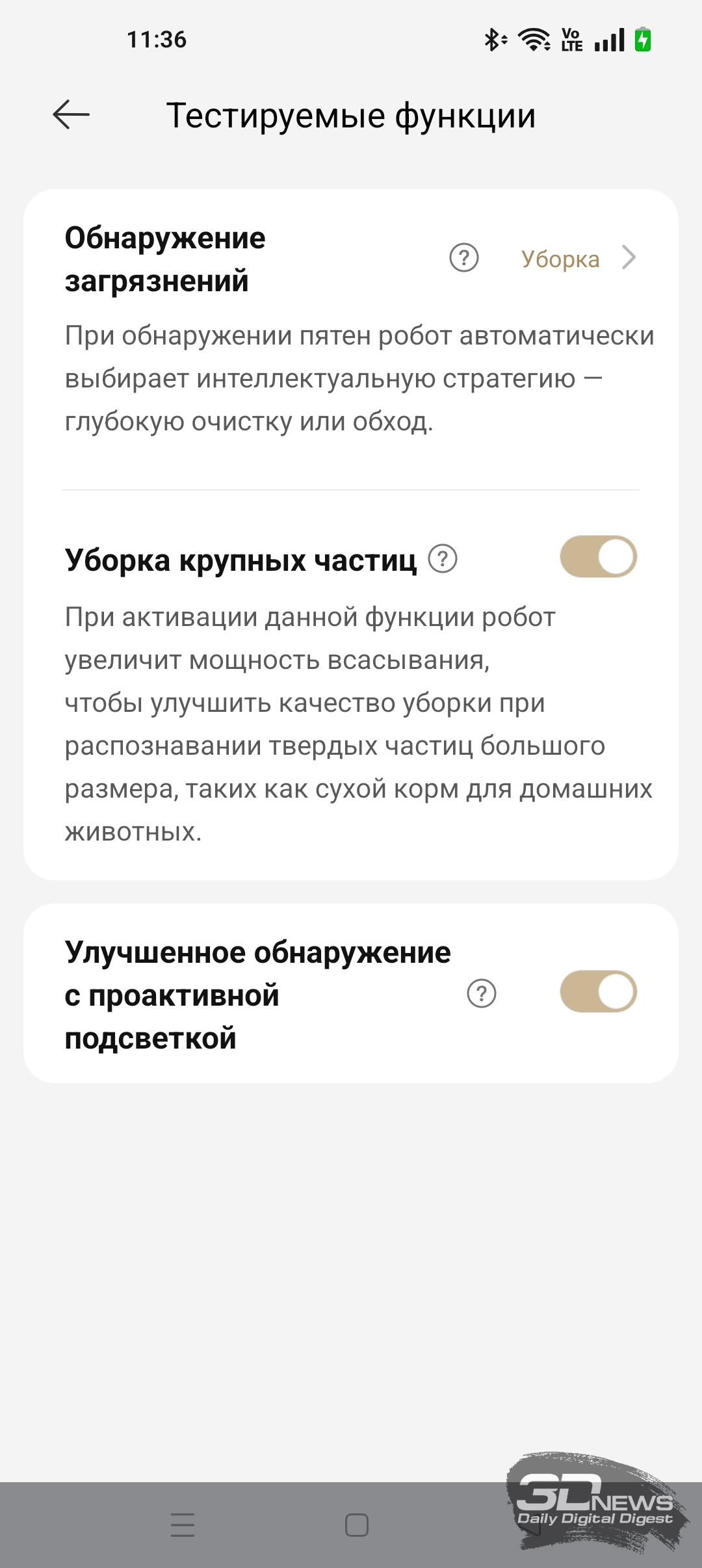 Активация тех или иных функций, конечно же, заметно сказывается на эффективности и продолжительности уборки. Например, в приложении Dreamehome есть раздел «Тестируемые функции». Мы можем включить функцию «Обнаружение загрязнений» — после ее активации робот использует ИК-подсветку для обнаружения дополнительных крупных частиц мусора. При обнаружении таких включается режим дополнительной сухой уборки на повышенной мощности всасывания. Во время одновременной сухой и влажной уборки офисного помещения X60 Ultra Complete обнаружил семь таких зон. Использовался комбинированный режим «Стандартный» с обычной скоростью мойки пола и влажностью 16 (с промывкой салфеток после обработки каждых 20 м2 помещения). В итоге робот обработал 37 м2 помещения за 56 минут — и потратил 34 % заряда аккумулятора. Качество уборки я охарактеризую как очень высокое. Если же функцию «Обнаружение загрязнений» выключить, то X60 Ultra Complete в тех же условиях справится с задачей за 30 минут, потратив вдвое меньше электроэнергии.