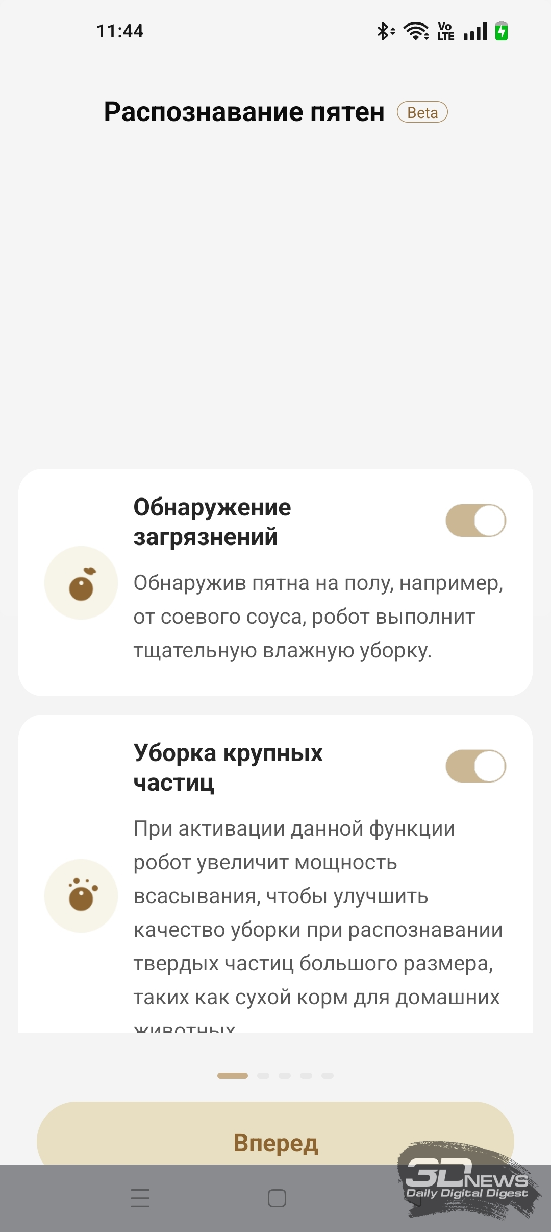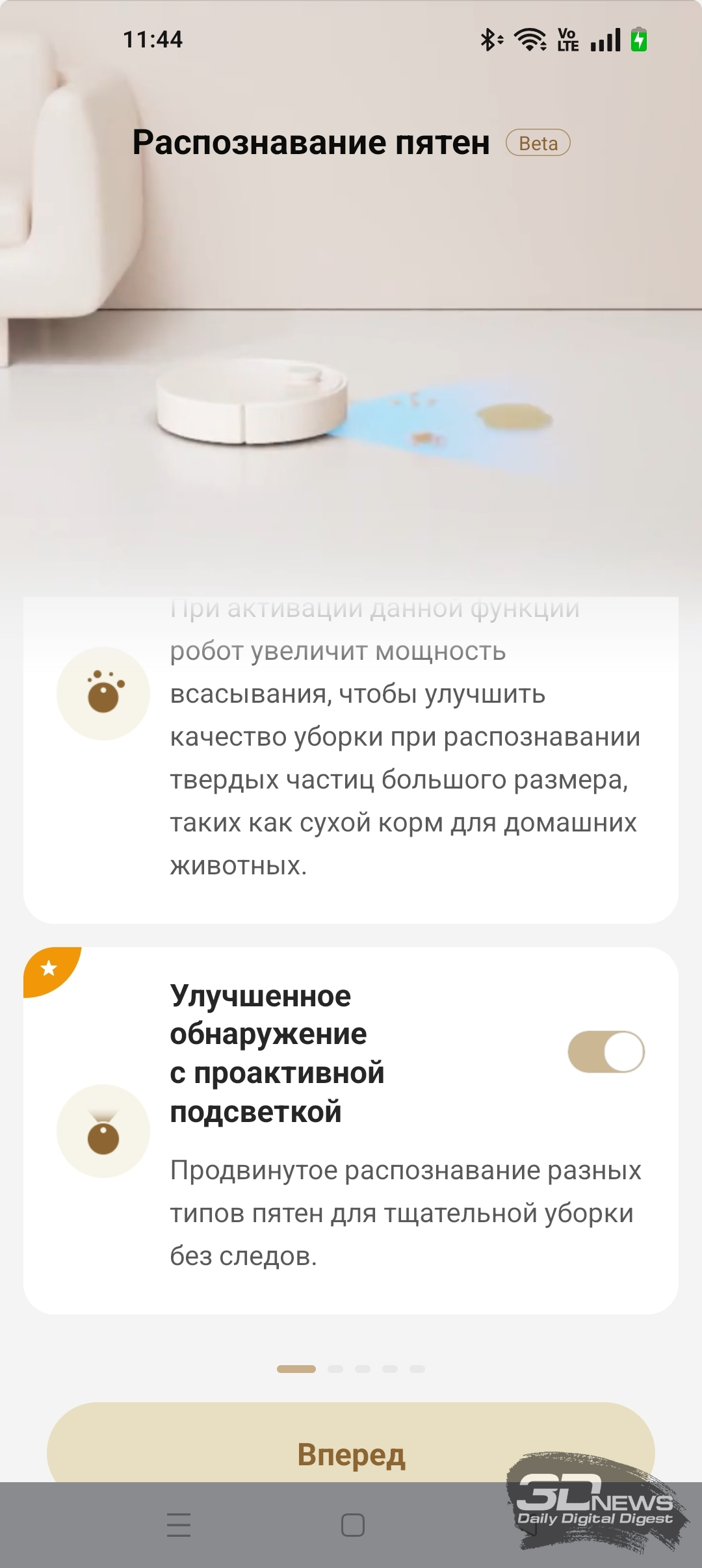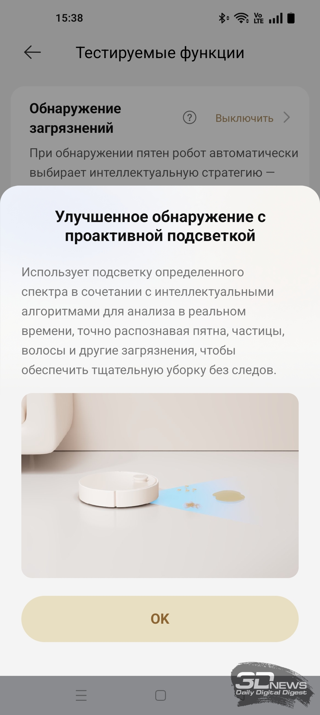 Активация тех или иных функций, конечно же, заметно сказывается на эффективности и продолжительности уборки. Например, в приложении Dreamehome есть раздел «Тестируемые функции». Мы можем включить функцию «Обнаружение загрязнений» — после ее активации робот использует ИК-подсветку для обнаружения дополнительных крупных частиц мусора. При обнаружении таких включается режим дополнительной сухой уборки на повышенной мощности всасывания. Во время одновременной сухой и влажной уборки офисного помещения X60 Ultra Complete обнаружил семь таких зон. Использовался комбинированный режим «Стандартный» с обычной скоростью мойки пола и влажностью 16 (с промывкой салфеток после обработки каждых 20 м2 помещения). В итоге робот обработал 37 м2 помещения за 56 минут — и потратил 34 % заряда аккумулятора. Качество уборки я охарактеризую как очень высокое. Если же функцию «Обнаружение загрязнений» выключить, то X60 Ultra Complete в тех же условиях справится с задачей за 30 минут, потратив вдвое меньше электроэнергии.