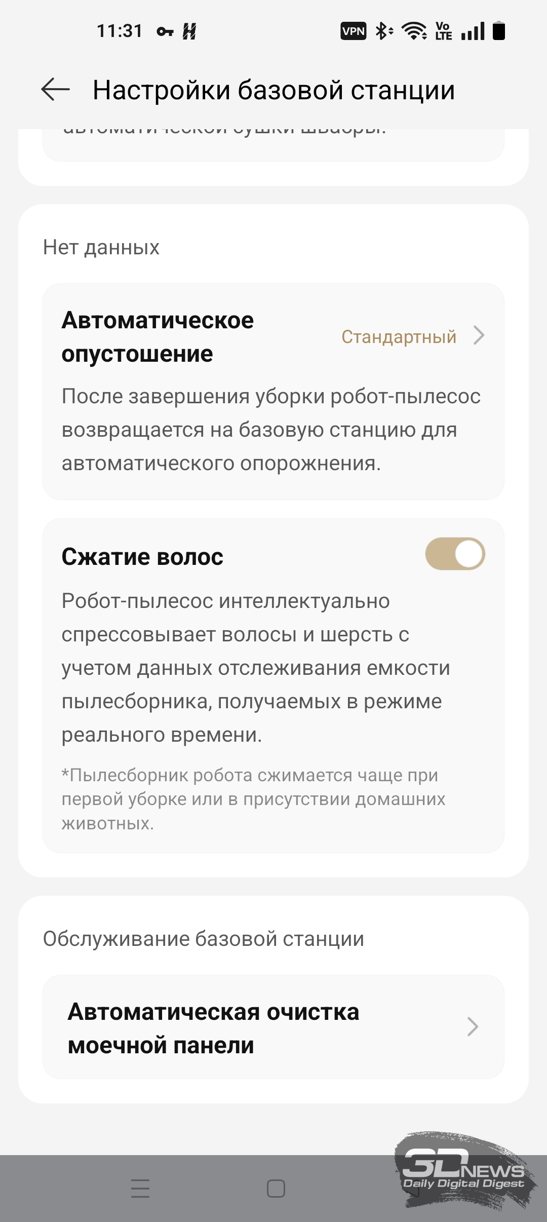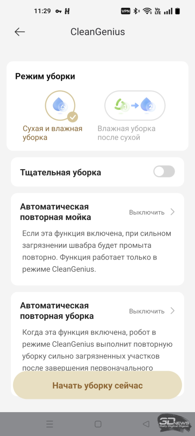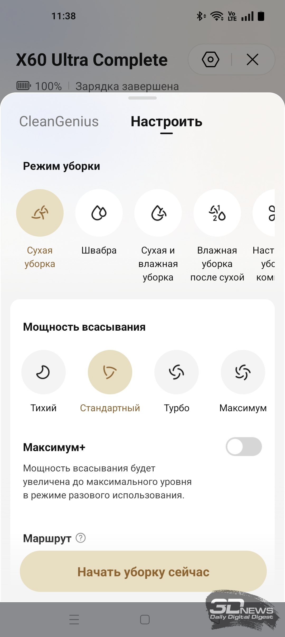 Герой обзора поддерживает несколько режимов работы. По умолчанию устройство предлагает воспользоваться технологией CleanGenius — она объединяет в себе все интеллектуальные возможности X60 Ultra Complete. В таком режиме устройство само определит, как ему действовать в той или иной ситуации. Вы только решаете, будет ли это сухая, влажная или комбинированная уборка. В ручном режиме ИИ-функции устройства не отключаются, однако вы сами регулируете мощность работы двигателя, объем смачивания салфеток и частоту их промывки. Пользователю доступны пресеты «Тихий» (58 дБА), «Стандартный» (58 дБА), «Турбо» (62 дБА), «Максимум» (65 дБА) и «Максимум+» (67 дБА). В скобках указаны наши замеры уровня шума. На фоне конкурентов и напольных пылесосов X60 Ultra Complete работает негромко. Сбор сухого мусора станцией самоочистки, по нашим измерениям, совершается с шумом 71 дБА. Мойка и сушка швабры происходят очень тихо.