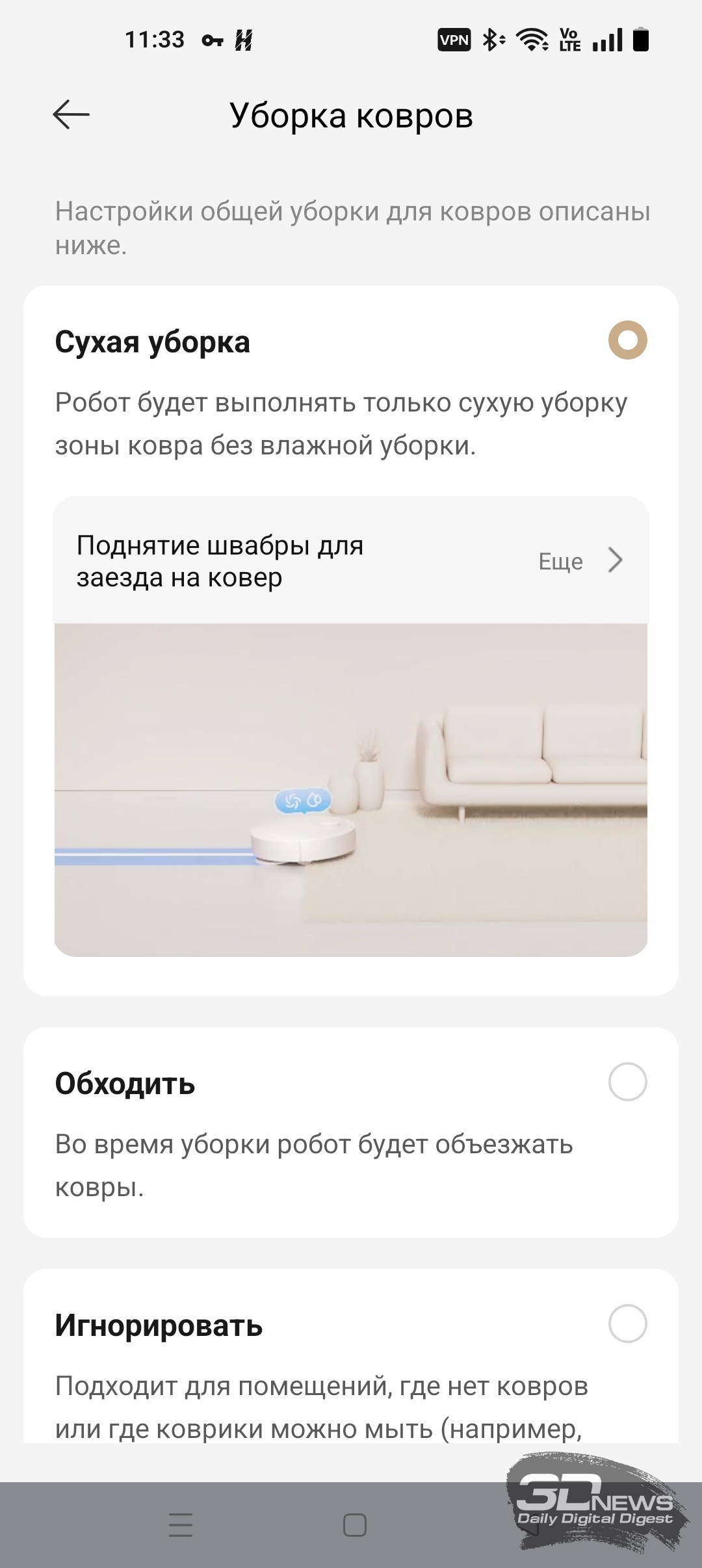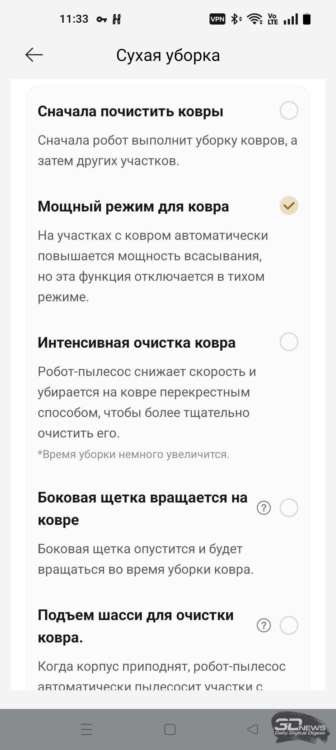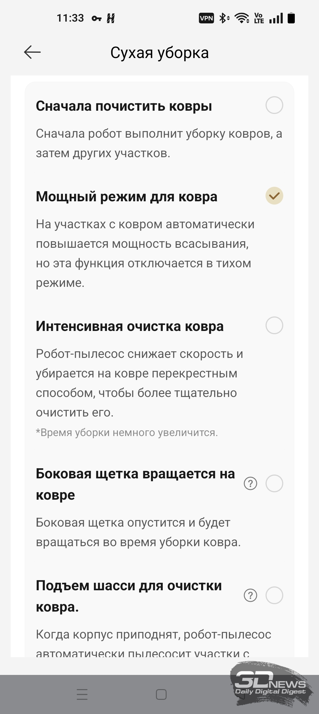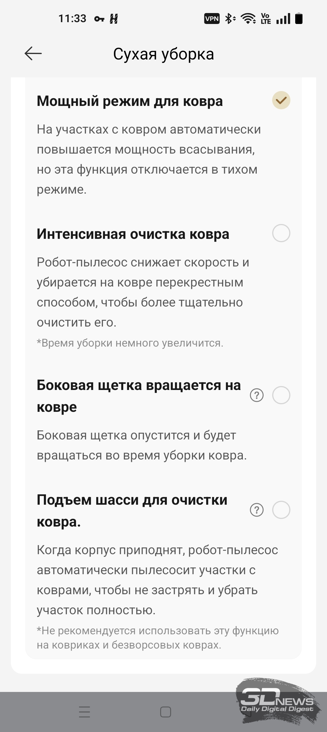 Как уже было сказано, «шестидесятый» обладает большим количеством настроек по уборке пола, ковров, а также по наладке работы док-станции — с описанием некоторых из них вы можете ознакомиться на скриншотах ниже.