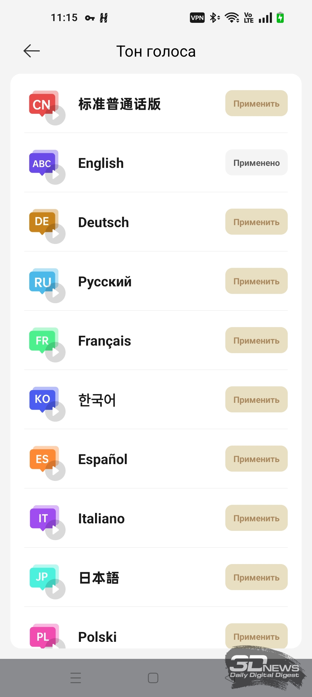 • выбрать язык приложения и голосовых комментариев;