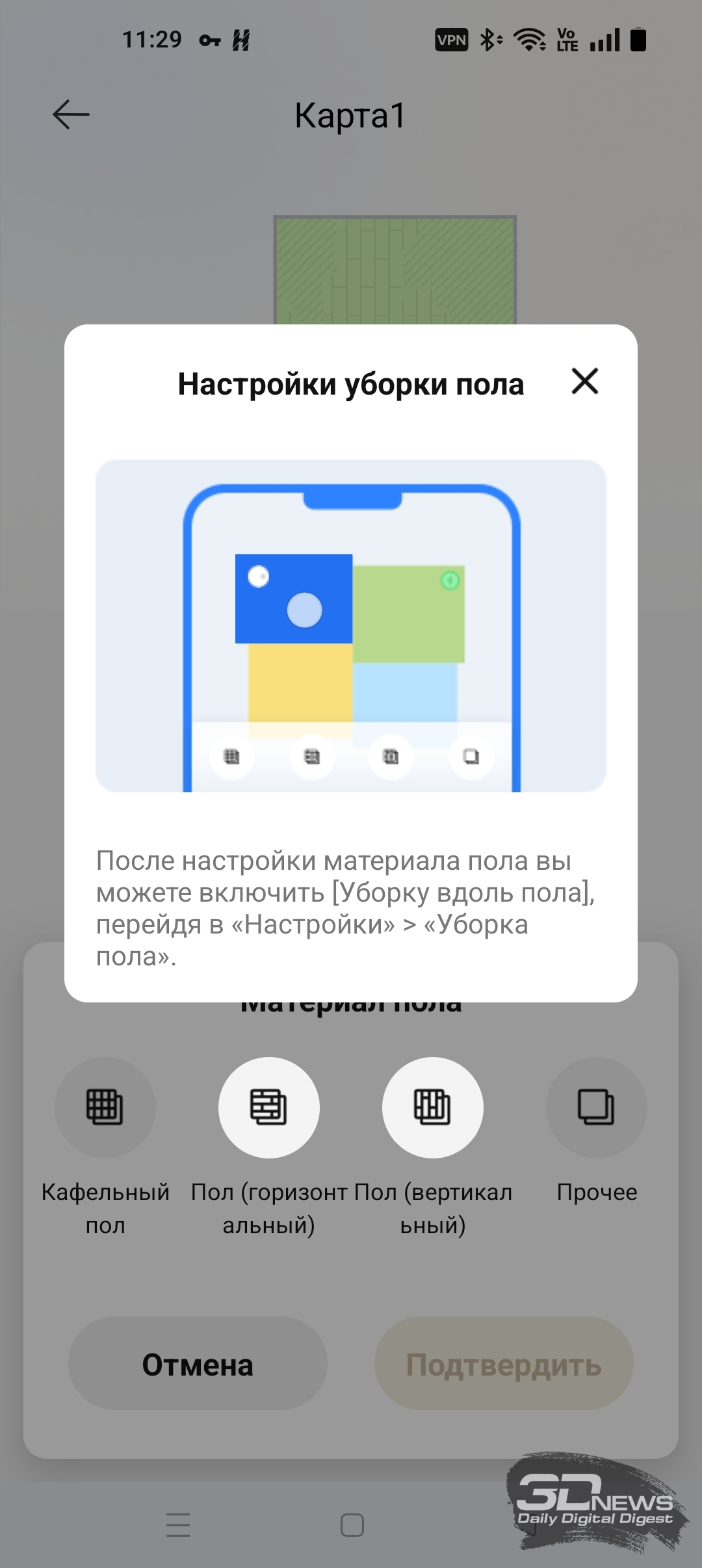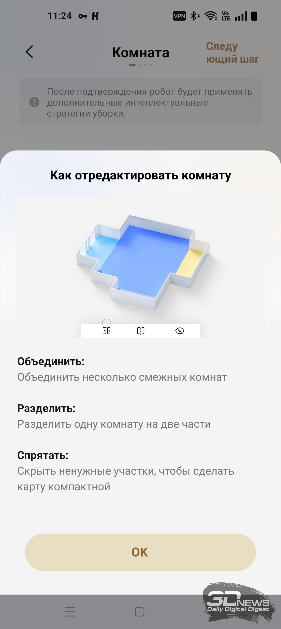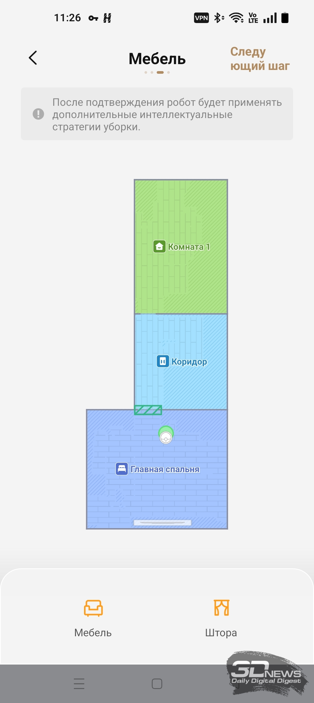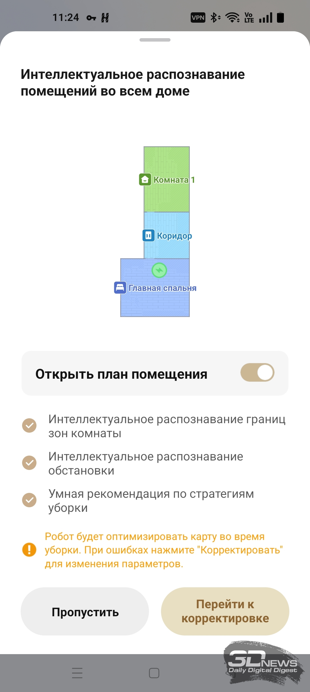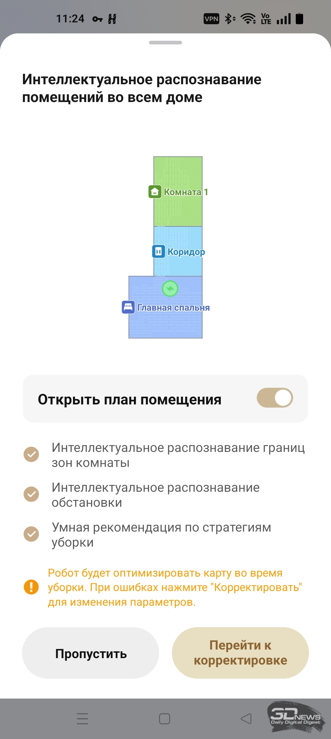 Приложение рекомендует начать работу с полноценной тщательной уборки помещения. Одновременно с этим будет построена и карта. От уборки можно отказаться — то есть сначала составить непосредственно карту помещения. На все про все у нас ушло четыре с половиной минуты. «Шестидесятый» проехал поочередно все комнаты и двигался практически бесшумно. Итог: получена весьма точная карта с правильным разделением комнат. В любом случае затем приложение Dreamehome предложит более детально настроить карту. А именно: