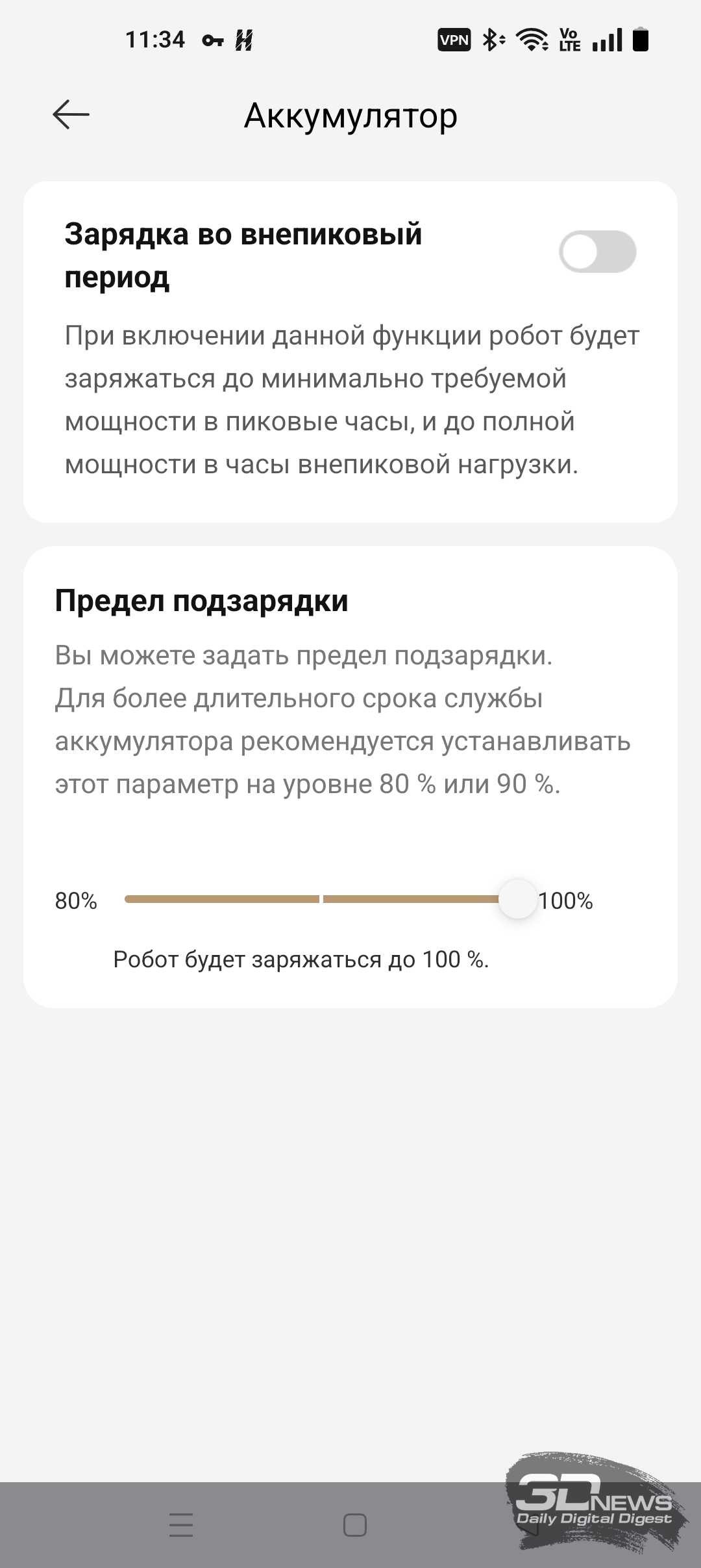 X60 Ultra Complete оснащен функцией увеличения долговечности АКБ. В приложении Dreamehome пользователь может установить предельный уровень заполнения батареи. Док-станция оснащена функцией быстрой зарядки: аккумулятор робота полностью восстанавливает запас энергии всего за 80 минут.
