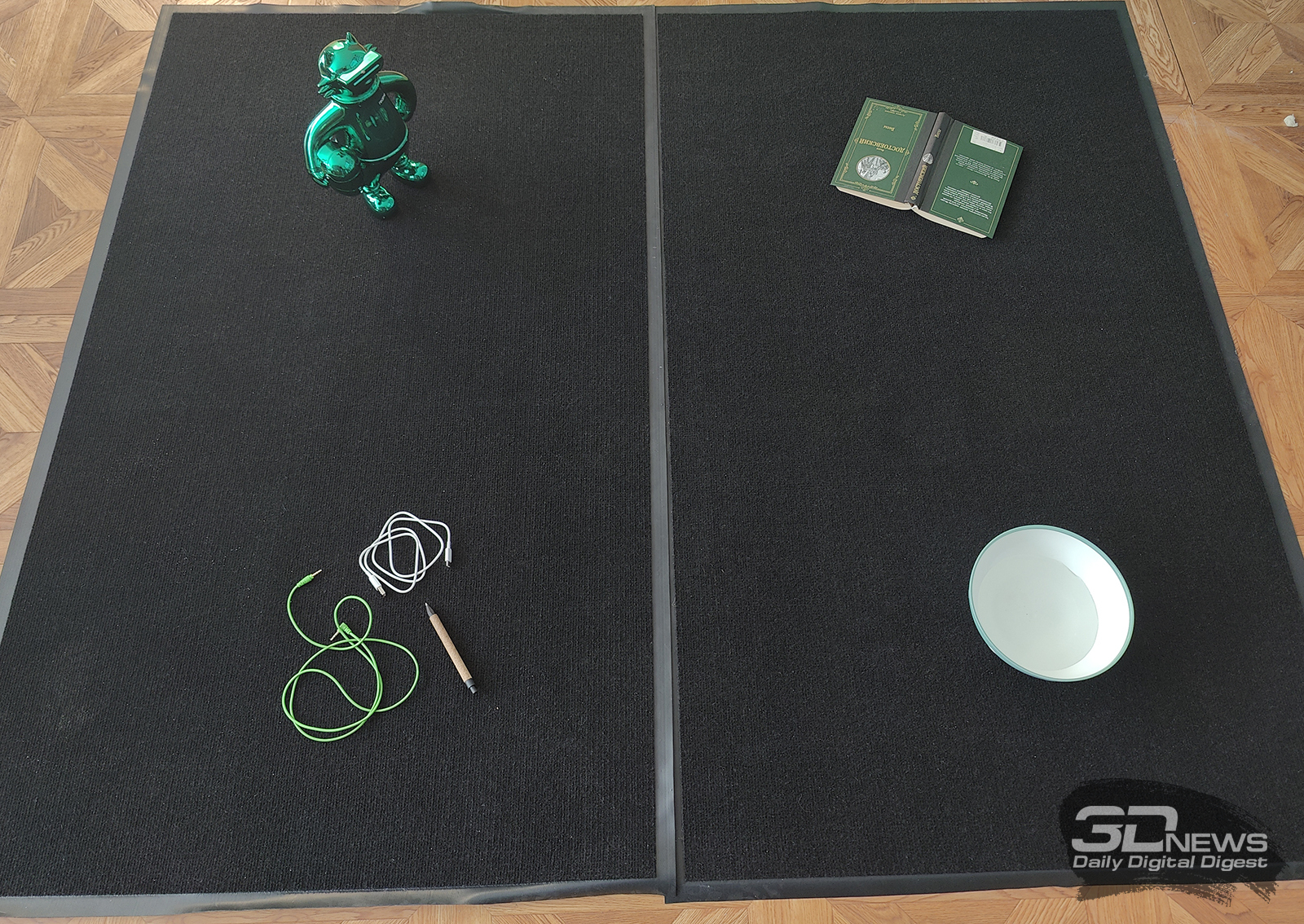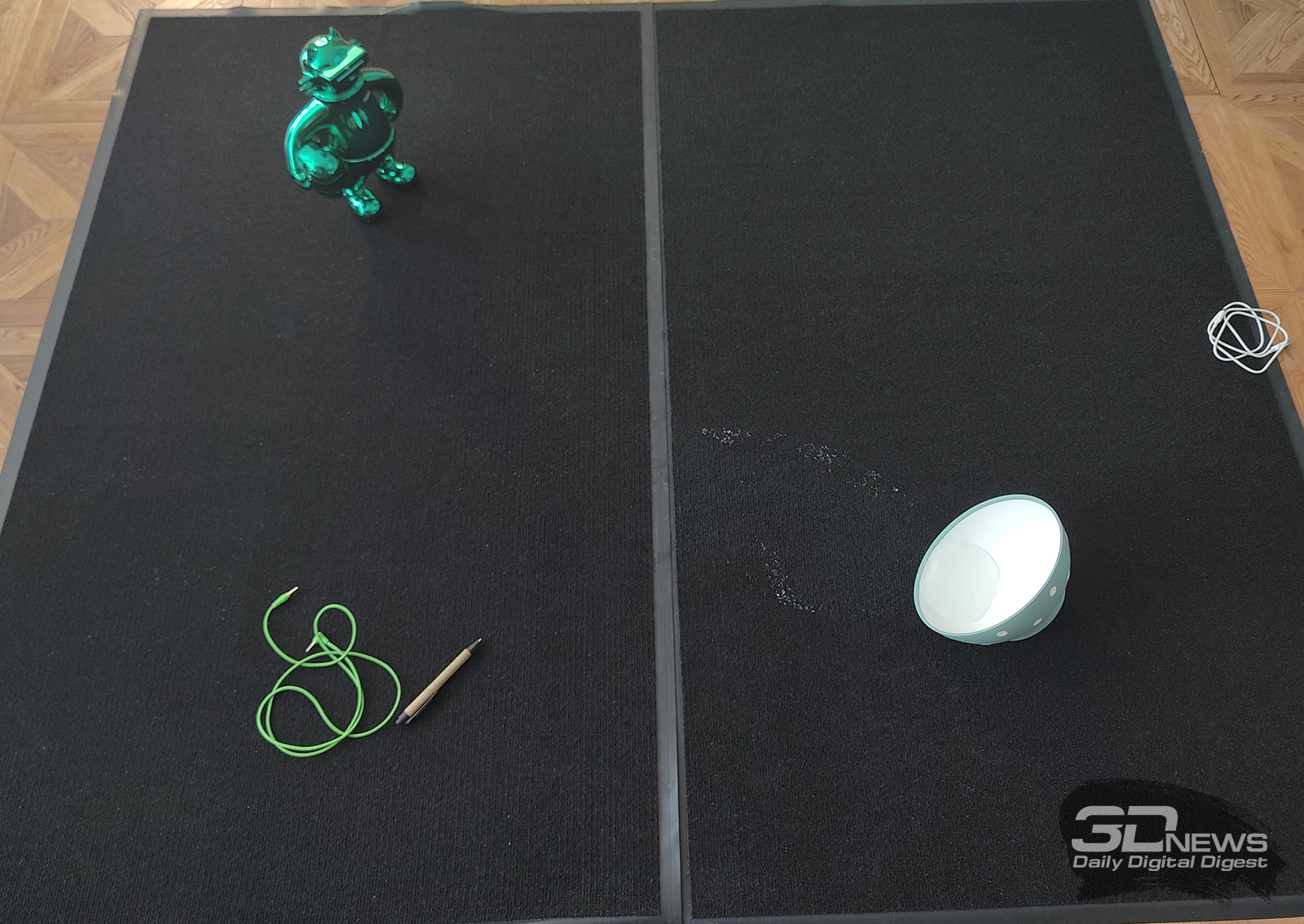 Для проверки аккуратности работы устройства мы разместили на ковре четыре предмета: миниатюрную игрушку (хорошо имитирует напольную вазу), клубок проводов, книгу и миску с водой. Перед уборкой зоны робот о присутствии этих вещей не знал.