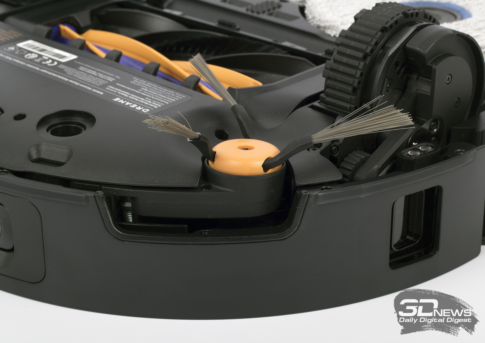 Если перевернуть устройство, в глаза сразу же бросается система HyperStream. В ее основе лежит пара роликовых щеток с разным типом щетины. Вкупе с высоким давлением всасывания достигается отличная эффективность забора мусора — как крупных, так и мелких частиц. Кроме того, HyperStream предотвращает спутывание волос и шерсти домашних питомцев. Фиолетово-оранжевая щетка с гребнями из термопластичного полиуретана не имеет щетины. Второй ролик получил гибридную конструкцию.