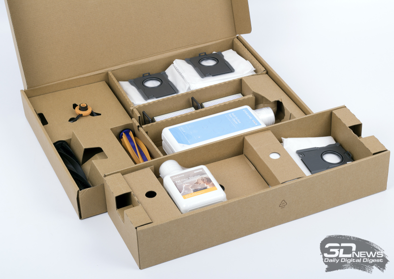 Система поставляется в собранном виде — это значит, что к роботу-уборщику подключены все щетки и швабры, к контейнеру для сухих частиц — HEPA-фильтр, а к док-станции — тканевый мешок для сбора мусора. Кроме того, максимальный комплект поставки устройства включает: