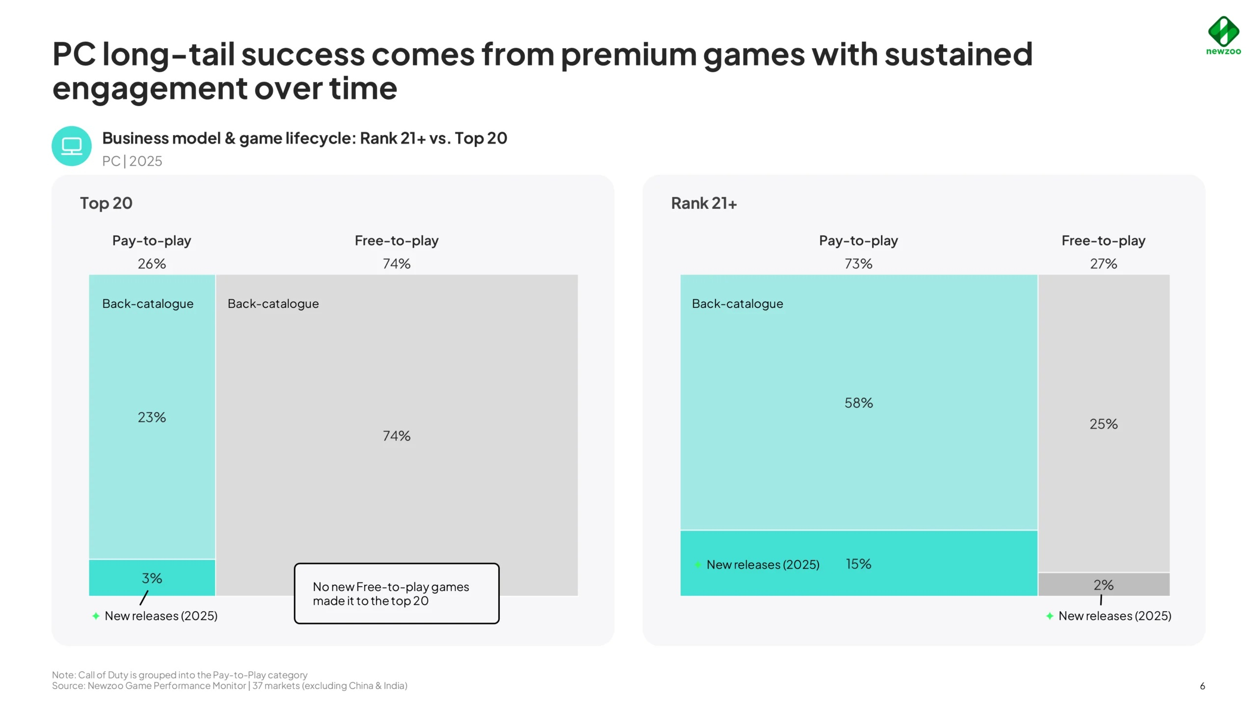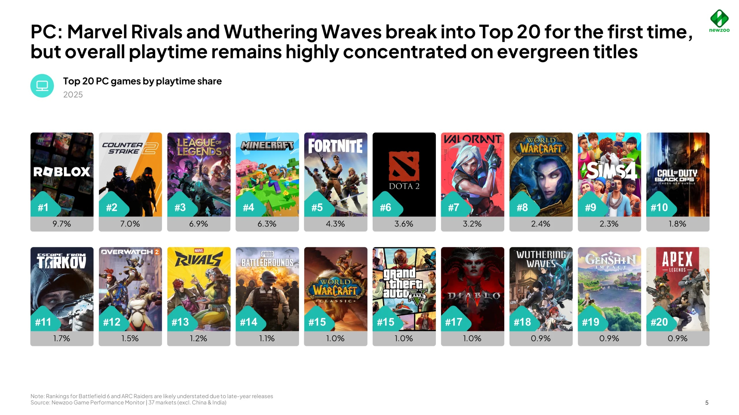 По данным Newzoo, крупнейшие игры всё ещё доминируют на рынке, однако в меньшей степени, чем раньше. Тенденция наблюдается на консолях (PlayStation, Xbox) и в особой степени на ПК.