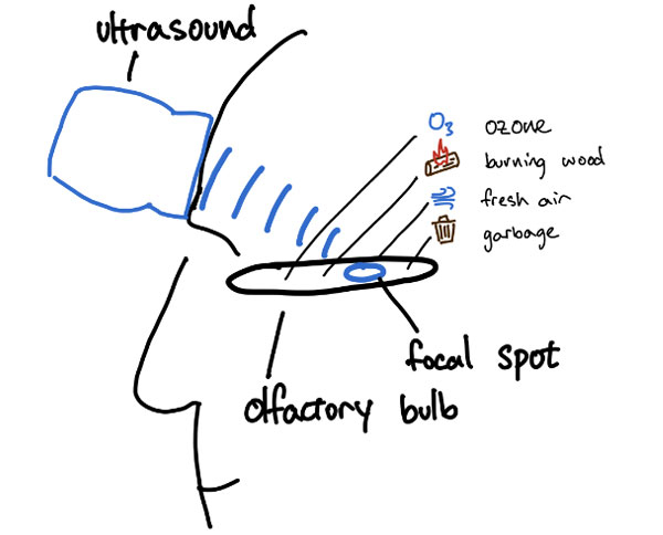 Новый подход к имитации ароматов радикально отличается от привычного: вместо химического воздействия на нос ультразвуковой сигнал через череп напрямую направляется на обонятельную луковицу в мозге. Это первое в мире подобное исследование, которое пока даже не проводилось на животных. Проект задумали и осуществляют четверо специалистов своего дела: предприниматель в сфере нейротехнологий Лев Чижов, учёный из Калтеха Альберт Ян-Хуанг (Albert Yan-Huang), а также два программиста — Томас Рибейро и Ааюш Гупта (Thomas Ribeiro, Aayush Gupta).