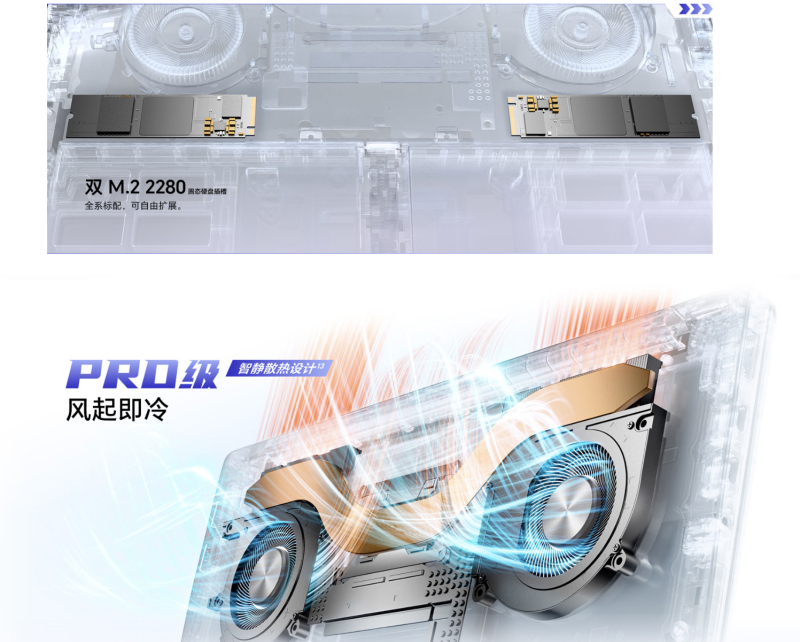 В оснащение лэптопа входят 32 Гбайт оперативной памяти LPDDR5X и NVMe-накопитель M.2 2280 ёмкостью 1 Тбайт. Есть второй свободный слот M.2.