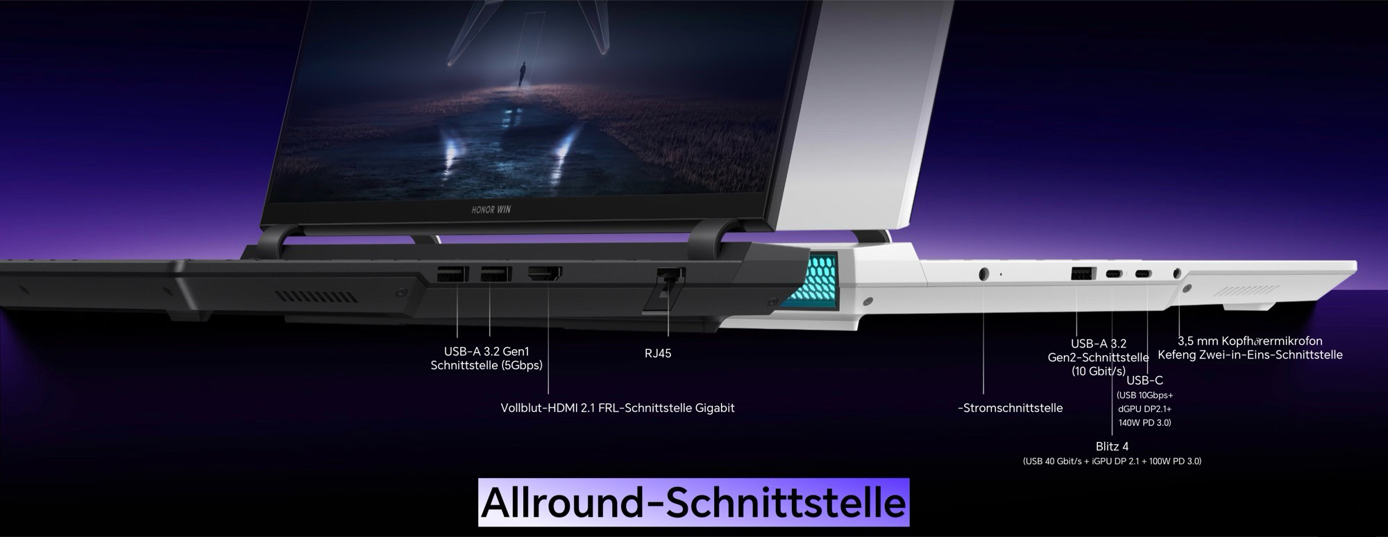 Honor Win H9 нельзя назвать компактным: его толщина составляет 2,68 сантиметра, а вес — 2,38 килограмма. Однако дополнительное пространство внутри лэптопа используется для размещения особенно мощной системы охлаждения. Комбинация из двух больших вентиляторов и пяти медных тепловых трубок уже знакома по многим игровым ноутбукам конкурентов, но компания Honor добавила ещё четыре мини-вентилятора в задней части корпуса.