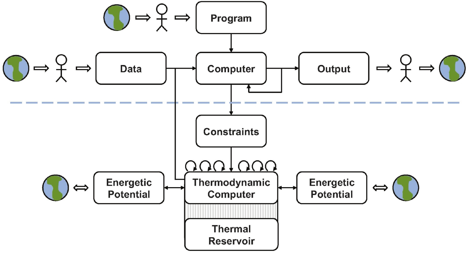Концептуальная схема термодинамической вычислительной системы. Сверху — классический компьютер: физический агрегат, производящий в виртуальном пространстве идеальные (с поправкой на неизбежность порождаемых несовершенством своей аппаратной части ошибок, конечно) математические операции. Он полностью зависит от людей: только благодаря им — создающим его логические контуры, подготавливающим и вводящим данные — он контактирует с реальным миром. Снизу — термодинамический вычислитель с не зависящим напрямую от человека (дизайнера микросхемы, программиста и т. п.) доступом к окружающей среде. Он в процессе вычислений подвержен сложной, многоуровневой, рекуррентной и адаптивной эволюции, которую люди могут лишь направлять — задавая определённые ограничения на его связи с окружающей средой. Вдобавок ТДВ реализует и обратную связь со своим окружением, воздействуя на энергетические потенциалы, которые могут использоваться в качестве входных данных (источник: CCC)