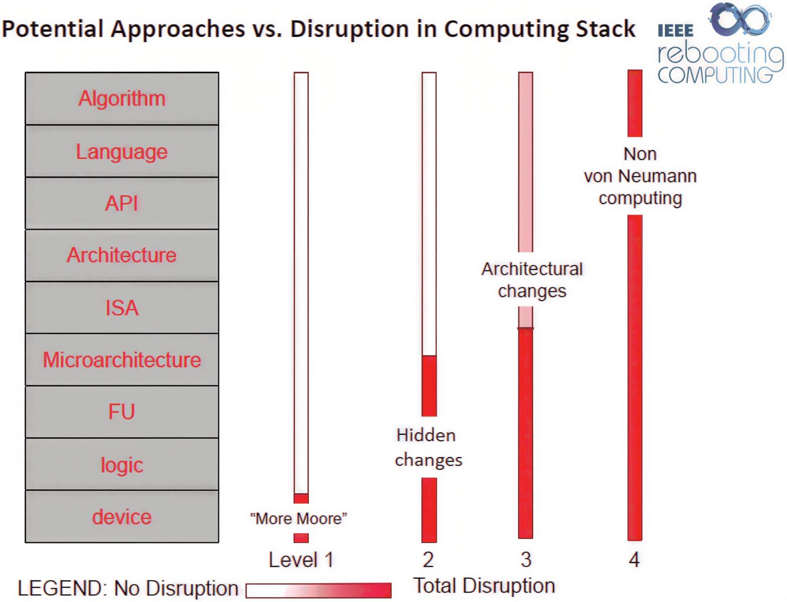Наглядное изображение эффективности четырёх различных подходов к совершенствованию вычислений. Каждый подход затрагивает больше уровней вычислительной системы, чем предыдущий, и вносит в неё больше возмущений (disruption), влекущих за собой серьёзную перестройку аппаратно-программной архитектуры. Термодинамические вычисления, которые производятся вразрез с принципами фон Неймана, относятся к категории 4, так что для их внедрения придётся глубоко перелопатить все уровни существующей вычислительной архитектуры (источник: IEEE Rebooting Computing)
