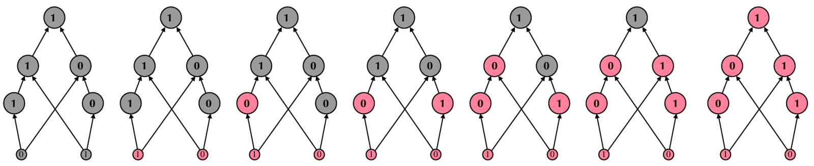 Последовательное изменение энтропии небольшого модельного логического контура в ходе вычислений. Схема начинает работу в состоянии, унаследованном от предыдущего запуска (серые кружки), при этом все значения вентилей исходно взаимосвязанны (и потому суммарная энтропия системы невелика), поскольку предыдущий запуск уже привёл к получению логически детерминированного результата. Затем данные на входах обновляются (розовые кружки), их значения теперь не связаны логически с теми, что сохранены в остальных ячейках схемы, — энтропия контура повышается. По мере того, как вентили последовательно срабатывают, происходит откат уровня энтропии до минимального через формирование логических корреляций между ячейками по мере выполнения вычислений — что естественным образом ведёт к выделению тепла (источник: arxiv.org/abs/2504.04031v3)
