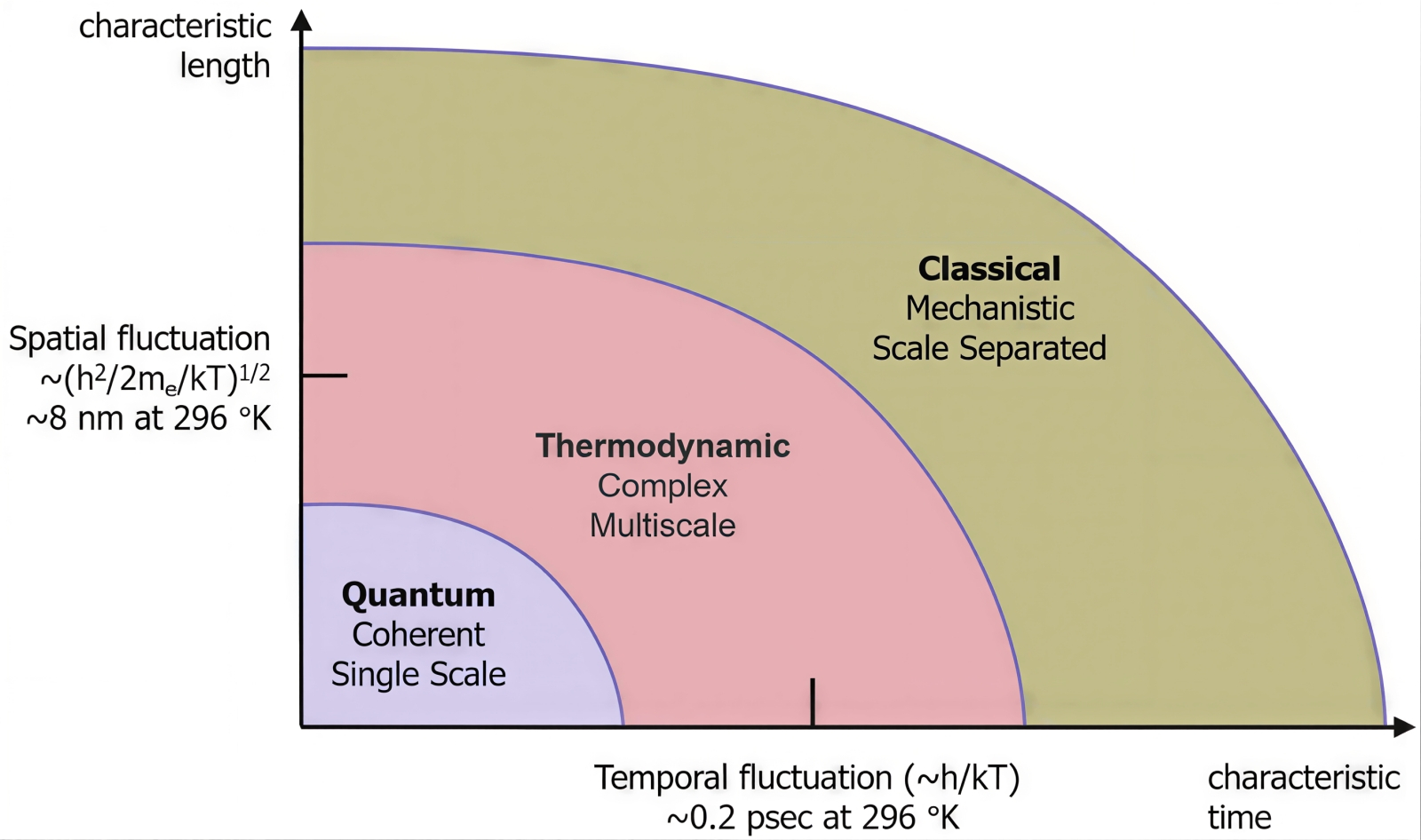 В координатах «характерное время выполнения операции — характерный размер вычислительного элемента» термодинамические вычислители занимают промежуточное место между классикой на основе принципов фон Неймана и квантовыми системами (источник: CCC)