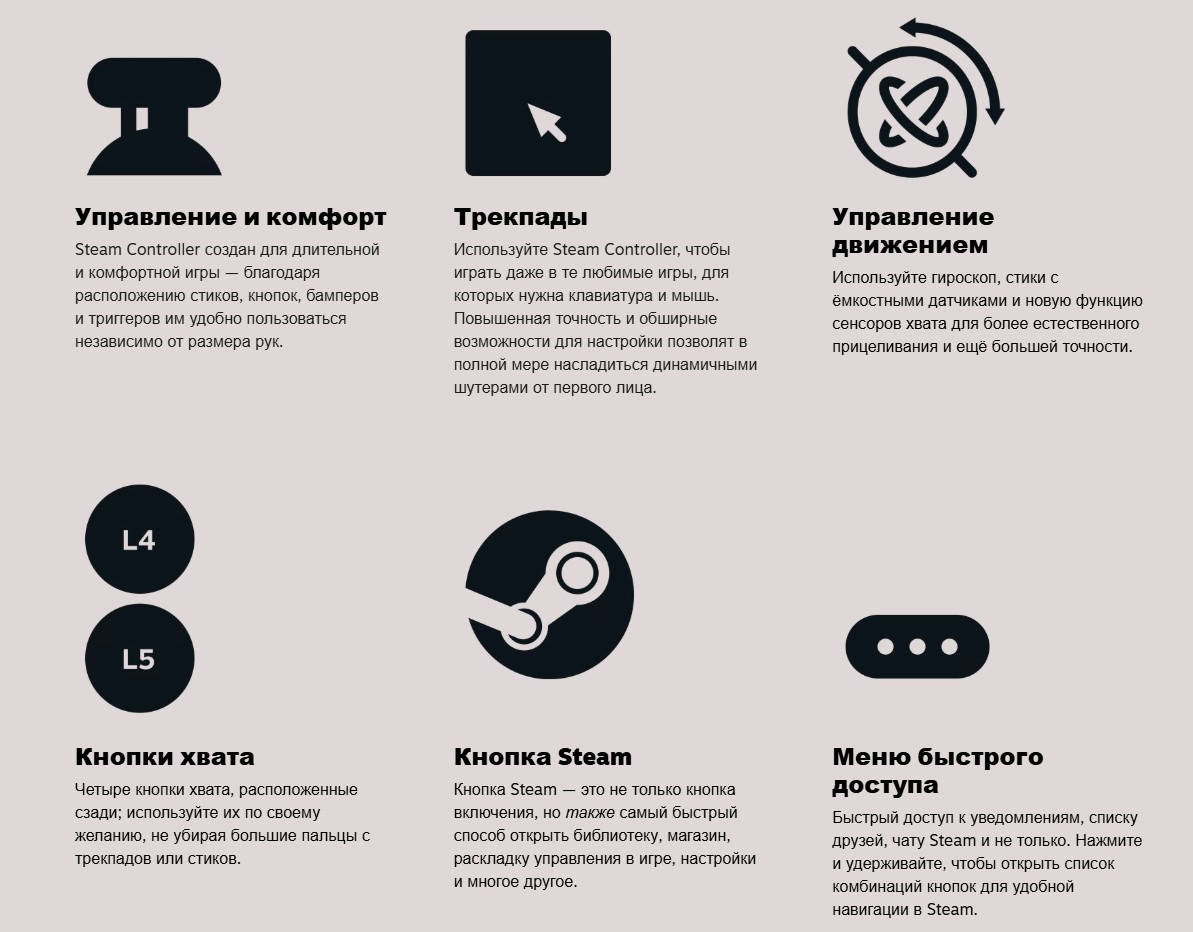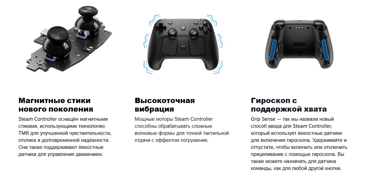 Valve разработала Steam Controller в качестве универсального игрового манипулятора для экосистемы Steam. Он поддерживает ПК, ноутбуки, портативные приставки Steam Deck, домашнюю консоль Steam Machine, а также VR-гарнитуру Steam Frame.