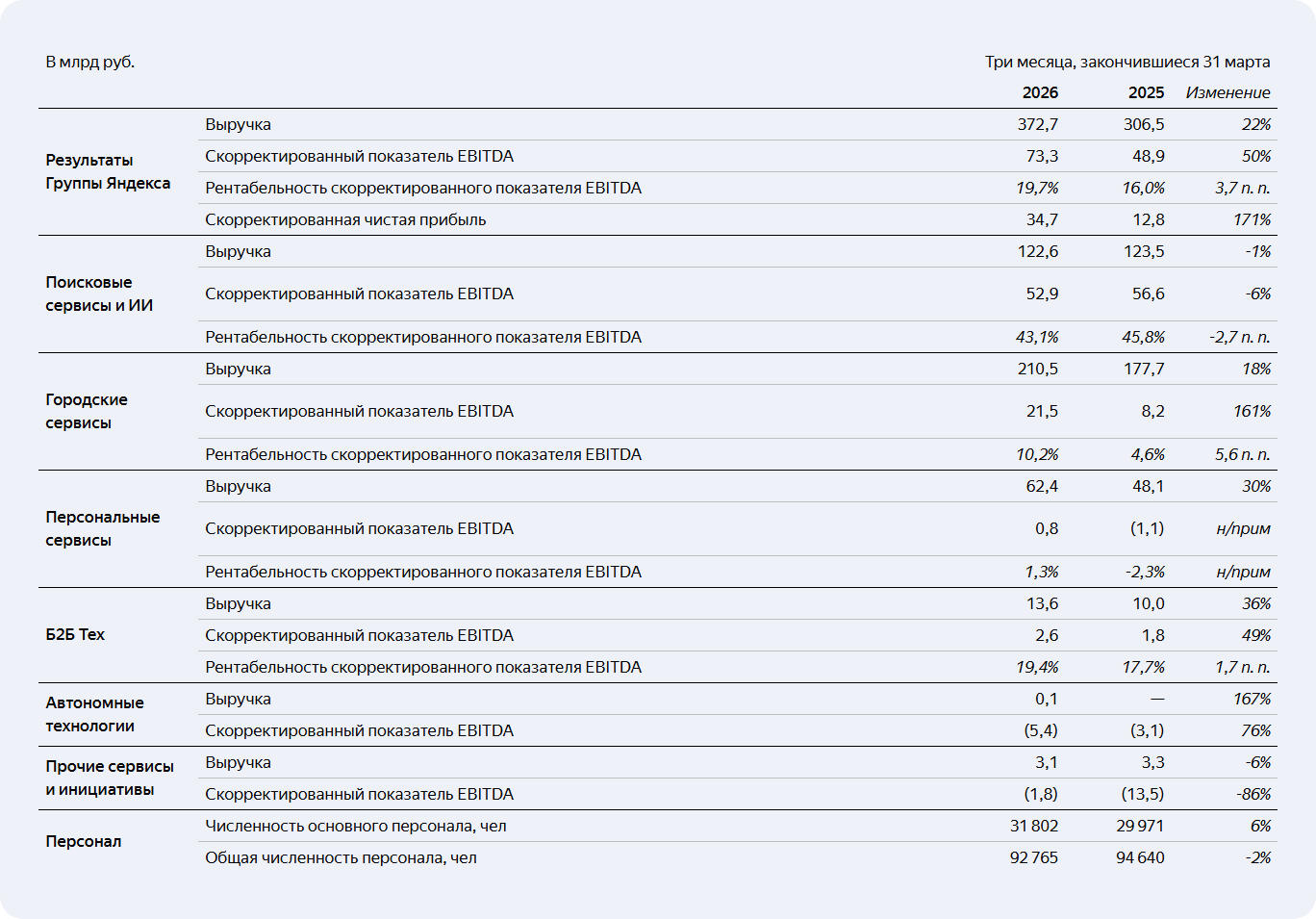 Выручка «Яндекса» за I квартал составила 372,7 млрд руб., что соответствует росту на 22 % год к году; показатель EBITDA за тот же период увеличился на 50 % до 73,3 млрд руб., что составляет 19,7 % от выручки или на 3,7 п.п. больше, чем за аналогичный период прошлого года. Скорректированная чистая прибыль достигла 34,7 млрд руб. — в 2,7 раза больше, чем годом ранее. На 9 % до 115,4 млрд руб. увеличился оборот от услуг по рекламе и продвижению. Выручка от подписки «Яндекс Плюс» выросла на 29 % и составила 25,9 млрд руб. Принято решение о выплате дивидендов по итогам 2025 года из расчёта 110 руб. за акцию или всего 42 млрд руб.; будет также рассмотрен вопрос об обратном выкупе акций для программы мотивации сотрудников — в ближайшие два года на это планируется направить до 50 млрд руб.