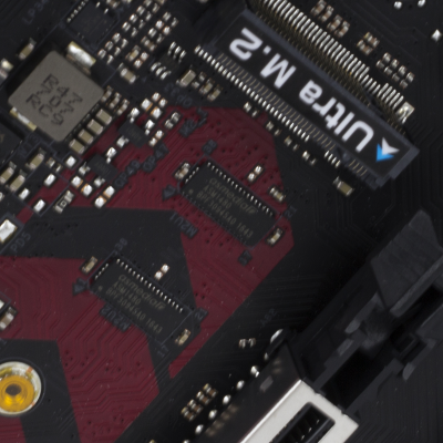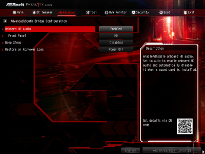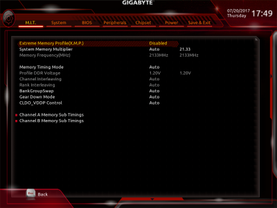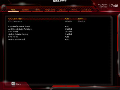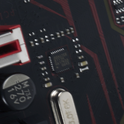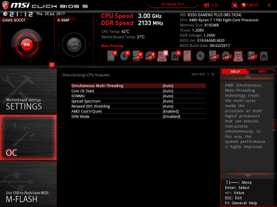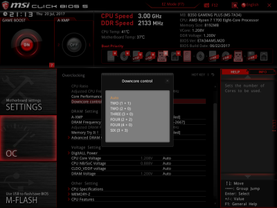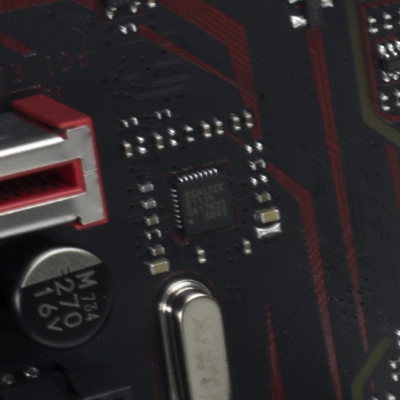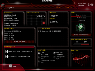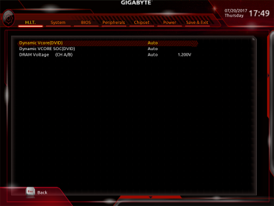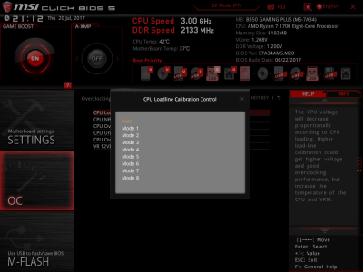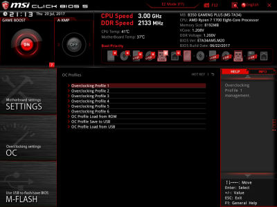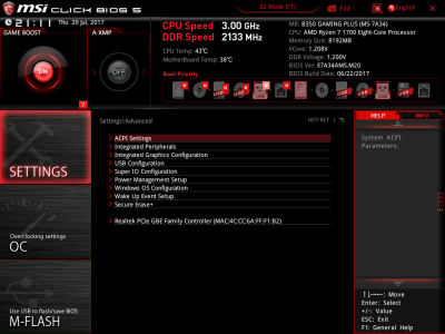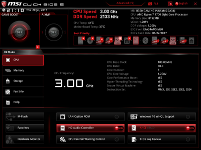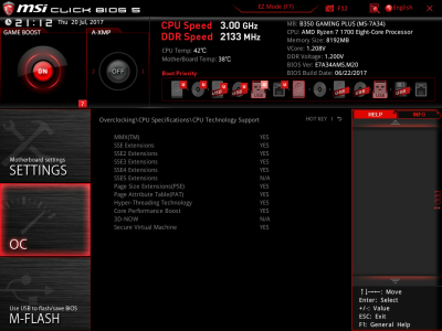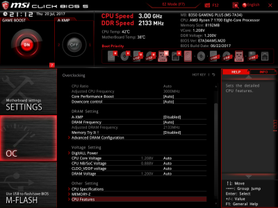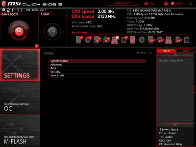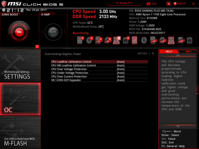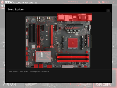 Наконец, MSI B350 GAMING PLUS получила довольно-таки стандартный набор контроллеров Realtek: за сеть отвечает RTL8111H, а за звук — ALC892. Аудиотракт дополнительно «усилен» конденсаторами японской компании Chemi-Con. Левый и правый каналы проведены по разным слоям печатной платы. Подсистема питания MSI B350 GAMING PLUS насчитывает шесть фаз, а управляет ей ШИМ-контроллер Richtek RT8894A. Точно такой же PWM-чип используется, например, в более навороченной плате MSI X370 Krait Gaming. Четыре канала отвечают за процессорное напряжение, еще две фазы — за CPU NB/SoC Voltage. В первом случае применяются три MOSFET и один дроссель, во втором — два полевых транзистора и одна катушка индуктивности. В цепи используются элементы PK616BA и PK632BA от Niko Semiconductor. На таких же элементах и с тем же количеством фаз собрана MSI Z270-A PRO. Все MOSFET конвертера питания охлаждаются двумя небольшими радиаторами. В отличие от плат ASRock и ASUS, используется более эффективное винтовое крепление, но в целом система охлаждения MSI B350 GAMING PLUS не выделяется из «толпы». Под нагрузкой компоненты VRM-цепи нагреваются до 70-85 градусов Цельсия. А это означает, что перед нами, по всей видимости, еще одна материнская плата, которая не справится с разгоном Ryzen 7 1700. MSI UEFI BIOS
