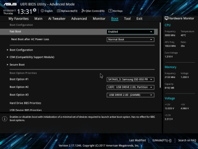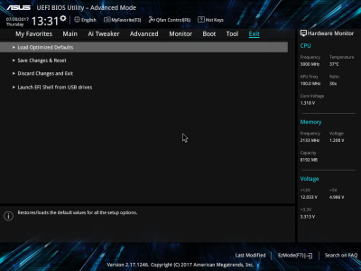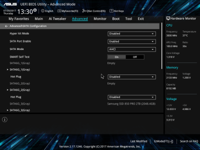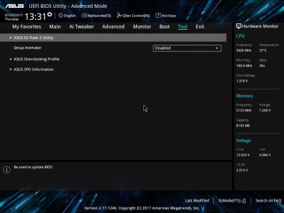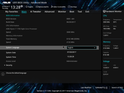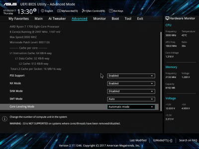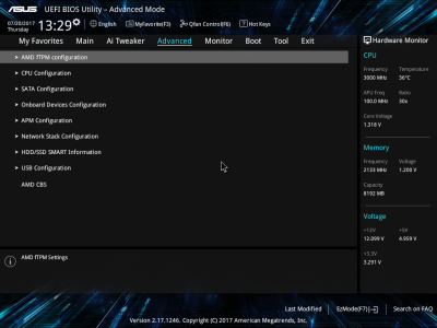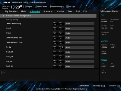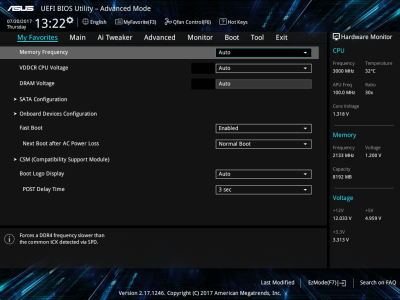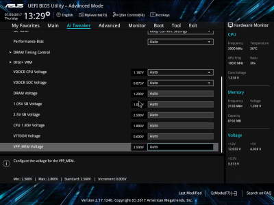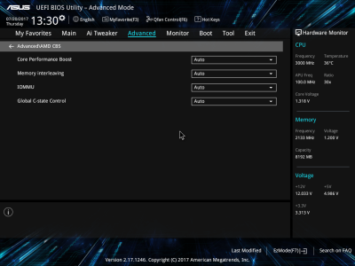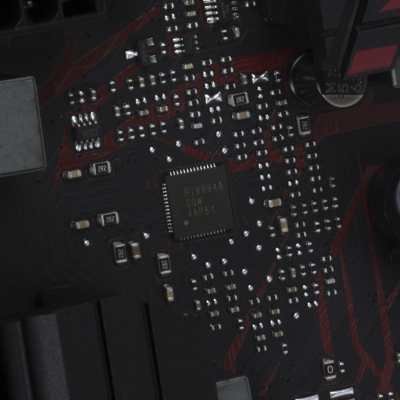 Смотреть все изображения (10) Аудиоподсистема, в основе которой лежит чип Realtek ALC887, дополнена четырьмя японскими конденсаторами Nichicon. К тому же левый и правый каналы расположены на разных слоях печатной платы. Подсистема питания ASUS PRIME B350-PLUS насчитывает шесть фаз, которые управляются ШИМ-контроллером ASP1106. Четыре канала предназначены для ядер центрального процессора. На каждую такую фазу приходится по одному дросселю и по три силовых элемента NTMFS4C09B и NTMFS4C06B от ON Semiconductor. Еще два канала обеспечивают работу CPU NB/SoC Voltage. Здесь на каждую фазу тоже приходится по одной катушке индуктивности, но уже по четыре полевых транзистора. Все MOSFET конвертера питания снабжены дополнительным охлаждением в виде двух небольших алюминиевых радиаторов. Под нагрузкой, без разгона, VRM-зона греется не сильно — температура дросселей и полевых транзисторов меняется без дополнительного охлаждения в диапазоне от 70 до 86 градусов Цельсия. ASUS UEFI BIOS