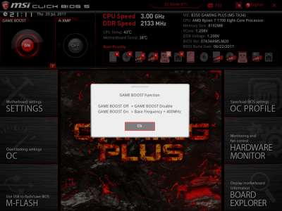 Смотреть все изображения (16) В MSI B350 GAMING PLUS используется хорошо известный нам Click BIOS 5. Схожая прошивка применяется, например, в материнской плате MSI X370 XPower Gaming Titanium. Фирменные опции, такие как GAME BOOST, Hardware Monitor и Board Explorer, никуда не делись. Отличия в основном заключаются в меньшем количестве оверклокерских «примочек» и возможности более детально изменять напряжения.