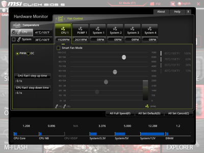 При этом GIGABYTE GA-AB350-GAMING 3 дает возможность изменять напряжение только для трех параметров системы: CPU Vcore, Vcore SOC и DRAM Voltage. Напряжения, подаваемые на ядра процессора и его SOC-составляющую, изменяются только в режиме Offset в диапазоне от -0,3 до +0,3 В с шагом 0,006 В. Выбор какого-либо уровня Load-Line Calibration не предусмотрен. Не имеет прошивка GIGABYTE GA-AB350-GAMING 3 и заготовленных производителем режимов автоматического разгона CPU. Только в программе EasyTune можно активировать пресет OC, который увеличивает частоту Ryzen 7 1700 до 3,8 ГГц для всех восьми ядер. Что ж, в таком режиме система работает нестабильно. С ручным разгоном, правда, тоже все вышло не так гладко. Во-первых, заставить работать хотя бы один из имеющихся комплектов оперативной памяти на частоте выше 2666 МГц мне так и не удалось. Во-вторых, перегрев подсистемы питания приводил к постоянному сбросу частоты центрального процессора в Prime95 до 549 МГц: 4 ГГц — мимо, 3,9 ГГц — опять неудача. Стабильные 3,8 ГГц я получил только после установки в систему еще одного вентилятора, дополнительно обдувающего конвертер питания, и увеличения напряжения CPU Vcore относительно номинального значения на 0,126 В. ⇡#MSI B350 GAMING PLUSMSI B350 GAMING PLUS — это единственная модель в тесте, которую создали с применением полноразмерной печатной платы ATX (305 × 244 мм). Поэтому текстолит устройства имеет все девять крепежных отверстий. Да и вообще инженеры MSI подошли к созданию этого устройства весьма прагматично. Мне такой подход нравится. Смотрите, на плате распаяно сразу шесть 4-пиновых разъемов для подключения вентиляторов. Один из разъемов предназначен для подключения помпы СЖО. По заверению производителя, он выдает ток силой до 2 А. Система ловко управляет в том числе «вертушками» с 3-штырьковыми коннекторами. Скорость вращения регулируется как по количеству оборотов в минуту, так и по подаваемому напряжению. Количество оборотов привязывается либо к температуре процессора, либо к датчику System, который показывает температуру чипсета. В этом и заключается прагматичность — на базе MSI B350 GAMING PLUS можно собрать системный блок с большим количеством корпусных вентиляторов и не использовать при этом дополнительные переходники и разветвители. У MSI B350 GAMING PLUS тот же набор слотов расширения, что и у платы ASUS. Только они расположены иным образом. Честно, не знаю, кому в 2017 году пригодится пара портов PCI. Работают они за счет контроллера ASMedia ASM1083. PEG-порты в случае использования Ryzen работают по классической схеме х16+х4. Поддержка технологии CrossFire присутствует. Если же в системе будет задействован хотя бы один из разъемов PCI Express x1, то второй PCI Express x16 перейдет в режим x2. Армирован только один порт PCI Express x16 — тот, в который будет установлена видеокарта. В более дорогих решениях MSI не стесняется «запаковывать» в металл все PEG-порты, а также слоты DIMM. В целом разводка слотов расширения на плате выполнена нормально. Вы можете без каких-либо проблем использовать любой процессорный кулер, и он не будет конфликтовать с установленной дискретной видеокартой. И даже адаптеры с трехслотовыми системами охлаждения не перекроют нижестоящий слот PCI Express x1. Конечно же, MSI B350 GAMING PLUS оснащена подсветкой. Мы видим, что все четыре производителя уделили этому аспекту должное внимание. У платы MSI светится только тракт, дополнительно экранированный от остальных компонентов полосой токонепроводя