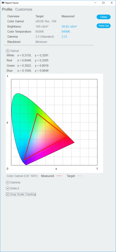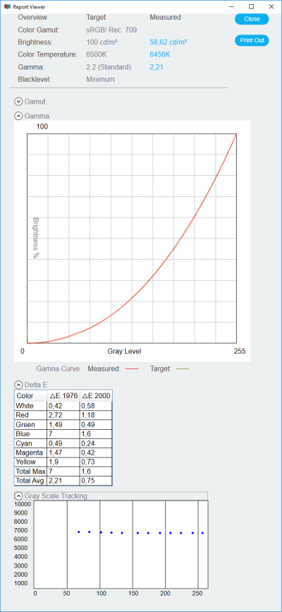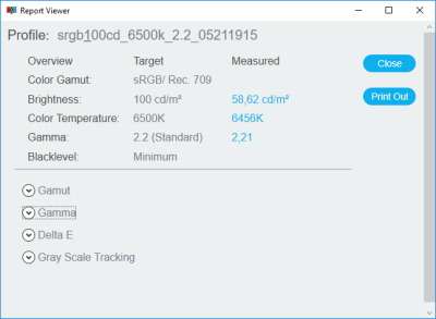 Следует отметить, что по окончанию процесса программа НЕ создаёт ICM/ICC-профиль, как это должно происходить по всем законам жанра, а поэтому операционная система и все программы с поддержкой CMS продолжают находится в неведении о возможностях дисплея. Финальный же отчёт с результатами максимально сжат и не содержит большого количества информации, которая могла бы оказаться полезной. О реальных результатах в ходе проверки сторонними приложениями мы поговорим в следующим разделе.