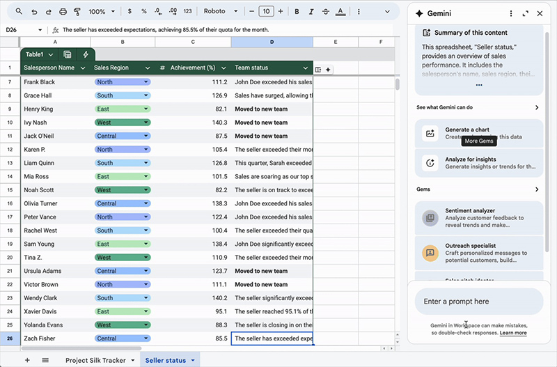 После добавления в январе 2025 года в онлайн-сервис «Google Таблицы» поддержки ИИ-помощника Gemini компания понемногу расширяет возможности его использования в работе с таблицами, добавив возможность создания сводных таблиц, применение фильтров и условное форматирование. В этом месяце Google добавила ещё ряд задач, которые Gemini может выполнять от имени пользователя.