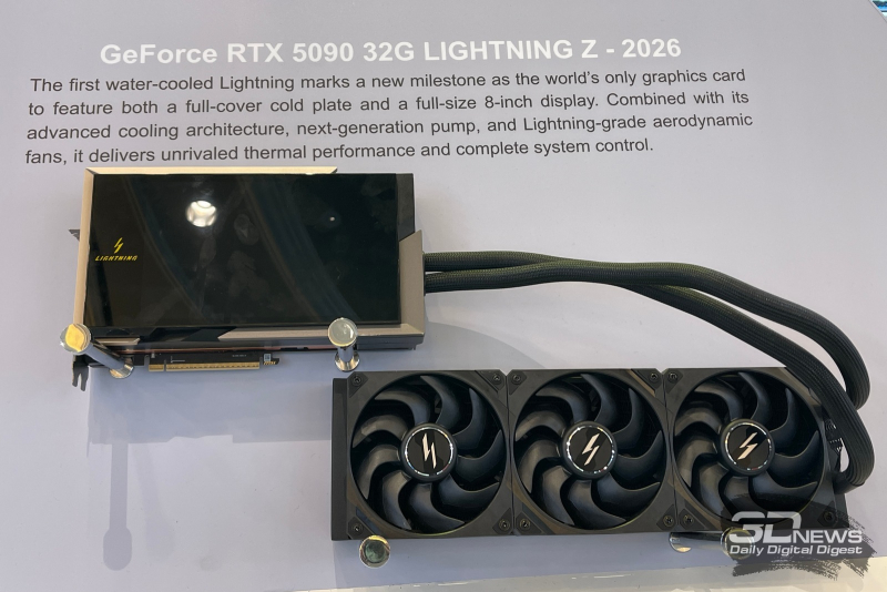 Источник изображений: VideoCardz / MSI Видеокарта оснащена необслуживаемой системой охлаждения. Уникальной новинку делают сразу несколько вещей. Во-первых, GeForce RTX 5090 32G Lightning Z оснащена 8-дюймовым дисплеем, встроенным в кожух водоблока, установленного на видеокарту. Дисплеи такого формата в видеокартах никогда до этого не применялись. Во-вторых, производитель заявляет, что это первая потребительская «видеокарта с TDP более 1000 Вт». Компания официально рекомендует использовать вместе с ней блок питания мощностью не менее 1600 Вт. В технических характеристиках карты также указаны целевые тактовые частоты и режимы питания. Тактовая частота её графического процессора в режиме Boost составляет 2730 МГц, а в режиме «Extreme Performance», доступном через фирменное приложение MSI Center, частота составляет 2775 МГц. Энергопотребление представлено в двух режимах: в режиме OC — 800 Вт, а в режиме Extreme — 1000 Вт. Питание на карту подаётся по двум 12+4-контактным разъёмам 12V-2×6. В комплекте поставки нет никаких переходников с обычных коннекторов PCIe. Компания выделяет в новинке полностью кастомную печатную плату со значительно усиленной подсистемой питания, состоящей из 40 фаз для максимальной надёжности и стабильности при разгоне. Размеры самой видеокарты составляют 260 × 151 × 61 мм, а размеры радиатора СЖО — 394 × 120 × 56 мм. Помимо трёх разъёмов DisplayPort 2.1b и одного HDMI 2.1b, карта оснащена портом USB-C. Но он служит исключительно для подключения 8-дюймового дисплея. MSI также упоминает наличие у карты двойной системы BIOS, поддержку веб-версии приложения Lightning Hub для настройки видеокарты и дисплея, а также мобильное приложение Lightning Overdrive для мониторинга и дополнительных настроек. Карта уже побывала в руках некоторых энтузиастов. MSI заявляет, что на GeForce RTX 5090 32G Lightning Z было установлено 17 мировых рекордов в различных тестах производительности, официально подтверждённых платформами HWbot и 3DMark. Карта будет выпущена в количестве всего 1300 штук. Вероятно, 300 из них окажутся на руках у обозревателей. Старт продаж намечен на февраль этого года. Стоимость видеокарты не сообщается. Asus показала флагманскую GeForce RTX 5090 ProArt с минималистичным дизайном и всего двумя вентиляторами