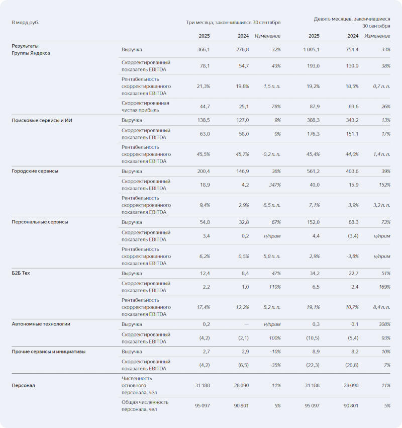 Российский интернет-гигант «Яндекс» опубликовал финансовый отчёт по итогам III квартала 2025 года. Компания увеличила выручку и скорректированный показатель EBITDA (прибыль до вычета налогов, процентов по кредитам и амортизации), а также привела новую схему сегментации бизнеса, призванную более наглядно отразить её деятельность. На 20 млрд руб. повышен прогноз по скорректированному EBITDA за весь 2025 год. Выручка «Яндекса» за III квартал 2025 года составила 366,1 млрд руб., что соответствует росту на 32 % в годовом исчислении, скорректированный EBITDA достиг 78,1 млрд руб. (рост на 43 % в годовом сравнении) — его доля в выручке увеличилась на 1,5 п.п. до 21,3 %. По итогам квартала рекламная выручка компании увеличилась на 11 % до 116 млрд руб., на подписках компания выручила 23 млрд рублей (рост на 48 %). На общем собрании акционеров 9 сентября было принято решение о выплате дивидендов в размере 80 руб. на одну обыкновенную акцию — выплату средств на общую сумму 30,4 млрд руб. завершили 3 октября. Новый сегмент «Поисковые сервисы и ИИ» теперь включает в себя такие направления как «Поиск и портал», «Сервисы объявлений», а также «Алиса и устройства». Выручка в этом сегменте за III квартал составила 138,5 млрд руб. (+9 % по сравнению с аналогичным периодом 2024 года), скорректированный EBITDA — 63,0 млрд руб. (+9 %). Доля «Яндекса» на российском рынке поиска показала рост на 2,5 п.п. до 68 %. На 13,5 % увеличилось число поисковых сессий по темам «Финансы», «Недвижимость», «Медицина» и «Товары». Число действующих устройств с ИИ «Алиса» в России достигло 17,5 млн; на 26 % до 5,3 млн выросло число активных устройств под управлением YaOS и YaOS X. Аудитория «Алисы» в чате, приложении и «Поиске» с июня увеличилась на 6 млн до 47,3 млн пользователей. После расширения возможностей «Алисы» в бесплатном тарифе ежедневная аудитория чата с ИИ выросла пятикратно квартал к кварталу. ![]() Сегмент «Городские сервисы» включает в себя «Электронную коммерцию», «Райдтех», «Доставку» и другие O2O-службы. За минувший квартал выручка здесь составила 200,4 млрд руб. (+34 %), скорректированный EBITDA — 18,9 млрд руб. (+347 %); рекламная выручка выросла на 58 % до 115 млрд руб. Аудитория сегмента увеличилась на 18 % до 58,4 млн человек. В сентябре компания представила подписку «Яндекс Движ», предлагающую удобные условия при пользовании сервисами «Яндекс Драйв», «Бери Заряд» и при аренде самокатов. В сегмент «Персональные сервисы» вошли «Финансовые сервисы», «Плюс и развлекательные сервисы», «Свои Плюсы» и другие службы. Выручка по сегменту выросла на 67 % до 54,8 млрд руб., скорректированный EBITDA составил 3,4 млрд руб. Число активных пользователей финансовых сервисов увеличилось в 1,6 раза, оборот — в 1,8 раза. На 25 % до 44,9 млн выросло количество подписчиков «Яндекс Плюса»; число читающих и слушающих «Яндекс Книги» подписчиков составило 6 млн; аудитория «Яндекс Музыки» — 30,5 млн (+32 %); фильмы, сериалы и спортивные трансляции на «Кинопоиске» смотрят 17 млн (+32 %) подписчиков «Яндекс Плюса» в месяц. Выручка сегмента «Б2Б Тех» выросла на 47 % до 12,4 млрд руб., скорректированный EBITDA — на 110 % до 2,2 млрд руб. Число клиентов Yandex Cloud увеличилось на 31 % до 47 тыс.; 55 % выручки принесли крупные компании. Более 190 тыс. организаций оформили подписку «Яндекс 360» — ежемесячная аудитория этих сервисов достигла 93 млн человек; выручка по данному направлению за год выросла в 1,6 раза. Сегмент «Автономны