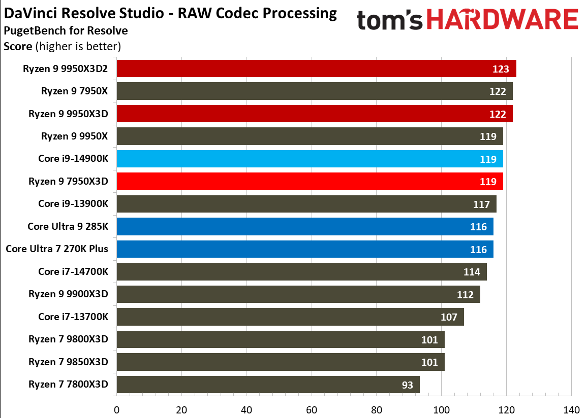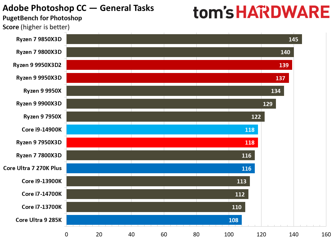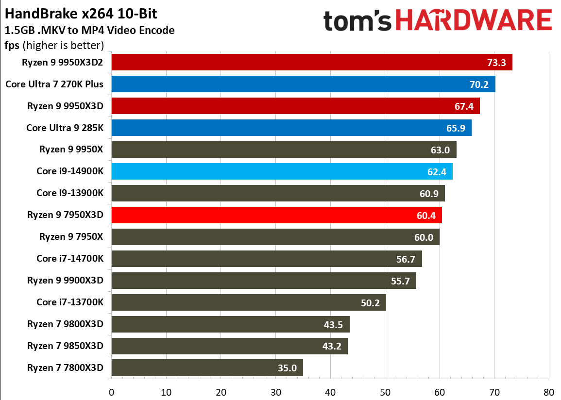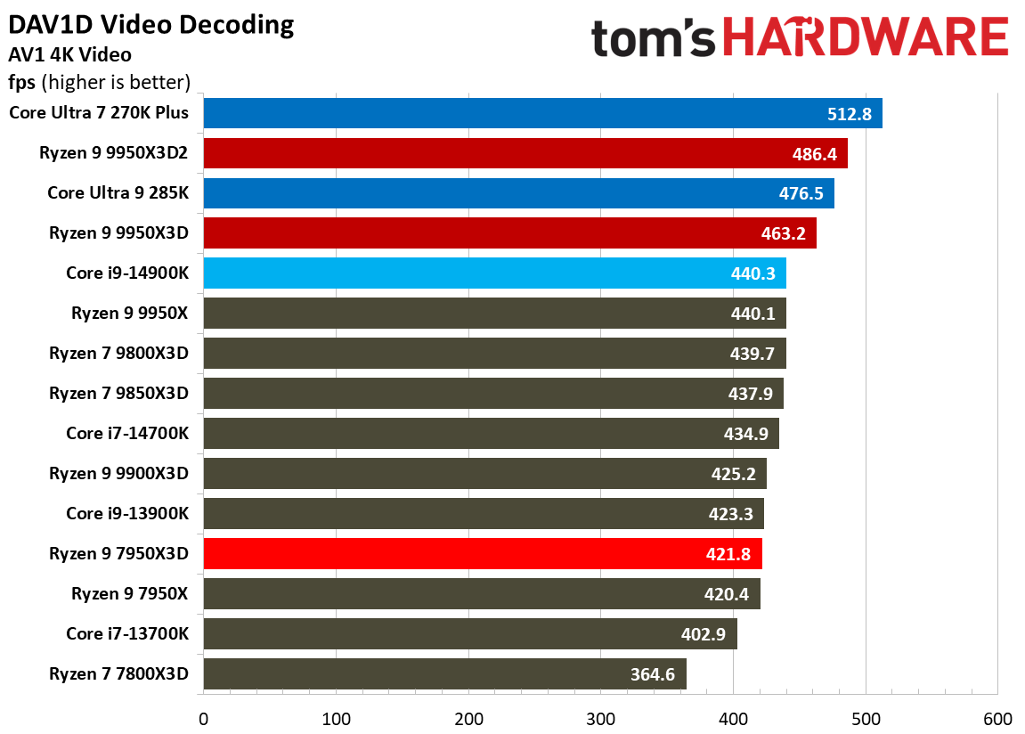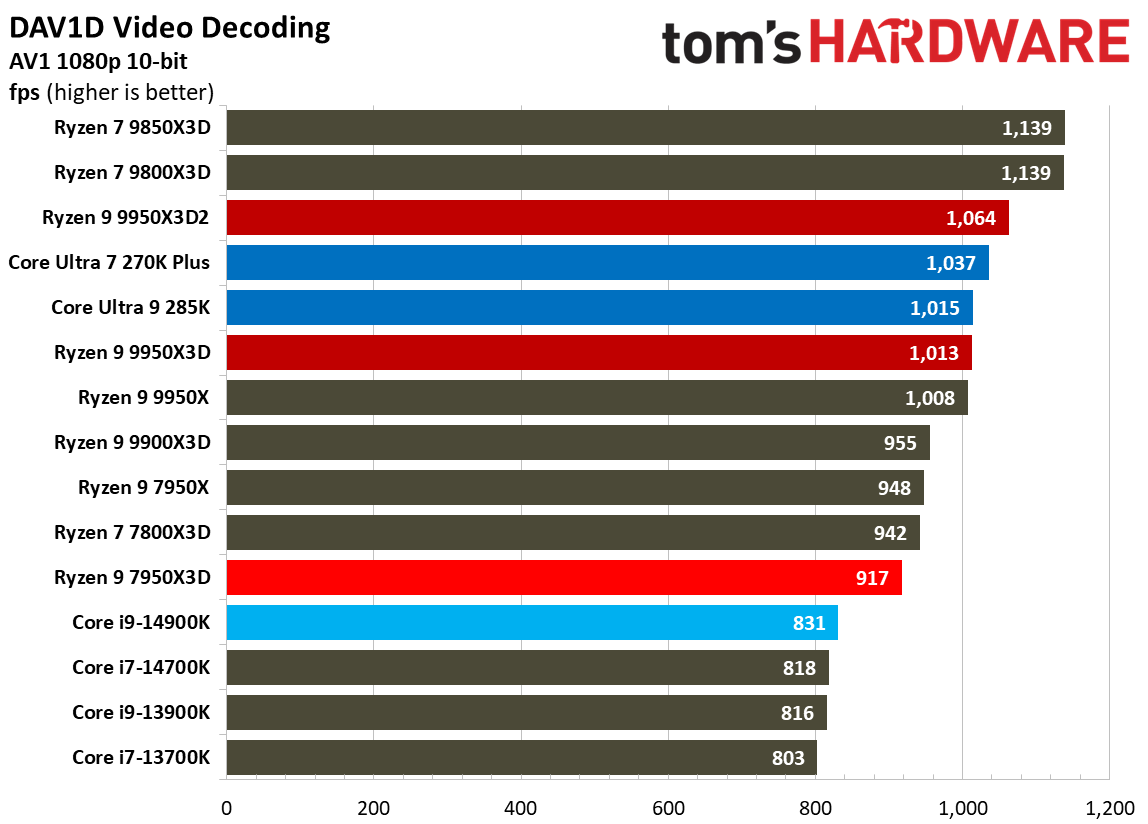 При 10-битном кодировании x265 с помощью HandBrake процессор Ryzen 9 9950X3D2 справился с задачей на 2,3 % быстрее, чем версия с одним кристаллом дополнительного кеша. В тесте AV1 он показал на 6,4 % более высокую частоту кадров в секунду, а при использовании x264 производительность Ryzen 9 9950X3D2 была на 8,7 % выше, чем у Ryzen 9 9950X3D. При декодировании с помощью декодера dav1d процессор Ryzen 9 9950X3D2 показал на 5 % более высокую скорость при разрешении 4K и 1080p по сравнению с Ryzen 9 9950X3D. В Photoshop Ryzen 9 9950X3D2 опережает версию с одним дополнительным кристаллом кеш-памяти на 1,7 % и базовую версию 9950X — на 3,1 %. В Premiere Pro ситуация меняется не только с учётом более доминирующей позиции Intel, но и с учётом динамики между 9950X3D2 и 9950X3D. В тесте Premiere новый Ryzen 9 9950X3D2 оказался медленнее Ryzen 9 9950X3D, хотя и всего на 0,7 %. В DaVinci Resolve модель Ryzen 9 9950X3D2 опережает 9950X3D на 2,8 %. С остальными результатами тестов продуктивной производительности можно ознакомиться в галерее выше, а также в обзоре Tom's Hardware. Согласно результатам игровых тестов Tom’s Hardware, Ryzen 9 9950X3D2 действительно быстрее версии Ryzen 9 9950X3D с одним кристаллом дополнительной кеш-памяти 3D V-Cache. Но эта разница составляет всего 0,8 % в среднем и 1,3 % — в лучшем случае. Такой незначительный прирост позволяет говорить, что игровая производительность у чипов фактически одинаковая. Игровые тесты (разрешение 1080p)