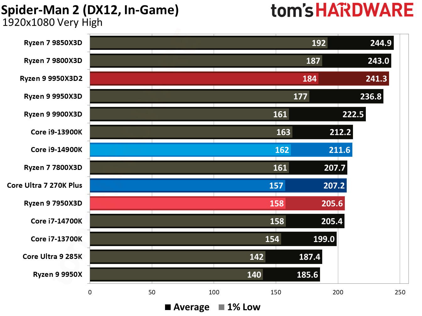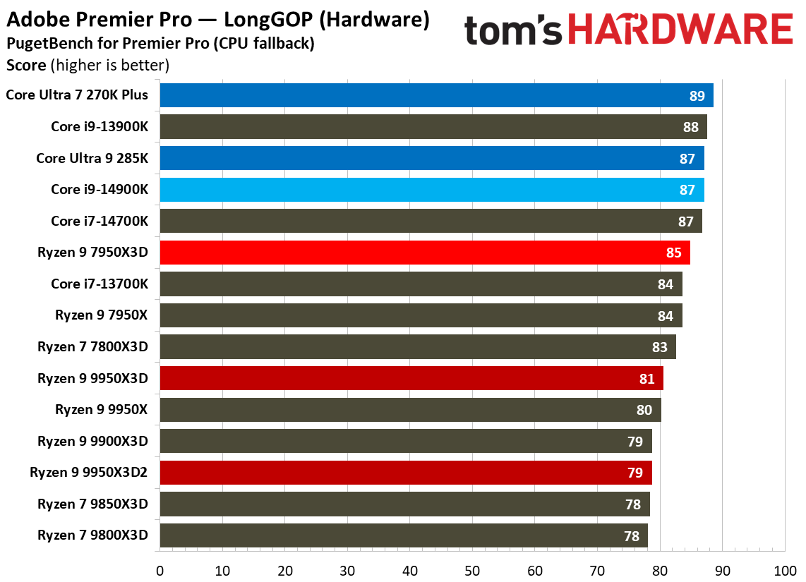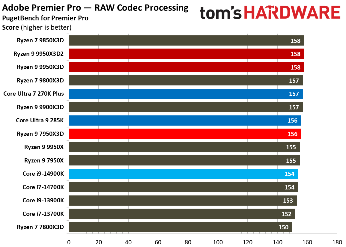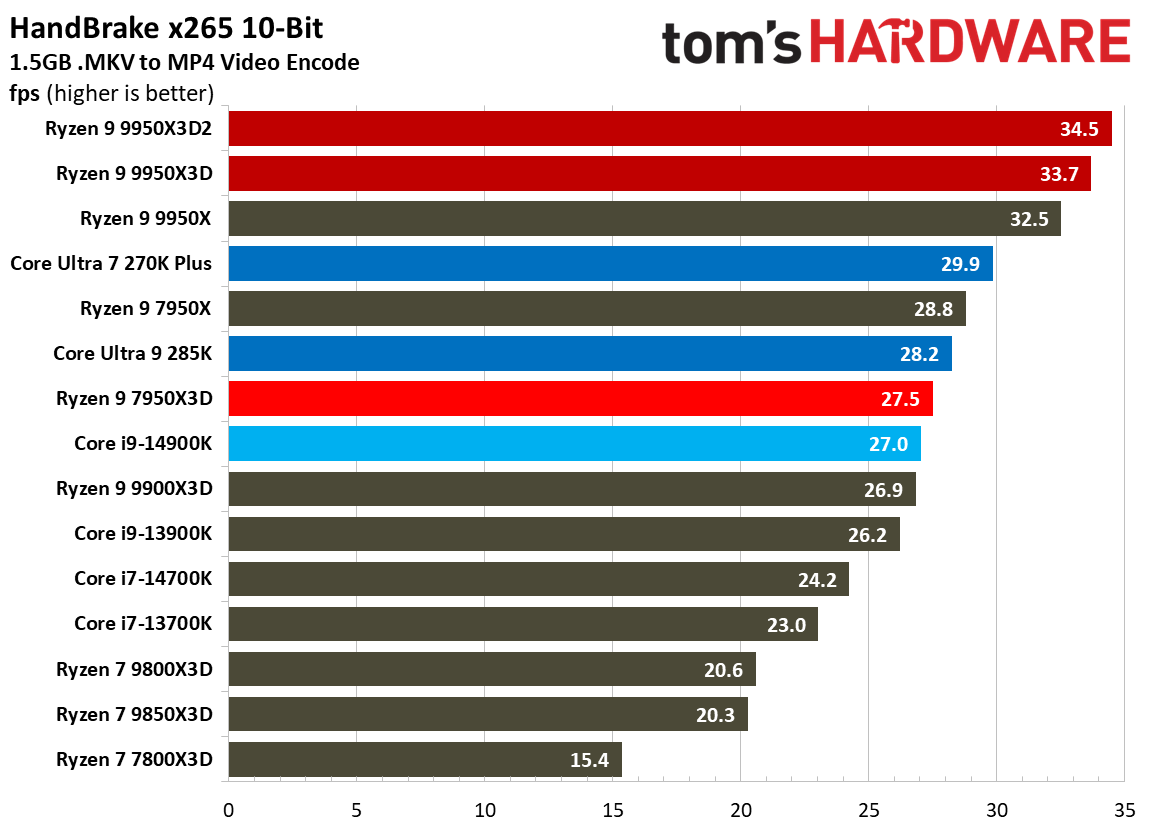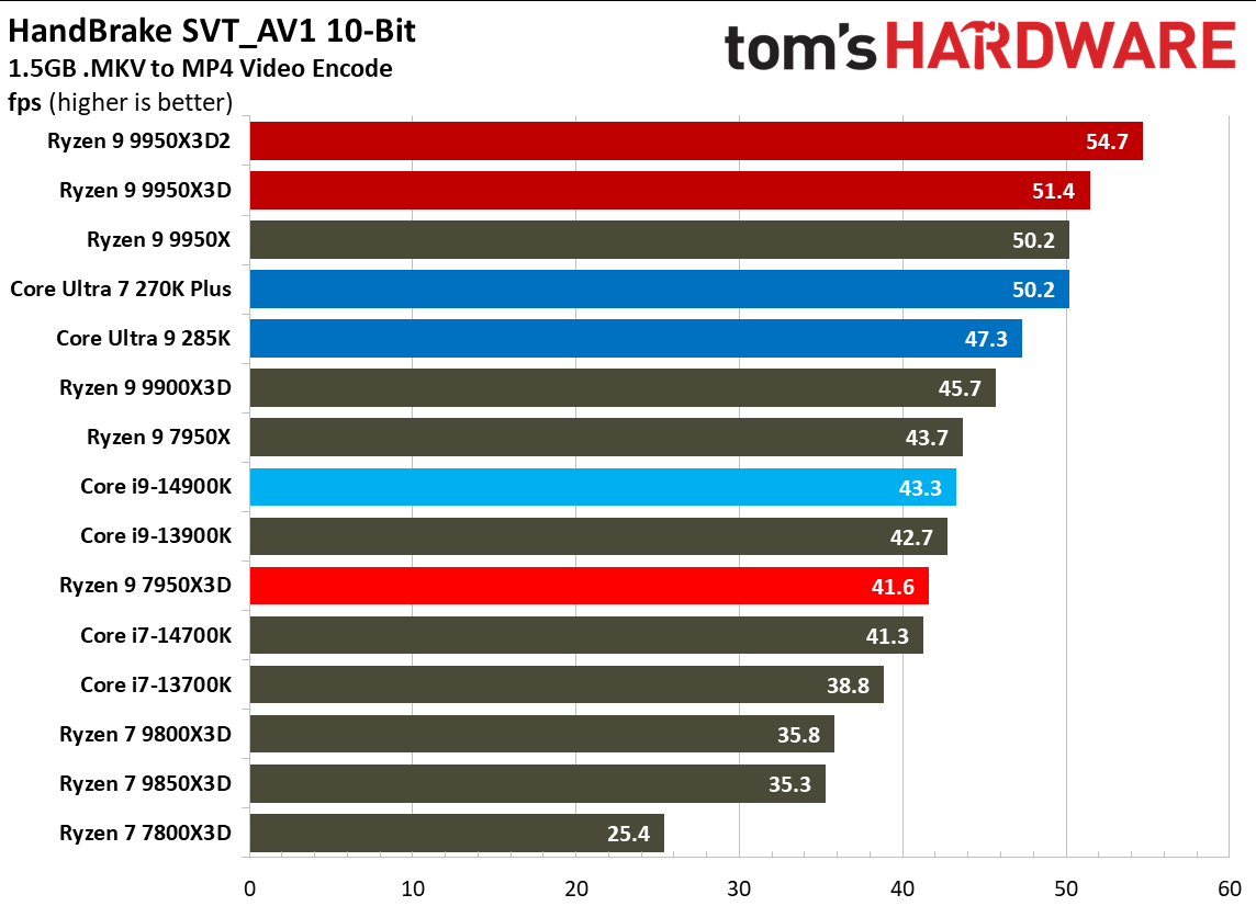 При 10-битном кодировании x265 с помощью HandBrake процессор Ryzen 9 9950X3D2 справился с задачей на 2,3 % быстрее, чем версия с одним кристаллом дополнительного кеша. В тесте AV1 он показал на 6,4 % более высокую частоту кадров в секунду, а при использовании x264 производительность Ryzen 9 9950X3D2 была на 8,7 % выше, чем у Ryzen 9 9950X3D. При декодировании с помощью декодера dav1d процессор Ryzen 9 9950X3D2 показал на 5 % более высокую скорость при разрешении 4K и 1080p по сравнению с Ryzen 9 9950X3D. В Photoshop Ryzen 9 9950X3D2 опережает версию с одним дополнительным кристаллом кеш-памяти на 1,7 % и базовую версию 9950X — на 3,1 %. В Premiere Pro ситуация меняется не только с учётом более доминирующей позиции Intel, но и с учётом динамики между 9950X3D2 и 9950X3D. В тесте Premiere новый Ryzen 9 9950X3D2 оказался медленнее Ryzen 9 9950X3D, хотя и всего на 0,7 %. В DaVinci Resolve модель Ryzen 9 9950X3D2 опережает 9950X3D на 2,8 %. С остальными результатами тестов продуктивной производительности можно ознакомиться в галерее выше, а также в обзоре Tom's Hardware. Согласно результатам игровых тестов Tom’s Hardware, Ryzen 9 9950X3D2 действительно быстрее версии Ryzen 9 9950X3D с одним кристаллом дополнительной кеш-памяти 3D V-Cache. Но эта разница составляет всего 0,8 % в среднем и 1,3 % — в лучшем случае. Такой незначительный прирост позволяет говорить, что игровая производительность у чипов фактически одинаковая. Игровые тесты (разрешение 1080p)