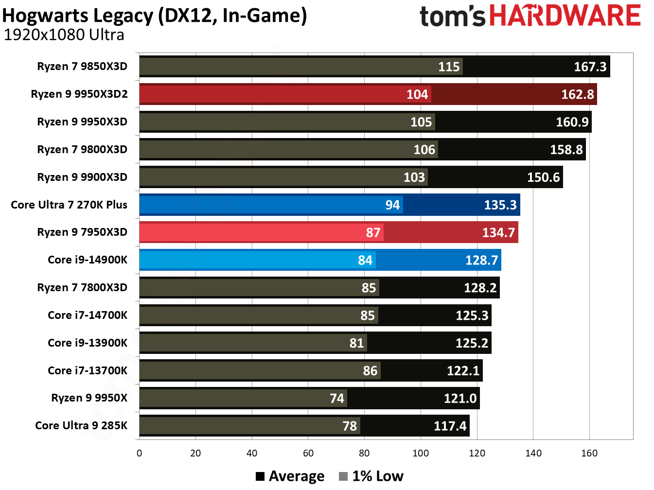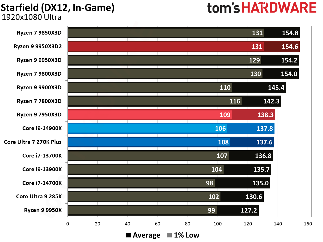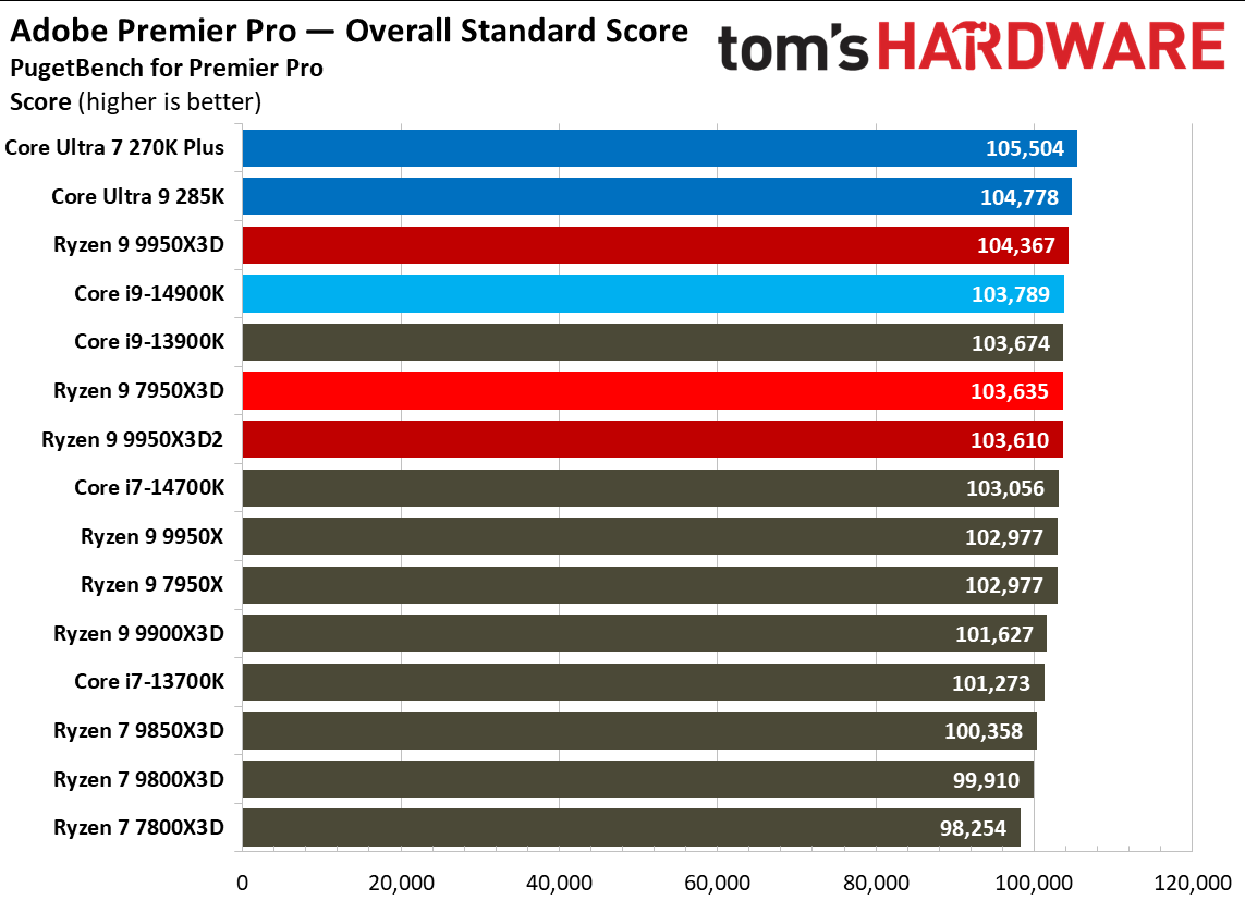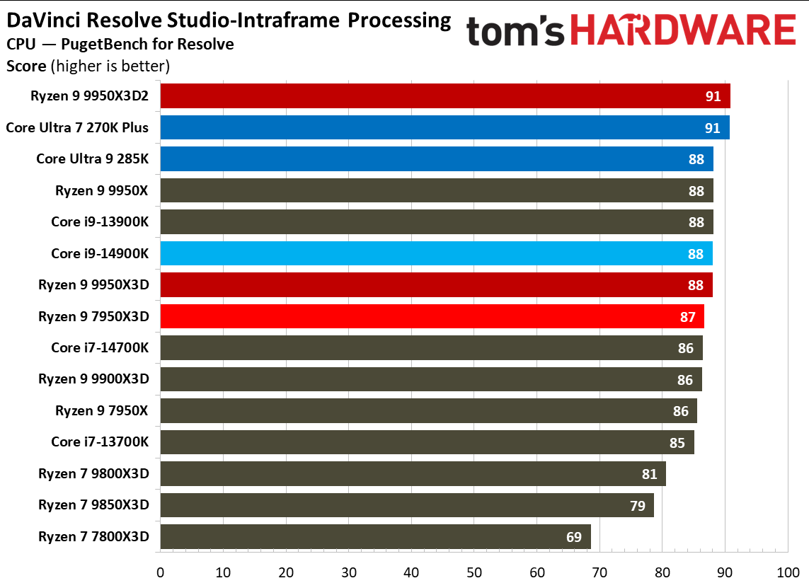 При 10-битном кодировании x265 с помощью HandBrake процессор Ryzen 9 9950X3D2 справился с задачей на 2,3 % быстрее, чем версия с одним кристаллом дополнительного кеша. В тесте AV1 он показал на 6,4 % более высокую частоту кадров в секунду, а при использовании x264 производительность Ryzen 9 9950X3D2 была на 8,7 % выше, чем у Ryzen 9 9950X3D. При декодировании с помощью декодера dav1d процессор Ryzen 9 9950X3D2 показал на 5 % более высокую скорость при разрешении 4K и 1080p по сравнению с Ryzen 9 9950X3D. В Photoshop Ryzen 9 9950X3D2 опережает версию с одним дополнительным кристаллом кеш-памяти на 1,7 % и базовую версию 9950X — на 3,1 %. В Premiere Pro ситуация меняется не только с учётом более доминирующей позиции Intel, но и с учётом динамики между 9950X3D2 и 9950X3D. В тесте Premiere новый Ryzen 9 9950X3D2 оказался медленнее Ryzen 9 9950X3D, хотя и всего на 0,7 %. В DaVinci Resolve модель Ryzen 9 9950X3D2 опережает 9950X3D на 2,8 %. С остальными результатами тестов продуктивной производительности можно ознакомиться в галерее выше, а также в обзоре Tom's Hardware. Согласно результатам игровых тестов Tom’s Hardware, Ryzen 9 9950X3D2 действительно быстрее версии Ryzen 9 9950X3D с одним кристаллом дополнительной кеш-памяти 3D V-Cache. Но эта разница составляет всего 0,8 % в среднем и 1,3 % — в лучшем случае. Такой незначительный прирост позволяет говорить, что игровая производительность у чипов фактически одинаковая. Игровые тесты (разрешение 1080p)