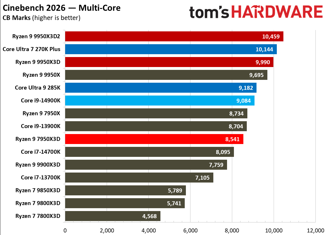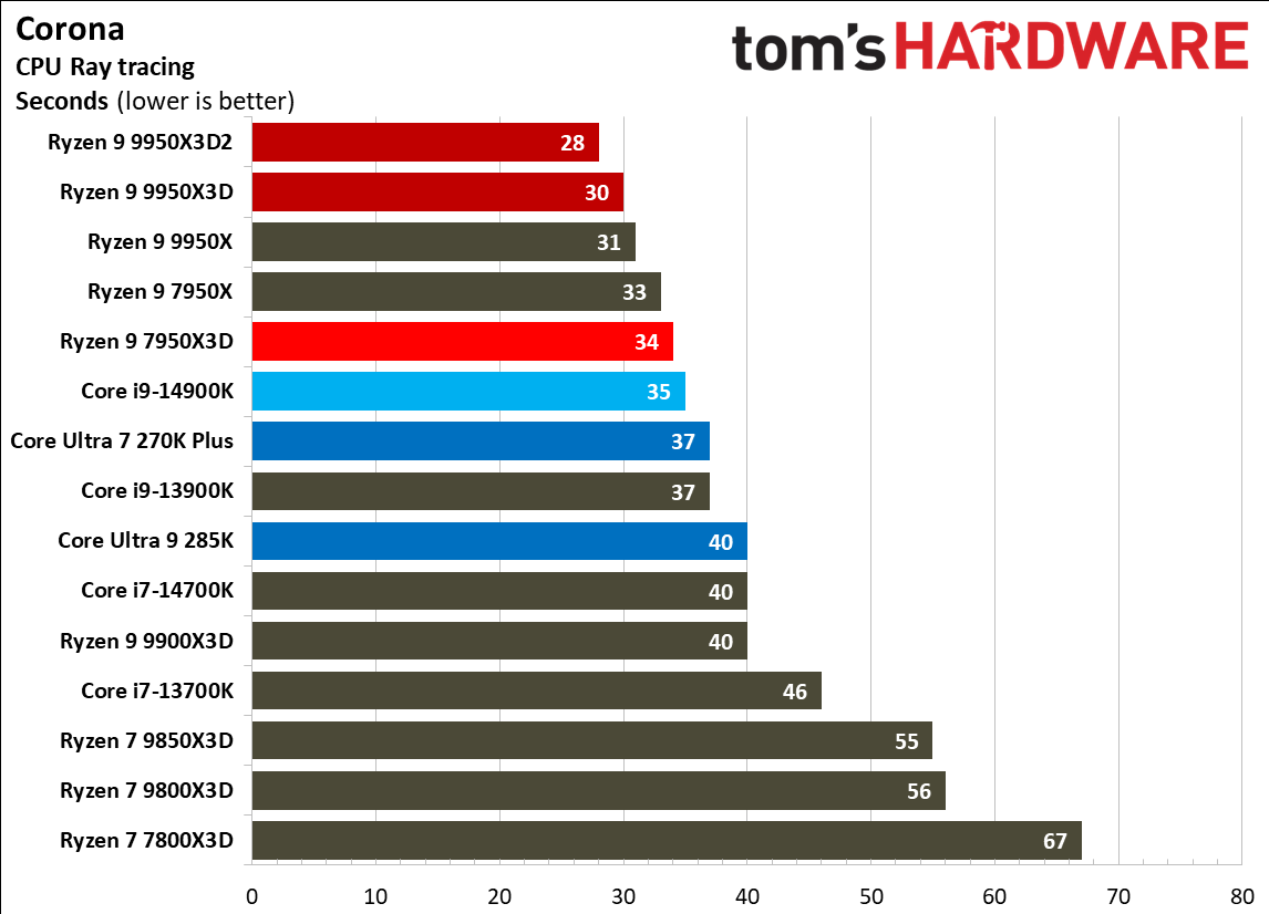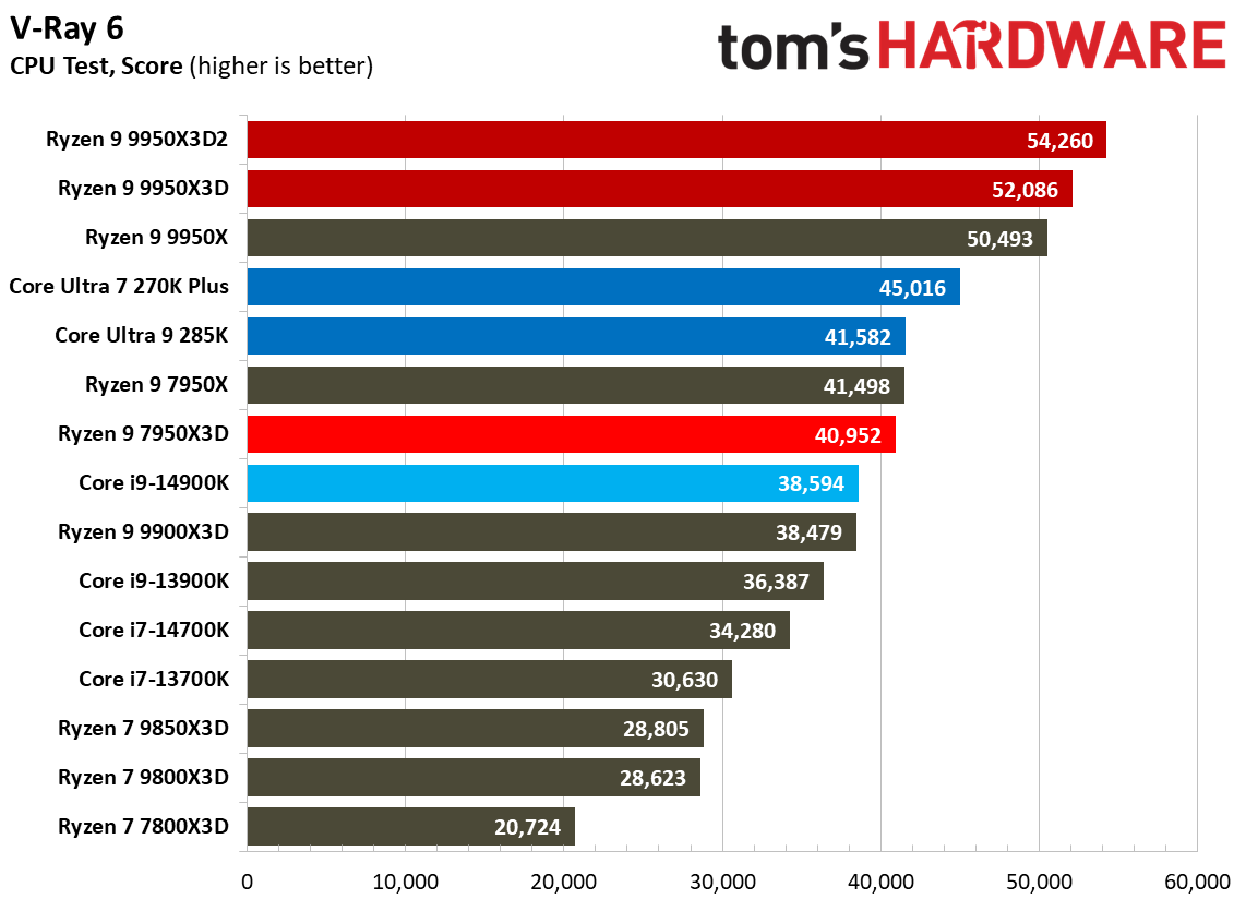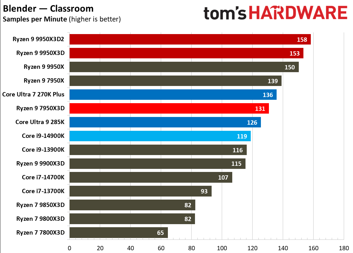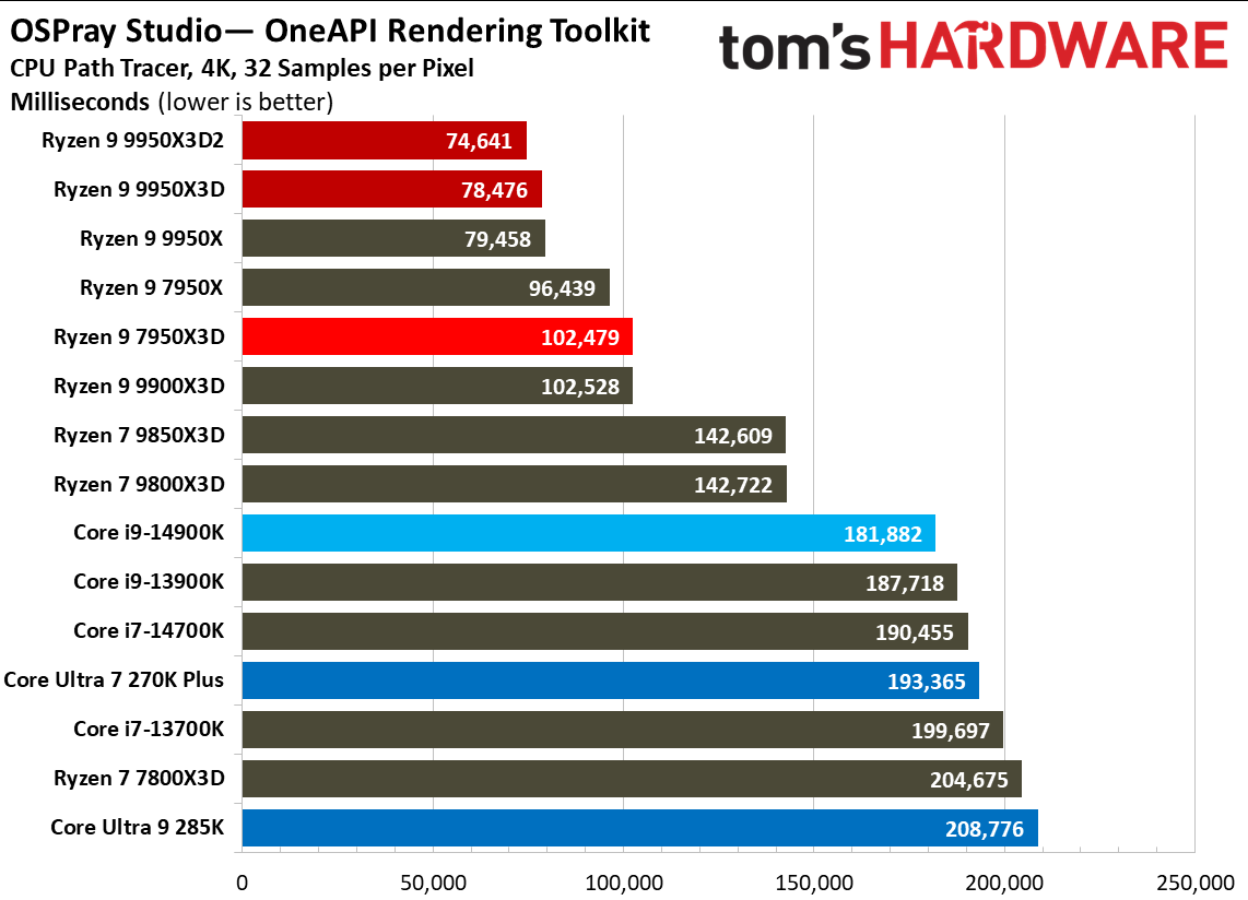 Источник изображений: Tom's Hardware В составе Ryzen 9 9950X3D2 Dual Edition используются 16 ядер Zen 5 с поддержкой 32 потоков. Для процессора заявлена Boost-частота до 5,6 ГГц (на 100 МГц ниже, чем у модели Ryzen 9 9950X3D), наличие 192 Мбайт кеш-памяти L3 и номинальный показатель TDP 200 Вт. Общий объём кеш-памяти процессора (включая L2) составляет 208 Мбайт. Большого объёма кеш-памяти L3 компания AMD достигла за счёт использования двух кристаллов дополнительной кеш-памяти 3D V-Cache. Обычный Ryzen 9 9950X3D оснащён одним кристаллом 3D V-Cache. Портал Tom’s Hardware пишет, что в многопоточных задачах AMD снова превзошла саму себя, но незначительно. Новый Ryzen 9 9950X3D2 почти на 4 % быстрее, чем Ryzen 9 9950X3D с одним кристаллом дополнительной кеш-памяти 3D V-Cache, и на 7,4 % быстрее, чем обычный Ryzen 9 9950X без 3D V-Cache. Новый чип AMD также быстрее, чем недавний Core Ultra 7 270K Plus, но при этом всего на 9 %, хотя стоит в три раза дороже. Примечательно, что в однопоточных задачах наблюдается небольшое снижение производительности, что объясняется несколько более низкими пиковыми тактовыми частотами Ryzen 9 9950X3D2. В рейтинге Tom’s Hardware по однопоточной производительности лидируют процессоры Intel, занимая первые три верхние строчки. На первом месте находится Core Ultra 7 270K Plus, на втором — Core Ultra 9 285K, на третьем — Core i9-14900K. Новый чип AMD находится ближе к середине списка, ниже Ryzen 7 9850X3D, значительно прибавившего за счёт увеличения тактовой частоты. В задачах рендеринга Ryzen 9 9950X3D2 стабильно опережает Ryzen 9 9950X3D примерно на 5 %. В Cinebench 2024 версия чипа с двойным кешем опережает обычный Ryzen 9 9950X3D на 4 % в многопоточном тесте и на 1,7 % — в однопоточном. AMD заявляет о значительном превосходстве Ryzen 9 9950X3D2 в других приложениях, особенно в Blender. На практике же Ryzen 9 9950X3D2 опережает модель 9950X3D на 3–4 % в зависимости от сцены. По сравнению с 270K Plus Ryzen 9 9950X3D2 быстрее на 13–18 %. В бенчмарках с трассировкой лучей и путей Ryzen 9 9950X3D2 также демонстрирует преимущество: он на 4 % быстрее, чем Ryzen 9 9950X3D, в V-Ray 6 и на 5 % быстрее в OSPRay Studio. Производительность в продуктивных приложениях и бенчмарках