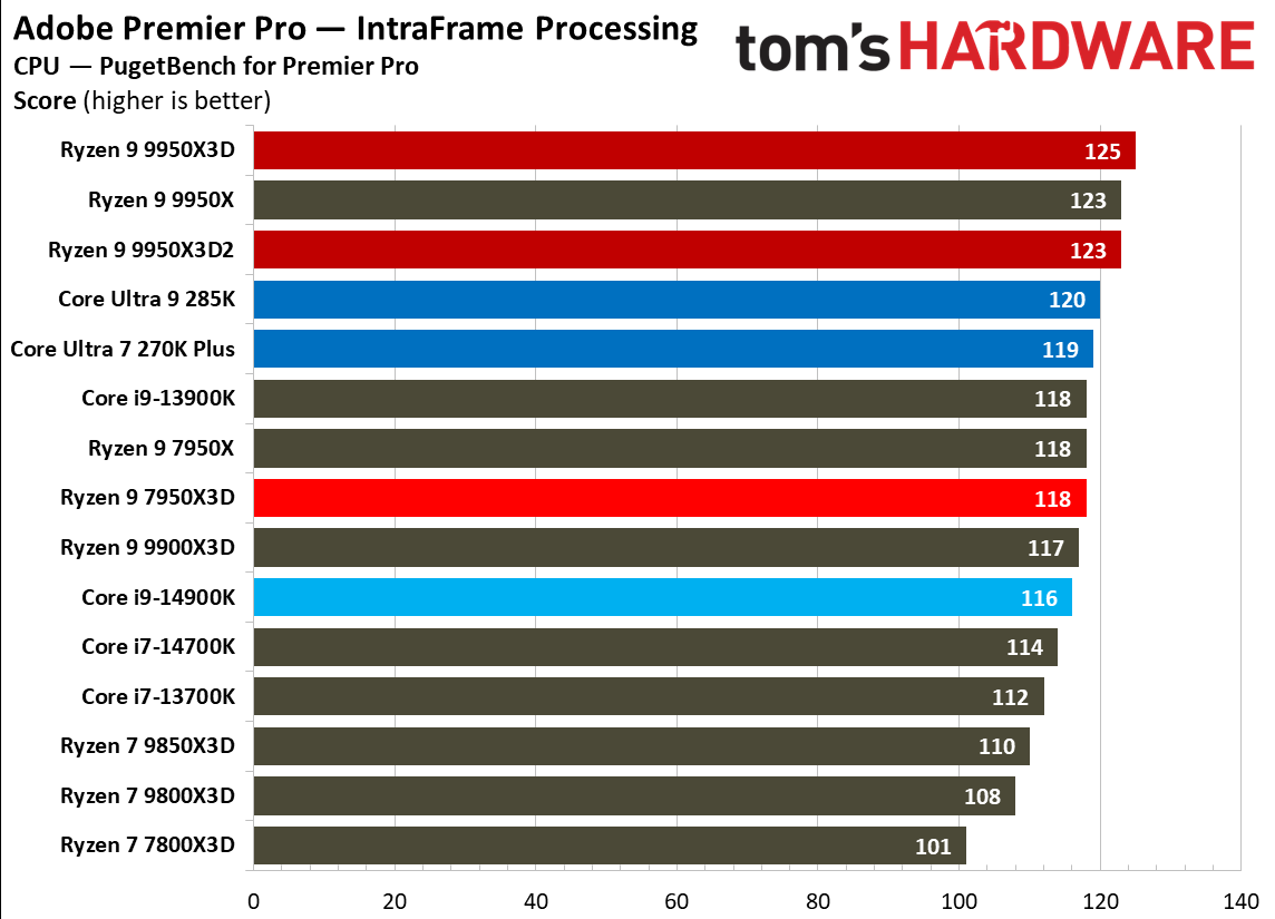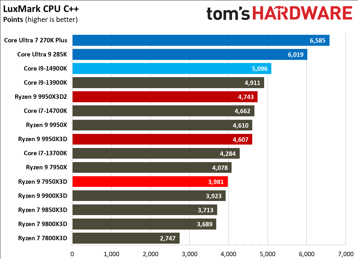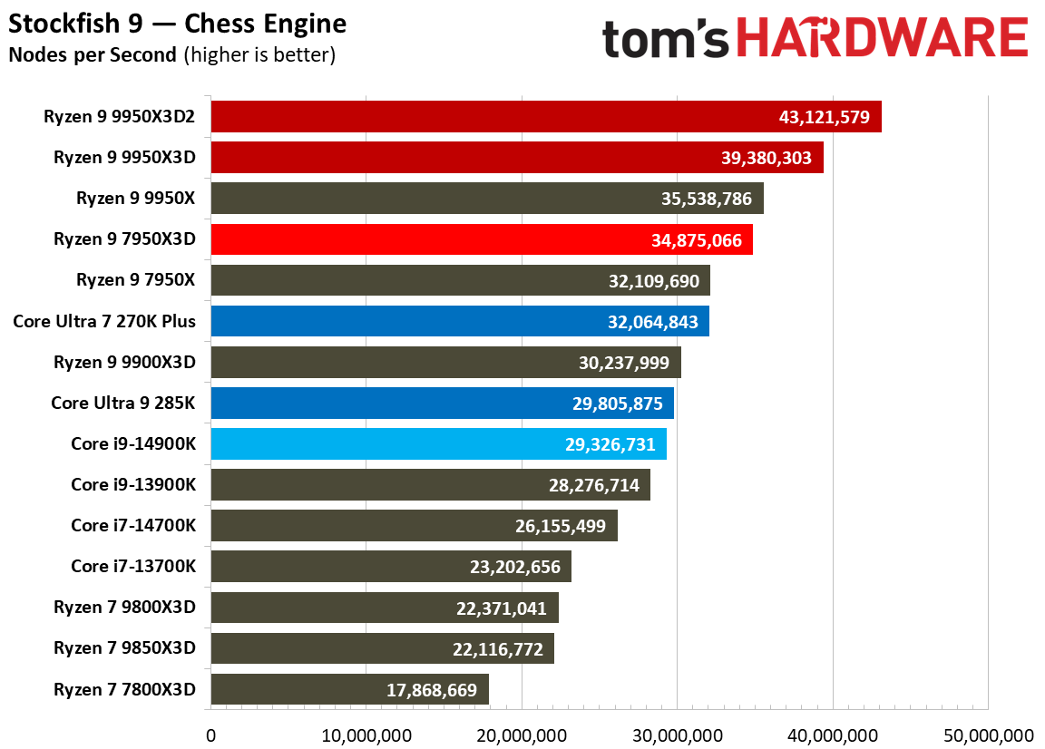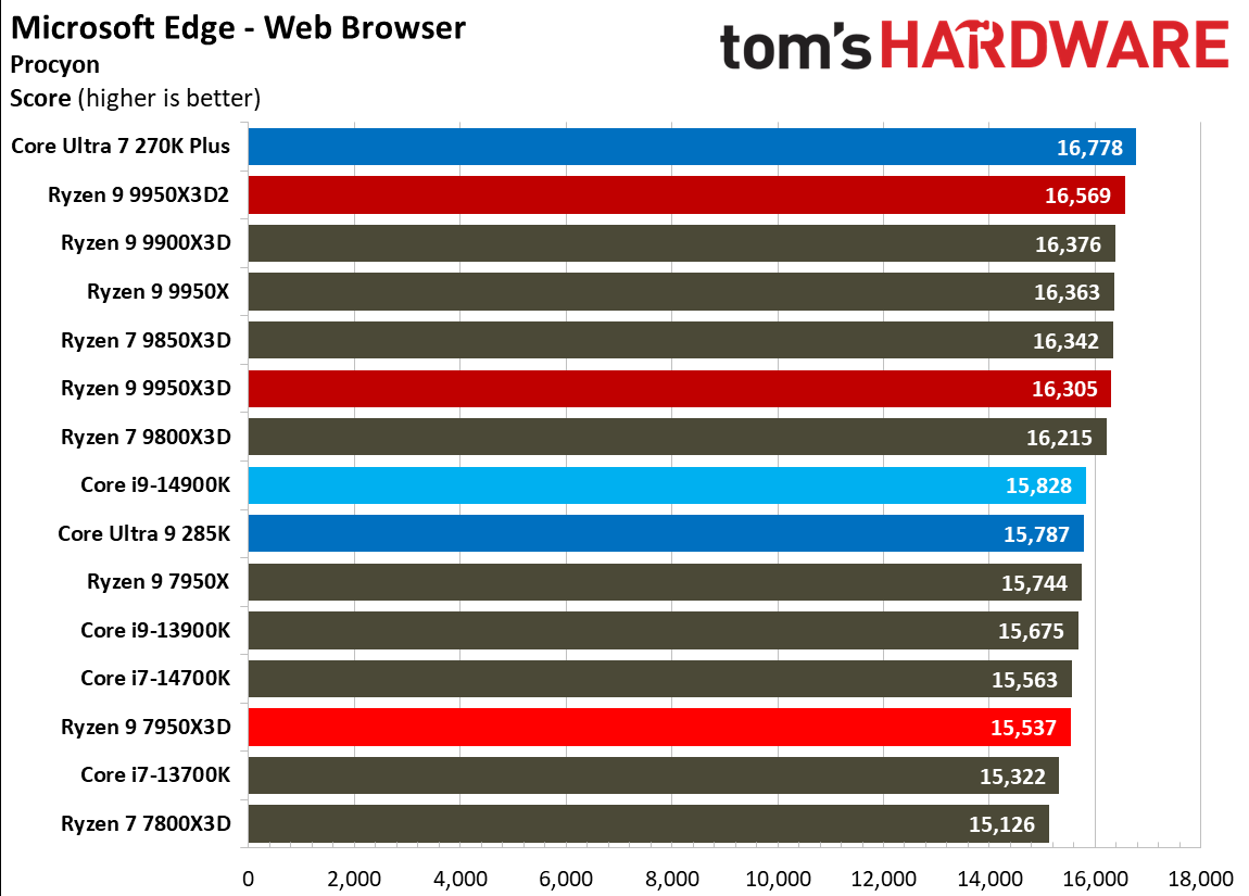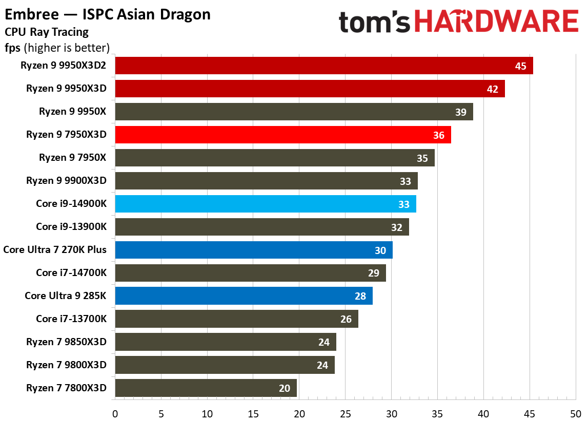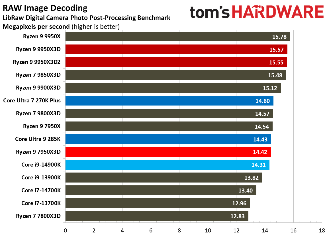 Источник изображений: Tom's Hardware В составе Ryzen 9 9950X3D2 Dual Edition используются 16 ядер Zen 5 с поддержкой 32 потоков. Для процессора заявлена Boost-частота до 5,6 ГГц (на 100 МГц ниже, чем у модели Ryzen 9 9950X3D), наличие 192 Мбайт кеш-памяти L3 и номинальный показатель TDP 200 Вт. Общий объём кеш-памяти процессора (включая L2) составляет 208 Мбайт. Большого объёма кеш-памяти L3 компания AMD достигла за счёт использования двух кристаллов дополнительной кеш-памяти 3D V-Cache. Обычный Ryzen 9 9950X3D оснащён одним кристаллом 3D V-Cache. Портал Tom’s Hardware пишет, что в многопоточных задачах AMD снова превзошла саму себя, но незначительно. Новый Ryzen 9 9950X3D2 почти на 4 % быстрее, чем Ryzen 9 9950X3D с одним кристаллом дополнительной кеш-памяти 3D V-Cache, и на 7,4 % быстрее, чем обычный Ryzen 9 9950X без 3D V-Cache. Новый чип AMD также быстрее, чем недавний Core Ultra 7 270K Plus, но при этом всего на 9 %, хотя стоит в три раза дороже. Примечательно, что в однопоточных задачах наблюдается небольшое снижение производительности, что объясняется несколько более низкими пиковыми тактовыми частотами Ryzen 9 9950X3D2. В рейтинге Tom’s Hardware по однопоточной производительности лидируют процессоры Intel, занимая первые три верхние строчки. На первом месте находится Core Ultra 7 270K Plus, на втором — Core Ultra 9 285K, на третьем — Core i9-14900K. Новый чип AMD находится ближе к середине списка, ниже Ryzen 7 9850X3D, значительно прибавившего за счёт увеличения тактовой частоты. В задачах рендеринга Ryzen 9 9950X3D2 стабильно опережает Ryzen 9 9950X3D примерно на 5 %. В Cinebench 2024 версия чипа с двойным кешем опережает обычный Ryzen 9 9950X3D на 4 % в многопоточном тесте и на 1,7 % — в однопоточном. AMD заявляет о значительном превосходстве Ryzen 9 9950X3D2 в других приложениях, особенно в Blender. На практике же Ryzen 9 9950X3D2 опережает модель 9950X3D на 3–4 % в зависимости от сцены. По сравнению с 270K Plus Ryzen 9 9950X3D2 быстрее на 13–18 %. В бенчмарках с трассировкой лучей и путей Ryzen 9 9950X3D2 также демонстрирует преимущество: он на 4 % быстрее, чем Ryzen 9 9950X3D, в V-Ray 6 и на 5 % быстрее в OSPRay Studio. Производительность в продуктивных приложениях и бенчмарках