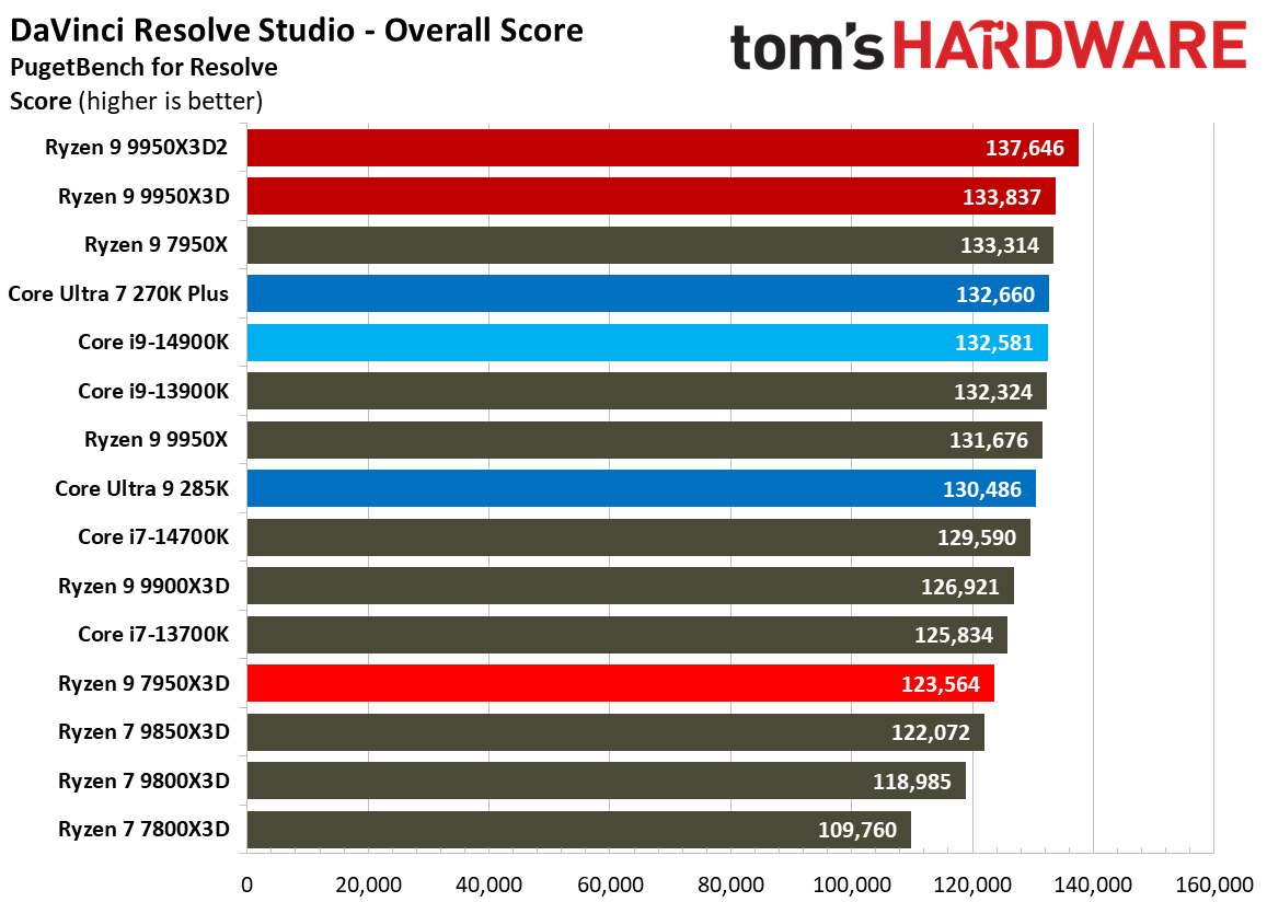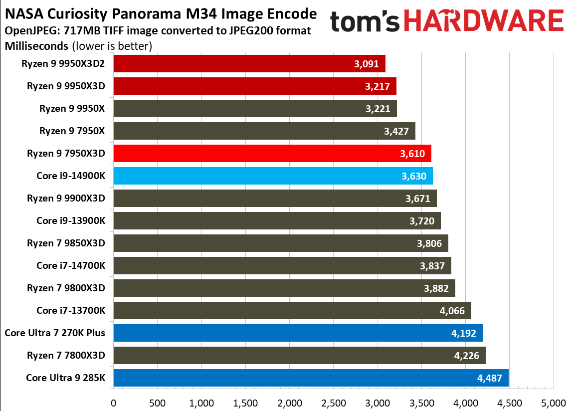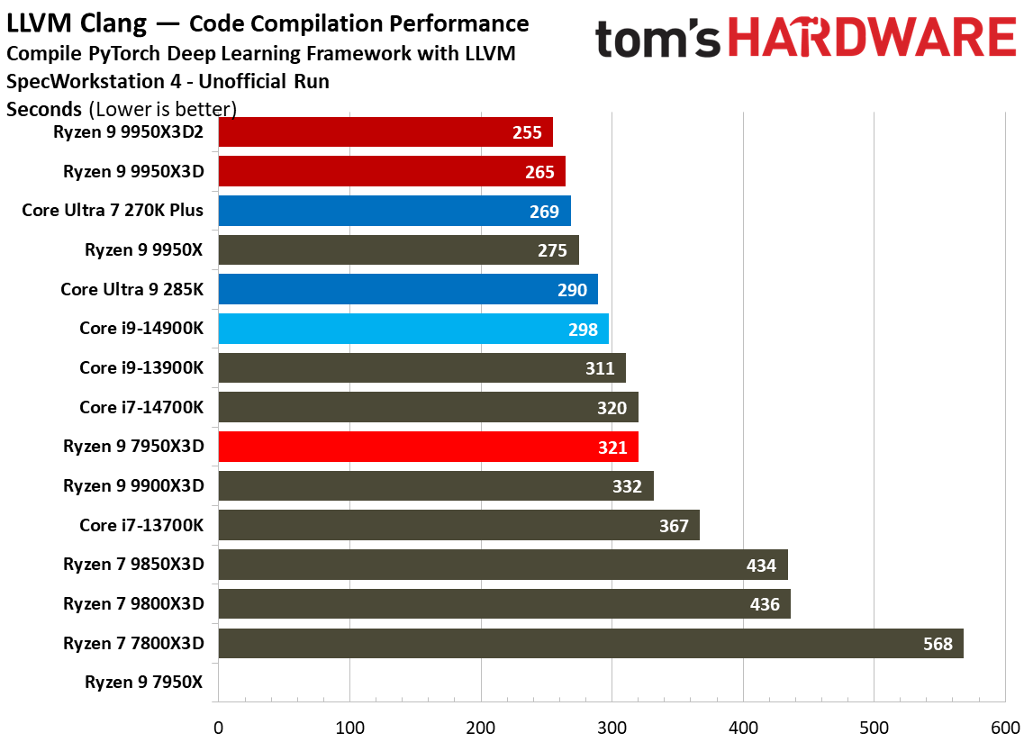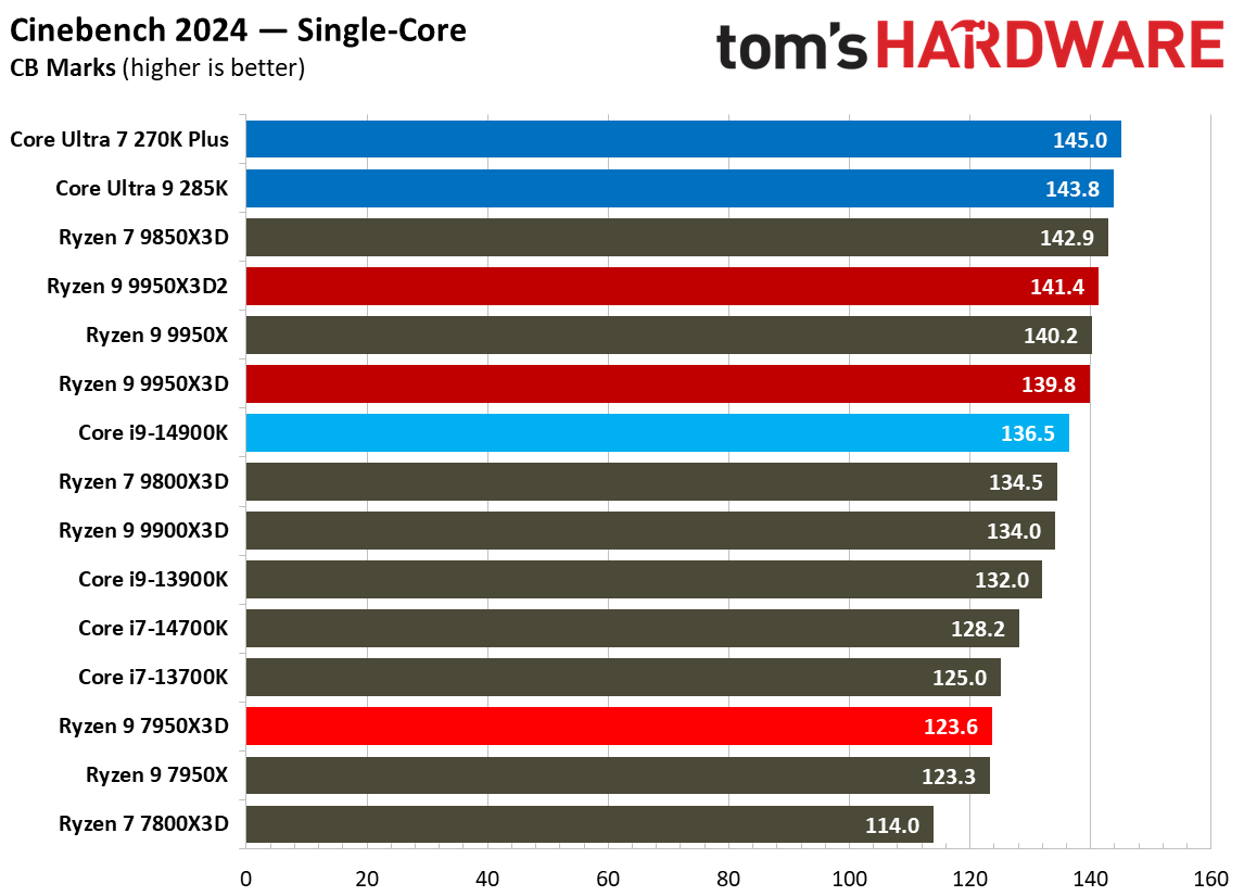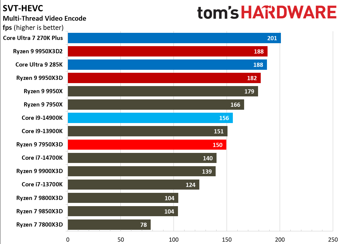 Источник изображений: Tom's Hardware В составе Ryzen 9 9950X3D2 Dual Edition используются 16 ядер Zen 5 с поддержкой 32 потоков. Для процессора заявлена Boost-частота до 5,6 ГГц (на 100 МГц ниже, чем у модели Ryzen 9 9950X3D), наличие 192 Мбайт кеш-памяти L3 и номинальный показатель TDP 200 Вт. Общий объём кеш-памяти процессора (включая L2) составляет 208 Мбайт. Большого объёма кеш-памяти L3 компания AMD достигла за счёт использования двух кристаллов дополнительной кеш-памяти 3D V-Cache. Обычный Ryzen 9 9950X3D оснащён одним кристаллом 3D V-Cache. Портал Tom’s Hardware пишет, что в многопоточных задачах AMD снова превзошла саму себя, но незначительно. Новый Ryzen 9 9950X3D2 почти на 4 % быстрее, чем Ryzen 9 9950X3D с одним кристаллом дополнительной кеш-памяти 3D V-Cache, и на 7,4 % быстрее, чем обычный Ryzen 9 9950X без 3D V-Cache. Новый чип AMD также быстрее, чем недавний Core Ultra 7 270K Plus, но при этом всего на 9 %, хотя стоит в три раза дороже. Примечательно, что в однопоточных задачах наблюдается небольшое снижение производительности, что объясняется несколько более низкими пиковыми тактовыми частотами Ryzen 9 9950X3D2. В рейтинге Tom’s Hardware по однопоточной производительности лидируют процессоры Intel, занимая первые три верхние строчки. На первом месте находится Core Ultra 7 270K Plus, на втором — Core Ultra 9 285K, на третьем — Core i9-14900K. Новый чип AMD находится ближе к середине списка, ниже Ryzen 7 9850X3D, значительно прибавившего за счёт увеличения тактовой частоты. В задачах рендеринга Ryzen 9 9950X3D2 стабильно опережает Ryzen 9 9950X3D примерно на 5 %. В Cinebench 2024 версия чипа с двойным кешем опережает обычный Ryzen 9 9950X3D на 4 % в многопоточном тесте и на 1,7 % — в однопоточном. AMD заявляет о значительном превосходстве Ryzen 9 9950X3D2 в других приложениях, особенно в Blender. На практике же Ryzen 9 9950X3D2 опережает модель 9950X3D на 3–4 % в зависимости от сцены. По сравнению с 270K Plus Ryzen 9 9950X3D2 быстрее на 13–18 %. В бенчмарках с трассировкой лучей и путей Ryzen 9 9950X3D2 также демонстрирует преимущество: он на 4 % быстрее, чем Ryzen 9 9950X3D, в V-Ray 6 и на 5 % быстрее в OSPRay Studio. Производительность в продуктивных приложениях и бенчмарках
