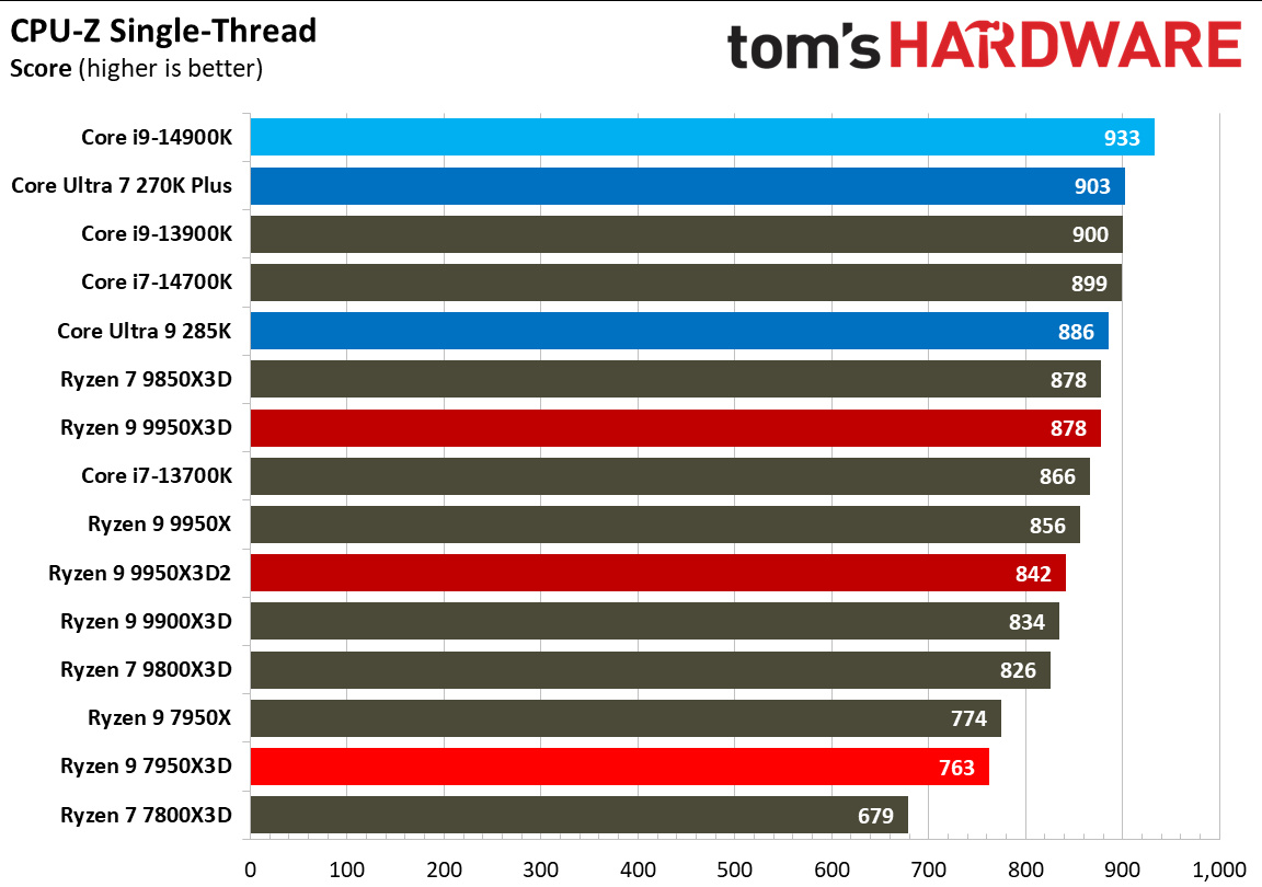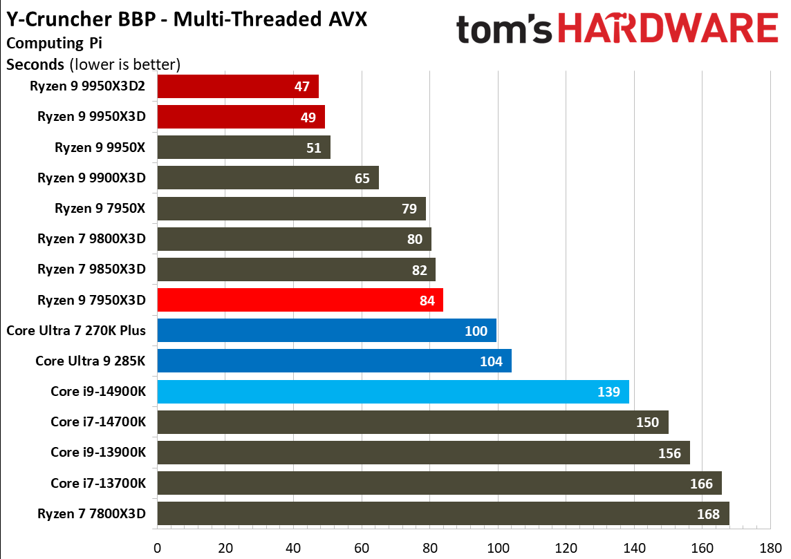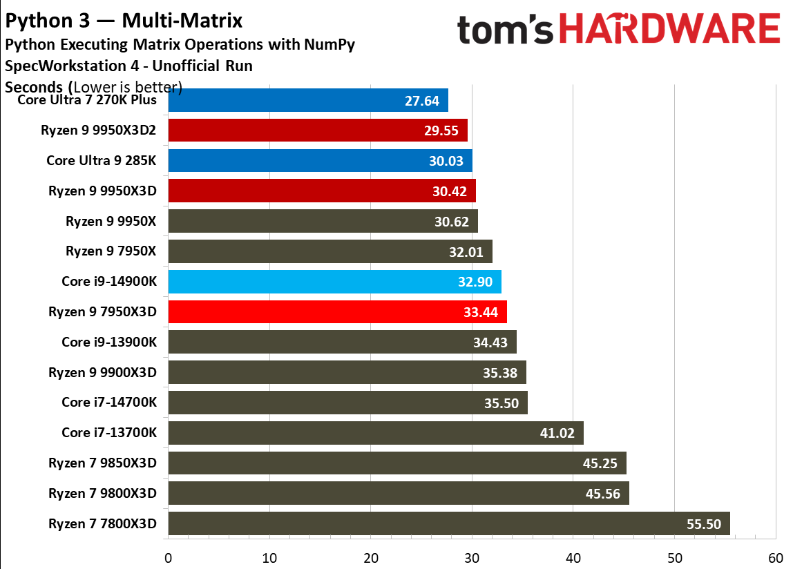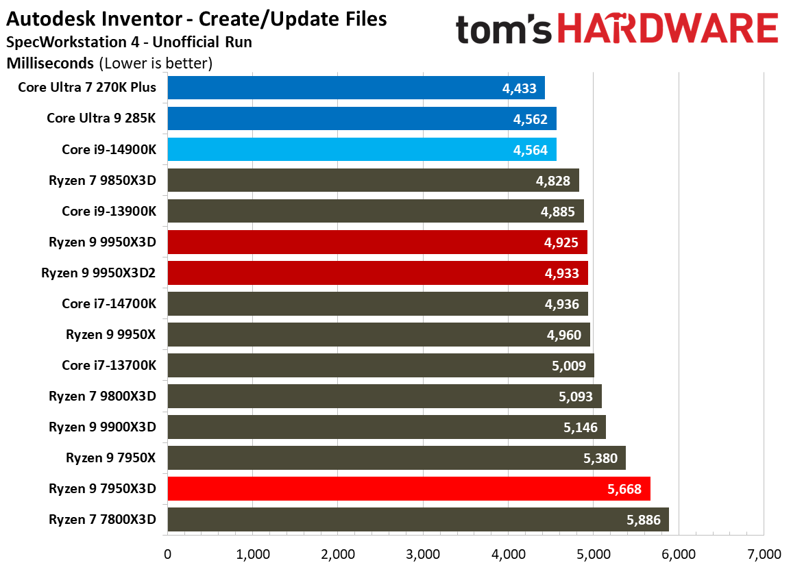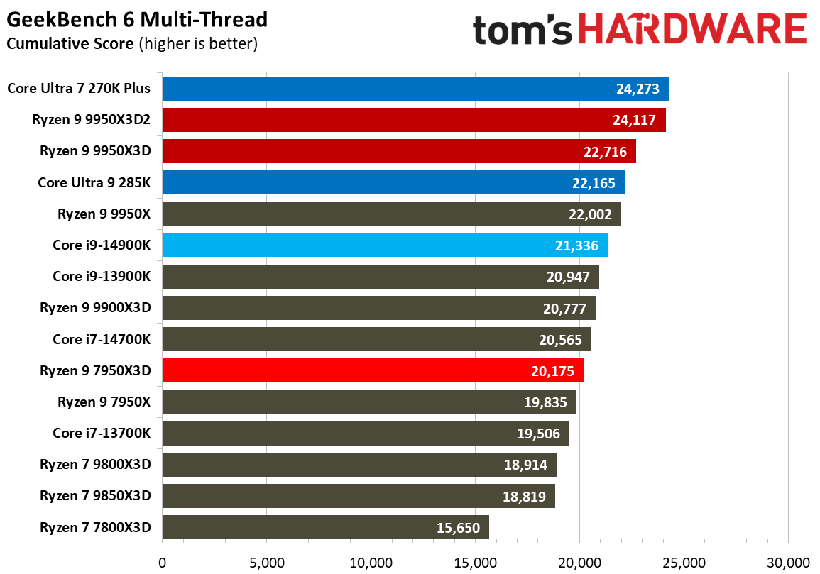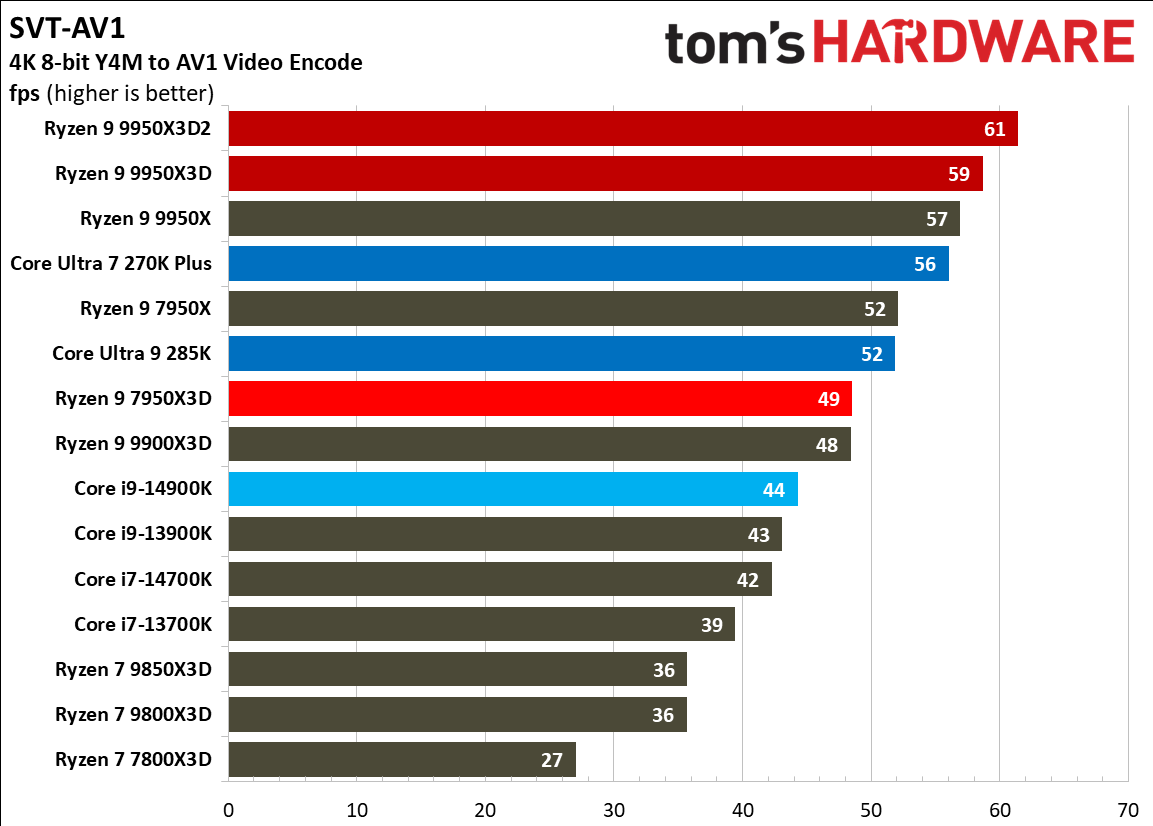 Источник изображений: Tom's Hardware В составе Ryzen 9 9950X3D2 Dual Edition используются 16 ядер Zen 5 с поддержкой 32 потоков. Для процессора заявлена Boost-частота до 5,6 ГГц (на 100 МГц ниже, чем у модели Ryzen 9 9950X3D), наличие 192 Мбайт кеш-памяти L3 и номинальный показатель TDP 200 Вт. Общий объём кеш-памяти процессора (включая L2) составляет 208 Мбайт. Большого объёма кеш-памяти L3 компания AMD достигла за счёт использования двух кристаллов дополнительной кеш-памяти 3D V-Cache. Обычный Ryzen 9 9950X3D оснащён одним кристаллом 3D V-Cache. Портал Tom’s Hardware пишет, что в многопоточных задачах AMD снова превзошла саму себя, но незначительно. Новый Ryzen 9 9950X3D2 почти на 4 % быстрее, чем Ryzen 9 9950X3D с одним кристаллом дополнительной кеш-памяти 3D V-Cache, и на 7,4 % быстрее, чем обычный Ryzen 9 9950X без 3D V-Cache. Новый чип AMD также быстрее, чем недавний Core Ultra 7 270K Plus, но при этом всего на 9 %, хотя стоит в три раза дороже. Примечательно, что в однопоточных задачах наблюдается небольшое снижение производительности, что объясняется несколько более низкими пиковыми тактовыми частотами Ryzen 9 9950X3D2. В рейтинге Tom’s Hardware по однопоточной производительности лидируют процессоры Intel, занимая первые три верхние строчки. На первом месте находится Core Ultra 7 270K Plus, на втором — Core Ultra 9 285K, на третьем — Core i9-14900K. Новый чип AMD находится ближе к середине списка, ниже Ryzen 7 9850X3D, значительно прибавившего за счёт увеличения тактовой частоты. В задачах рендеринга Ryzen 9 9950X3D2 стабильно опережает Ryzen 9 9950X3D примерно на 5 %. В Cinebench 2024 версия чипа с двойным кешем опережает обычный Ryzen 9 9950X3D на 4 % в многопоточном тесте и на 1,7 % — в однопоточном. AMD заявляет о значительном превосходстве Ryzen 9 9950X3D2 в других приложениях, особенно в Blender. На практике же Ryzen 9 9950X3D2 опережает модель 9950X3D на 3–4 % в зависимости от сцены. По сравнению с 270K Plus Ryzen 9 9950X3D2 быстрее на 13–18 %. В бенчмарках с трассировкой лучей и путей Ryzen 9 9950X3D2 также демонстрирует преимущество: он на 4 % быстрее, чем Ryzen 9 9950X3D, в V-Ray 6 и на 5 % быстрее в OSPRay Studio. Производительность в продуктивных приложениях и бенчмарках