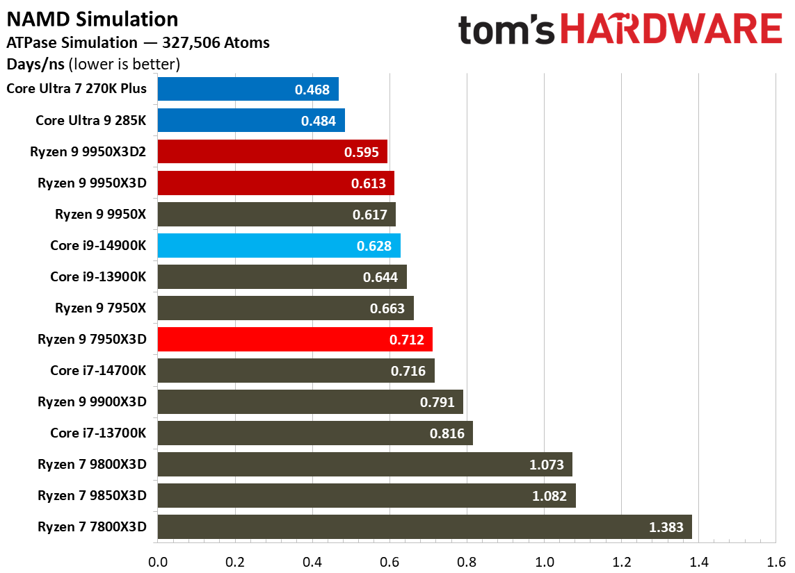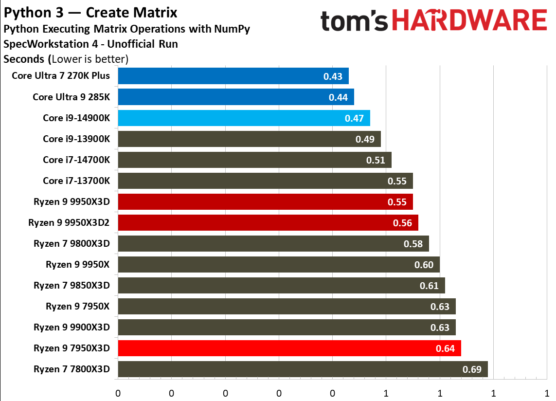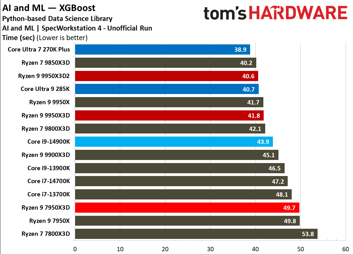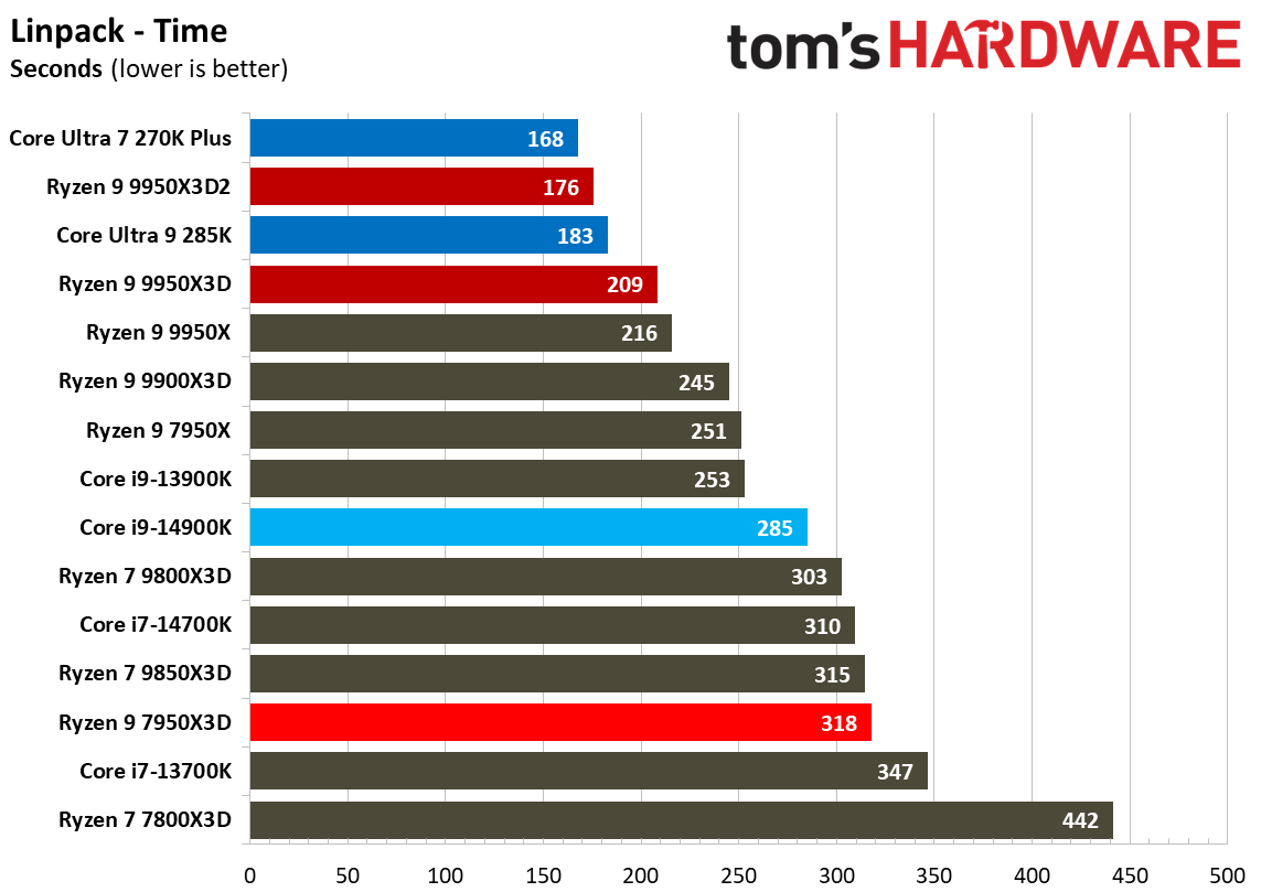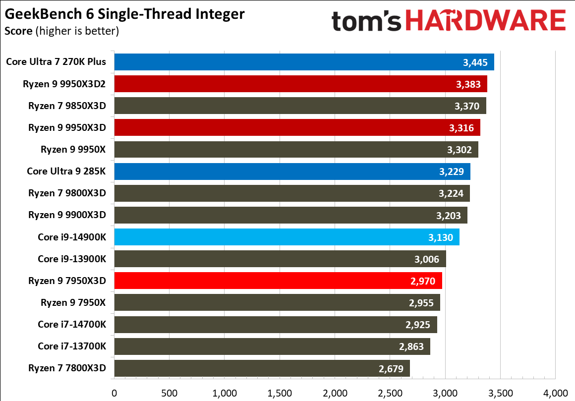 Источник изображений: Tom's Hardware В составе Ryzen 9 9950X3D2 Dual Edition используются 16 ядер Zen 5 с поддержкой 32 потоков. Для процессора заявлена Boost-частота до 5,6 ГГц (на 100 МГц ниже, чем у модели Ryzen 9 9950X3D), наличие 192 Мбайт кеш-памяти L3 и номинальный показатель TDP 200 Вт. Общий объём кеш-памяти процессора (включая L2) составляет 208 Мбайт. Большого объёма кеш-памяти L3 компания AMD достигла за счёт использования двух кристаллов дополнительной кеш-памяти 3D V-Cache. Обычный Ryzen 9 9950X3D оснащён одним кристаллом 3D V-Cache. Портал Tom’s Hardware пишет, что в многопоточных задачах AMD снова превзошла саму себя, но незначительно. Новый Ryzen 9 9950X3D2 почти на 4 % быстрее, чем Ryzen 9 9950X3D с одним кристаллом дополнительной кеш-памяти 3D V-Cache, и на 7,4 % быстрее, чем обычный Ryzen 9 9950X без 3D V-Cache. Новый чип AMD также быстрее, чем недавний Core Ultra 7 270K Plus, но при этом всего на 9 %, хотя стоит в три раза дороже. Примечательно, что в однопоточных задачах наблюдается небольшое снижение производительности, что объясняется несколько более низкими пиковыми тактовыми частотами Ryzen 9 9950X3D2. В рейтинге Tom’s Hardware по однопоточной производительности лидируют процессоры Intel, занимая первые три верхние строчки. На первом месте находится Core Ultra 7 270K Plus, на втором — Core Ultra 9 285K, на третьем — Core i9-14900K. Новый чип AMD находится ближе к середине списка, ниже Ryzen 7 9850X3D, значительно прибавившего за счёт увеличения тактовой частоты. В задачах рендеринга Ryzen 9 9950X3D2 стабильно опережает Ryzen 9 9950X3D примерно на 5 %. В Cinebench 2024 версия чипа с двойным кешем опережает обычный Ryzen 9 9950X3D на 4 % в многопоточном тесте и на 1,7 % — в однопоточном. AMD заявляет о значительном превосходстве Ryzen 9 9950X3D2 в других приложениях, особенно в Blender. На практике же Ryzen 9 9950X3D2 опережает модель 9950X3D на 3–4 % в зависимости от сцены. По сравнению с 270K Plus Ryzen 9 9950X3D2 быстрее на 13–18 %. В бенчмарках с трассировкой лучей и путей Ryzen 9 9950X3D2 также демонстрирует преимущество: он на 4 % быстрее, чем Ryzen 9 9950X3D, в V-Ray 6 и на 5 % быстрее в OSPRay Studio. Производительность в продуктивных приложениях и бенчмарках