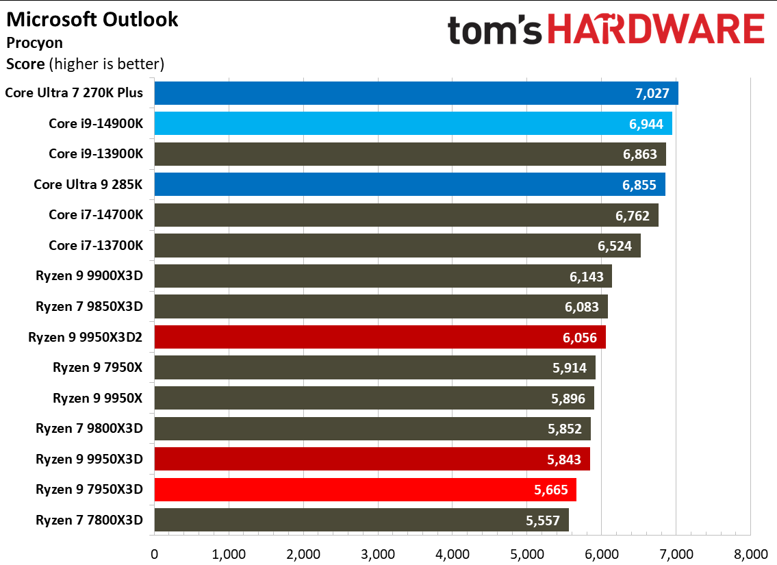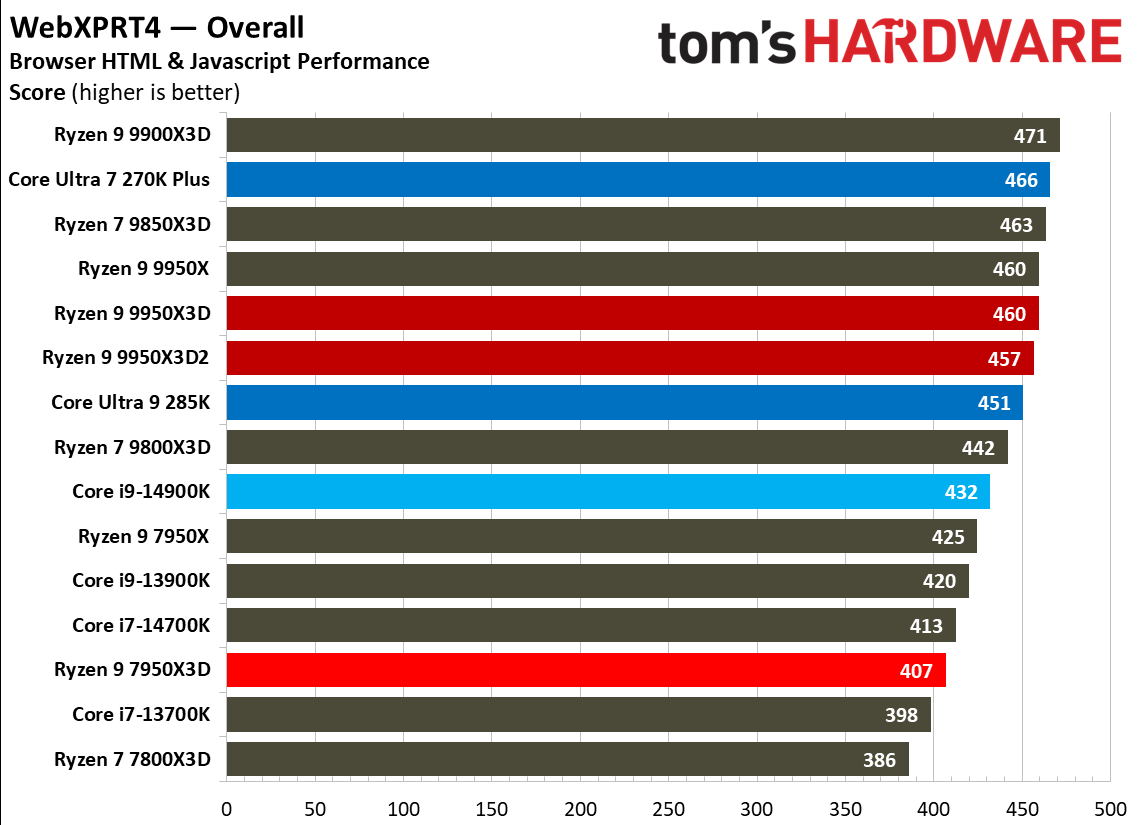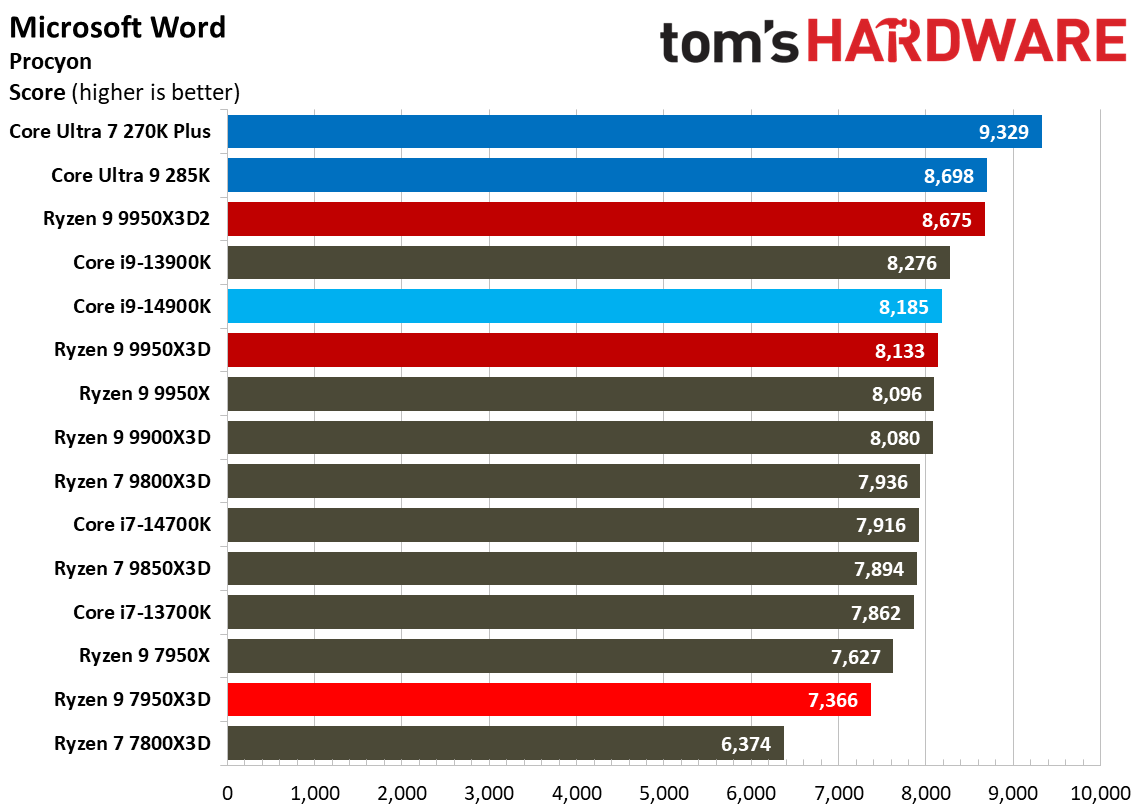Производительность в играх (720p) Tom’s Hardware в свою очередь заявляет, что совокупные результаты Core Ultra 7 270K Plus в разрешении 1080p говорят о том, что новинка не обогнала Core i9-14900K. Intel утверждает, что Core Ultra 7 270K Plus отстаёт от Ryzen 7 9800X3D всего на 10 % и быстрее, чем Core Ultra 7 265K, на 15 %. Результаты Tom’s Hardware отличаются. В 17 игровых тестах 270K Plus оказался на 20 % медленнее, чем Ryzen 7 9800X3D, и на 10 % быстрее, чем 265K. Игровые тесты от Computer Base