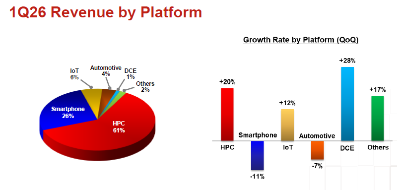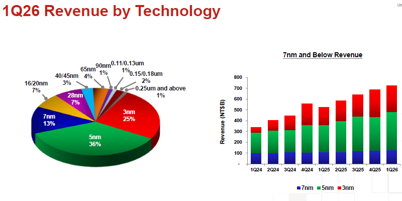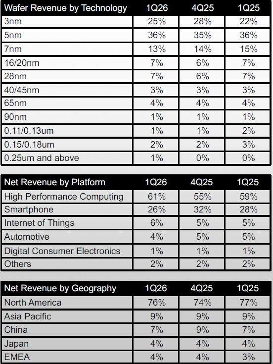 Источник изображений: TSMC Выручка TSMC, её норма прибыли и норма операционной прибыли оказались выше собственных ожиданий компании. При этом в натуральном выражении количество обработанных за квартал кремниевых пластин, отгруженных клиентам, выросло в годовом сравнении на 28,1 %. В долларовом выражении выручка TSMC выросла даже сильнее, чем в национальной валюте Тайваня — на 40,6 % вместо 35,1 %. Норма прибыли увеличилась с 58,8 до 66,2 %. Всё это говорит о том, что цены на услуги и продукцию TSMC растут опережающими темпами, и для бума ИИ с его дефицитом компонентов это уже привычно. Кроме того, TSMC отмечает улучшение структуры затрат и рост степени загрузки собственных предприятий. ![]() TSMC уже давно обеспечивает до трёх четвертей своей выручки оказанием услуг по выпуску чипов с использованием передовых литографических норм — от 3 до 7 нм включительно. В прошлом квартале доля 3-нм продукции в выручке TSMC последовательно опустилась с 28 до 25 %, а вот 5-нм техпроцесс в среднесрочной ретроспективе удерживает позиции, обеспечивая 36 % всей выручки компании. Сдаёт позиции 7-нм техпроцесс, доля которого сократилась до 13 % как последовательно, так и в годовом сравнении, пусть всего и на один процентный пункт в каждом из случаев. Так или иначе, все три поколения передовой литографии в первом квартале обеспечивали 74 % выручки TSMC. ![]() По сегментам рынка лидерство предсказуемо сохраняется за высокопроизводительными вычислениями (HPC), которые обеспечили 61 % всей выручки TSMC против 59 % годом ранее. Смартфоны просели как последовательно, с 32 до 26 %, так и год к году (с 28 %), но это можно объяснить ростом цен на память, который сокращает спрос на смартфоны. Если доля Интернета вещей выросла с 5 до 6 %, то автомобильный сегмент просел с 5 до 4 %. Потребительская электроника хоть и обеспечила лишь 1 % выручки TSMC в минувшем квартале, последовательно увеличила профильную выручку на 28 %. Лидирующий сегмент HPC прибавил в выручке 20 % по сравнению с четвёртым кварталом прошлого года, а вот смартфоны просели на 11 %. Автомобильная электроника тоже сократила свою выручку на 7 %, но Интернет вещей прибавил 12 %. От влияния кризиса на рынке смартфонов TSMC защищена больше конкурентов, поскольку обслуживает преимущественно дорогой сегмент. ![]() В географическом срезе 76 % выручки TSMC приходилось на Северную Америку, но существенных изменений в расстановке сил между макрорегионами на наблюдалось. Азиатско-Тихоокеанский регион удерживал стабильные 9 % выручки TSMC, Китай довольствовался 7 %, а Япония 4 %, как и страны Европы, Ближнего Востока и Африки. Капитальные расходы TSMC в первом квартале составили $11,1 млрд, лишь слегка уступив показателю четвёртого квартала прошлого года. В целом по итогам текущего года капитальные затраты могут вырасти на 37 % до диапазона от $52 до $56 млрд. В текущем квартале компания рассчитывает выручить от $39 до $40,2 млрд, это выше предыдущего диапазона, заложенного в прогноз, а также на 32 % больше результата аналогичного периода предыдущего года. Влияния назревающего энергетического кризиса на собственный бизнес TSMC в обозримой перспективе не ожидает, но подчёркивает, что при затяжном характере конфликта может пострадать прибыльность компании. Успехи первого квартала позволили руководству компании поднять прогноз по росту выручки в текущем году до более чем 30 %. Ранее считалось, что рост в