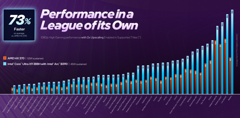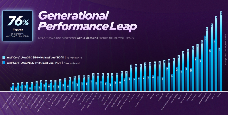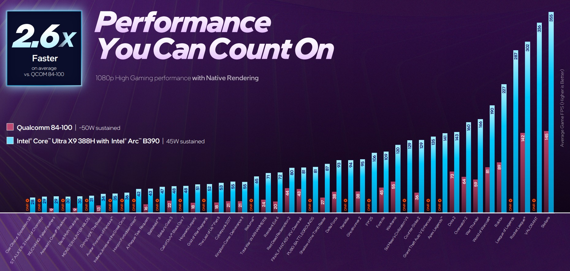 Сегодня ночью компания Intel представила мобильные процессоры нового поколения — Core Ultra 300, также известные как Panther Lake. Вместе с ними была представлена и новейшая флагманская встроенная графика Intel — Arc B390, которая обещает производительность уровня дискретной графики. Intel Arc B390 построена на 12 ядрах Xe, предлагая 96 XMX-движков и 12 блоков ускорения трассировки лучей; дополняют их 16 Мбайт кеша второго уровня. Графика обладает тактовой частотой до 2,5 ГГц, что обеспечивает пиковую производительность 122 TOPS в операциях INT8. Такой встроенной графикой оснащены лишь процессоры Core Ultra X7 358H, Core Ultra X7 368H и Core Ultra X9 388H. Для сравнения, встроенная графика большинства остальных процессоров семейства Panther Lake располагает только четырьмя ядрами Xe. Что касается производительности, то Intel заявляет о значительном превосходстве Arc B390 над флагманской встроенной графикой AMD в лице Radeon 890M, которая используется в старших моделях мобильных процессоров Ryzen AI 300-й и 400-й серий. Здесь стоит отметить, что у AMD есть и более мощная встроенная мобильная графика — в чипах Ryzen AI Max+, которые могут использоваться в ноутбуках, применяется значительно более производительный графический процессор Radeon 8060S. Однако формально это решения несколько другого класса, чем новые чипы Intel. Как бы то ни было, Intel отмечает, что Arc B390 по производительности превосходит графический процессор Arc 140T, который до недавнего времени носил звание самой мощной «встройки» Intel, в среднем на 76 %. По сравнению с Radeon 890M среднее превосходство составляет 73 % при использовании технологий масштабирования изображения и до 82 % при рендеринге без таковых ухищрений. Также Intel утверждает о превосходстве в 2,6 раза над графикой процессоров Qualcomm X первого поколения. Наконец, компания заявляет, что её новый графический процессор способен на равных конкурировать с дискретной видеокартой Nvidia GeForce RTX 4050. Кроме того, Intel отметила, что Arc B390 станет первым встроенным GPU с поддержкой ИИ-генерации нескольких дополнительных кадров (до трёх) для каждого отрендеренного кадра через Intel XeSS 3 с помощью XeSS-MFG. При этом компания обещает высокое качество изображения и плавность. Intel также подтвердила сообщения о том, что разрабатывает специальную версию своих процессоров для портативных игровых приставок. Эти чипы не будут использовать полнофункциональный графический процессор B390, а предложат упрощённую версию — вероятно, B380 — с меньшим количеством ядер. Также у них может быть меньше процессорных ядер CPU для повышения энергоэффективности. Такие компании, как Acer, MSI и GPD, уже работают вместе с Intel над ранними версиями подобных чипов. Вероятно, у AMD Ryzen Z2 Extreme появится реальный конкурент. Intel подыскала себе нишу на рынке ИИ-чипов, захваченном Nvidia